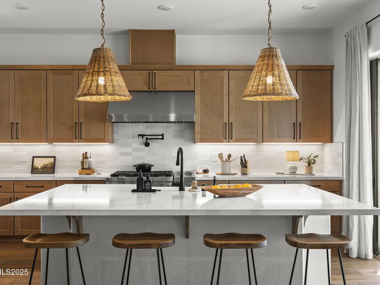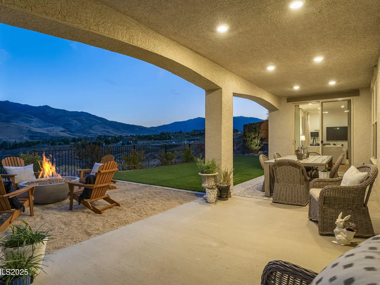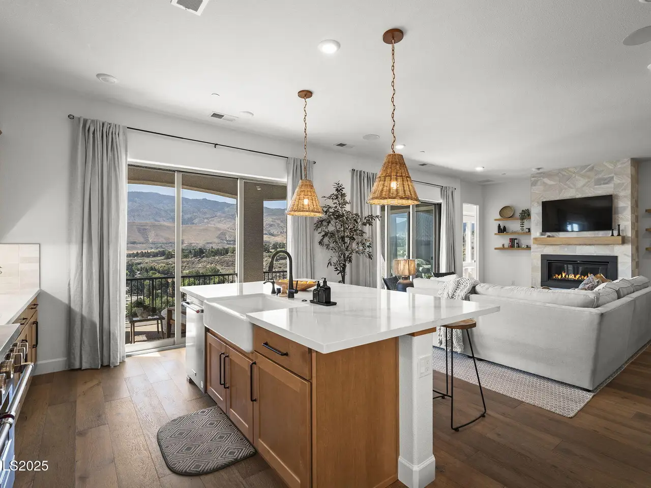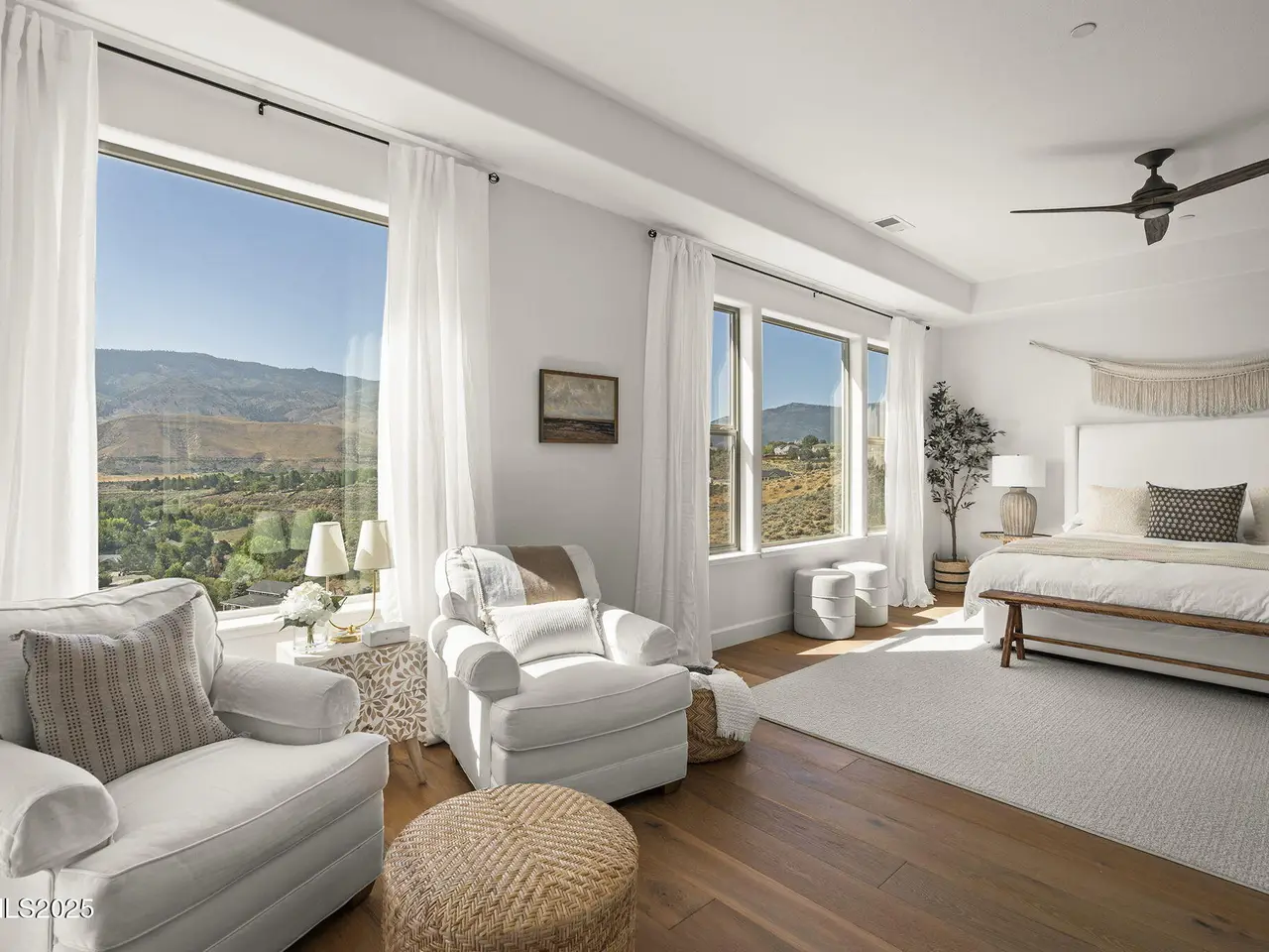 Opportunities like this don't come often. Tucked within Sunset Bluffs —an intimate hillside community in Northwest Reno of only 41 homes— this luxurious residence offers a lifestyle and is more than just a home, it displays model home perfection with unmatched, breathtaking views. Perched on a premier lot with no immediate rear neighbors, no neighbors on one side, and none directly across, it offers a level of privacy and serenity you simply won't find elsewhere. From the moment you step inside, your eyes are drawn to majestic, sweeping views of the Sierra Nevada mountains. Whether you're preparing a meal in the gourmet kitchen, relaxing by the great room fireplace, waking in your private primary suite, or unwinding on the oversized covered deck, the vistas are breathtaking—and unforgettable. Designed for main level living, the layout showcases dramatic 9' ceilings and rich hardwood flooring throughout. The open-concept great room centers around the 45" linear fireplace with floating beam mantel and full tile surround while flowing seamlessly into the chef's dream kitchen, complete with a Kitchen Aid stainless steel appliance package featuring a 48" six burner commercial-style gas range with griddle and double oven, Quartz counters, farmhouse style apron-front cast iron sink, under-cabinet lighting, roll-out shelving, walk-in pantry, coffee bar/prep area, and sleek designer finishes. Every detail has been thoughtfully curated for both style and function. The generous dining area completes this entertainer's dream space. Expansive 3-panel Western Sliders in both the great room and kitchen erase the boundary between indoor and outdoor living, framing nightly sunsets and wildlife sightings right from your own home. The split primary suite feels like a personal retreat, offering large windows that capture the morning light, direct deck access, and a spa-like bath with dual vanities, upgraded Kohler vessel sinks, a luxurious walk-in frameless glass shower and spacious walk-in closet. Two additional bedrooms share a beautifully upgraded full bath with dual Quartz vanities, drop-in sinks and a fully tiled tub/shower. A separate den/office with a glass-panel door, powder room, and fully appointed laundry room, including cabinets and laundry sink, complete the main level. The walk-out lower level is a world of its own and expands the home's versatility—complete with a large living area, flex space, and fully finished kitchenette, complete with sink, microwave and beverage fridge. Perfect for entertaining, extended guest stays, or multi-generational living, it even includes a bedroom, full bath, and direct access to the outdoor spaces. Additional features - • In-ceiling audio system • Automatic interior lighting in some locations • Central data panel • Three-car insulated garage with epoxy flooring and upgraded openers • Hardwood flooring on both levels, including the primary suite • Expansive covered deck & professionally designed outdoor living spaces • Rare private lot with uninterrupted views and unmatched seclusion • Numerous upgraded details and additional features throughout the home This is not just a home—it's a chance to live elevated, every single day. Homes with this level of privacy, luxury, and sweeping views rarely come available.