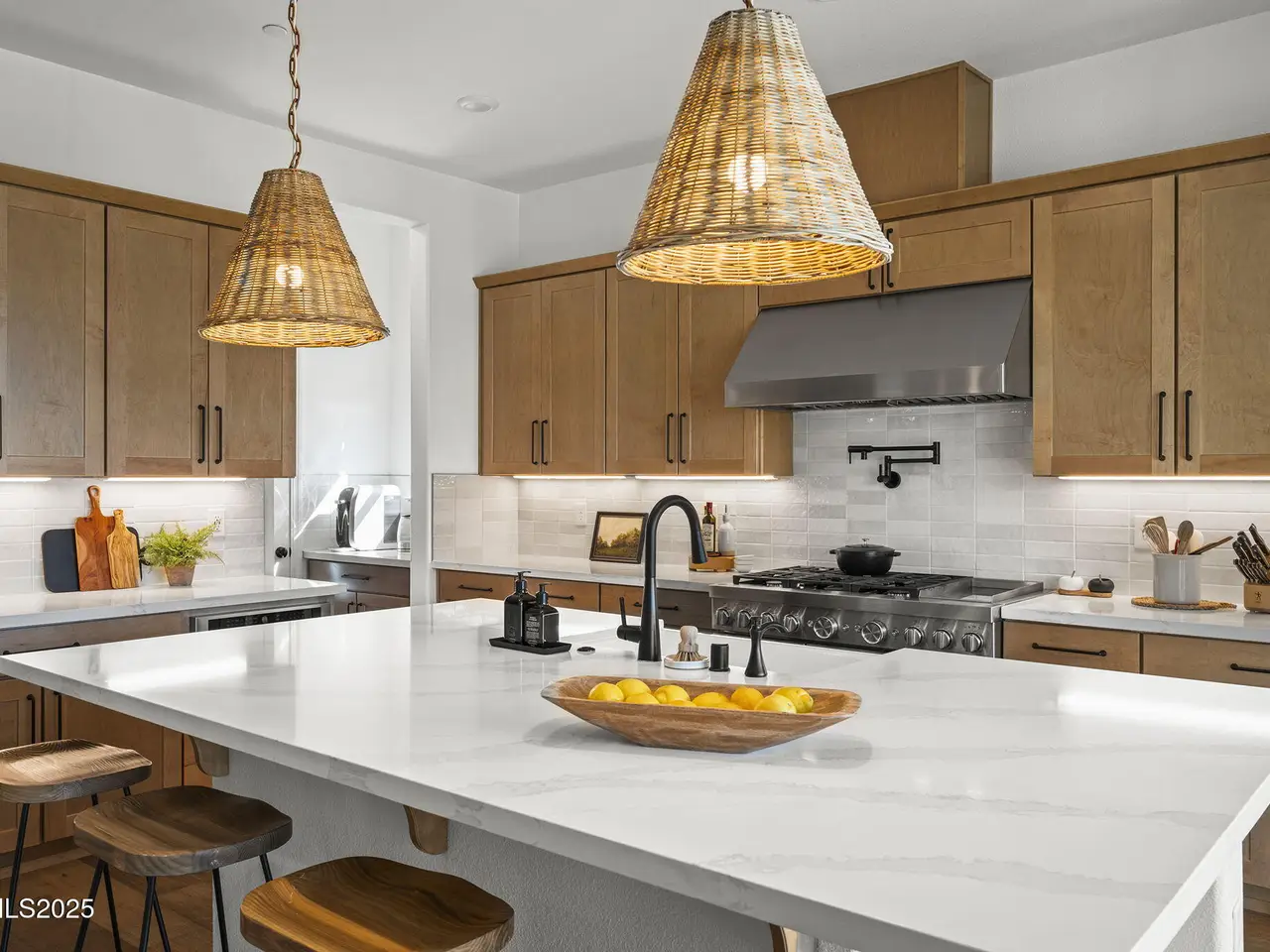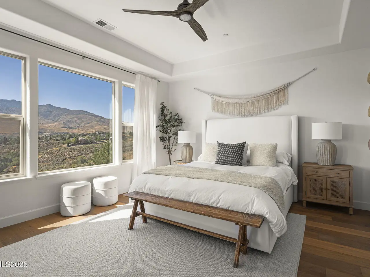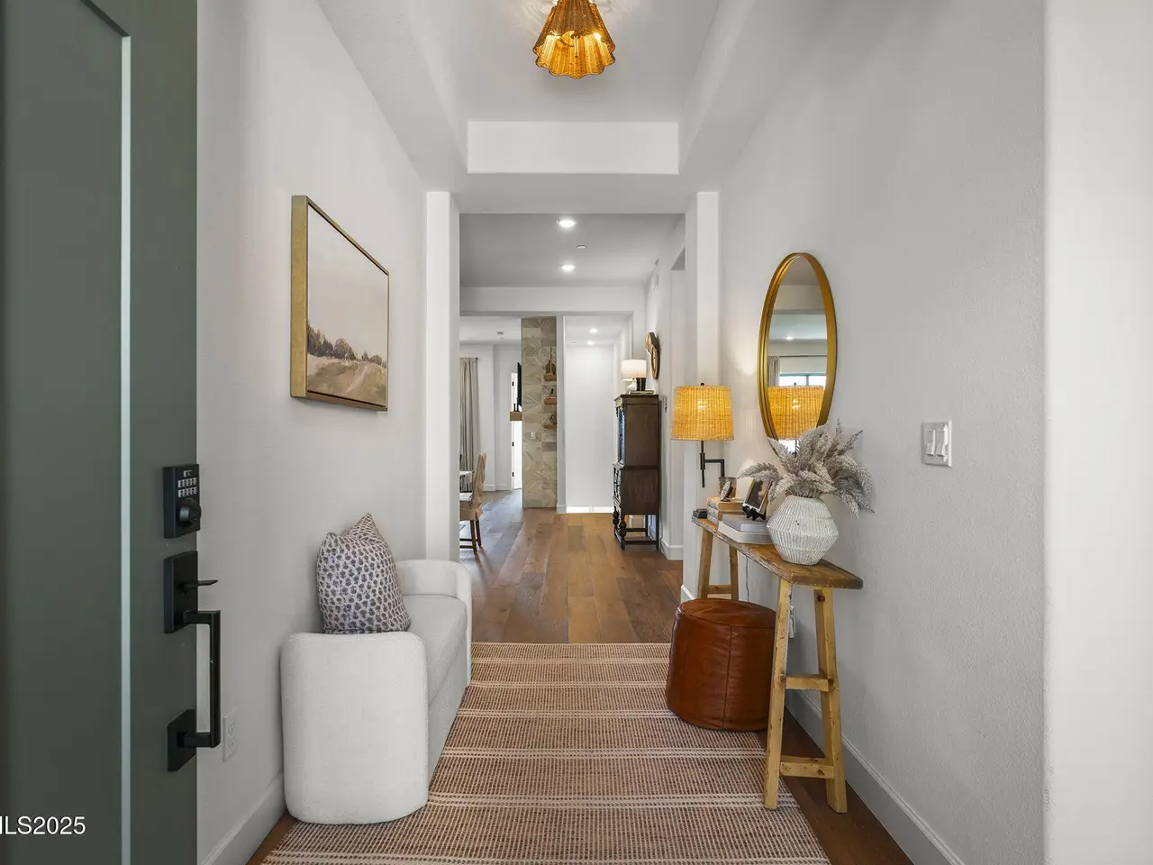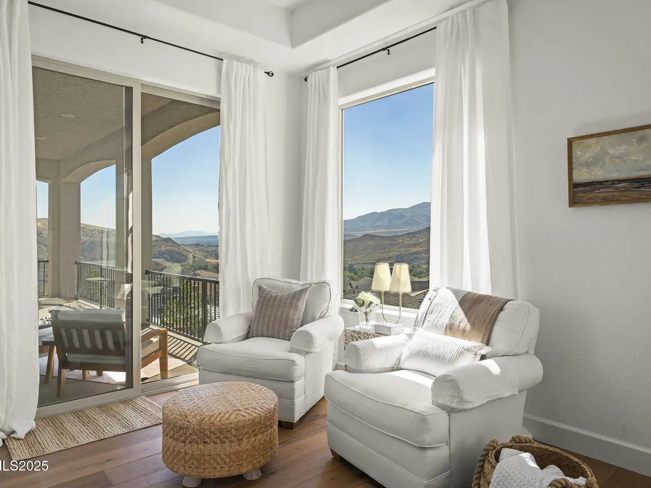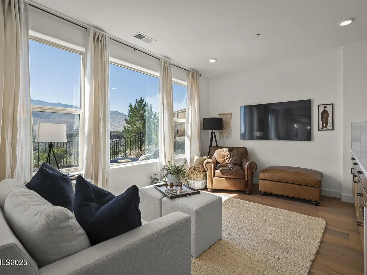 Opportunities like this don't come often. Tucked within Sunset Bluffs —an intimate hillside community in Northwest Reno of only 41 homes— this luxurious residence offers a lifestyle and is more than just a home, it displays model home perfection with unmatched, breathtaking views. Perched on a premier lot with no immediate rear neighbors, no neighbors on one side, and none directly across, it offers a level of privacy and serenity you simply won't find elsewhere. From the moment you step inside, your eyes are drawn to majestic, sweeping views of the Sierra Nevada mountains. Whether you're preparing a meal in the gourmet kitchen, relaxing by the great room fireplace, waking in your private primary suite, or unwinding on the oversized covered deck, the vistas are breathtaking—and unforgettable. Designed for main level living, the layout showcases dramatic 9' ceilings and rich hardwood flooring throughout. The open-concept great room centers around the 45" linear fireplace with floating beam mantel and full tile surround while flowing seamlessly into the chef's dream kitchen, complete with a Kitchen Aid stainless steel appliance package featuring a 48" six burner commercial-style gas range with griddle and double oven, Quartz counters, farmhouse style apron-front cast iron sink, under-cabinet lighting, roll-out shelving, walk-in pantry, coffee bar/prep area, and sleek designer finishes. Every detail has been thoughtfully curated for both style and function. The generous dining area completes this entertainer's dream space. Expansive 3-panel Western Sliders in both the great room and kitchen erase the boundary between indoor and outdoor living, framing nightly sunsets and wildlife sightings right from your own home. The split primary suite feels like a personal retreat, offering large windows that capture the morning light, direct deck access, and a spa-like bath with dual vanities, upgraded Kohler vessel sinks, a luxurious walk-in frameless glass shower and spacious walk-in closet. Two additional bedrooms share a beautifully upgraded full bath with dual Quartz vanities, drop-in sinks and a fully tiled tub/shower. A separate den/office with a glass-panel door, powder room, and fully appointed laundry room, including cabinets and laundry sink, complete the main level. The walk-out lower level is a world of its own and expands the home's versatility—complete with a large living area, flex space, and fully finished kitchenette, complete with sink, microwave and beverage fridge. Perfect for entertaining, extended guest stays, or multi-generational living, it even includes a bedroom, full bath, and direct access to the outdoor spaces. Additional features - • In-ceiling audio system • Automatic interior lighting in some locations • Central data panel • Three-car insulated garage with epoxy flooring and upgraded openers • Hardwood flooring on both levels, including the primary suite • Expansive covered deck & professionally designed outdoor living spaces • Rare private lot with uninterrupted views and unmatched seclusion • Numerous upgraded details and additional features throughout the home This is not just a home—it's a chance to live elevated, every single day. Homes with this level of privacy, luxury, and sweeping views rarely come available.
