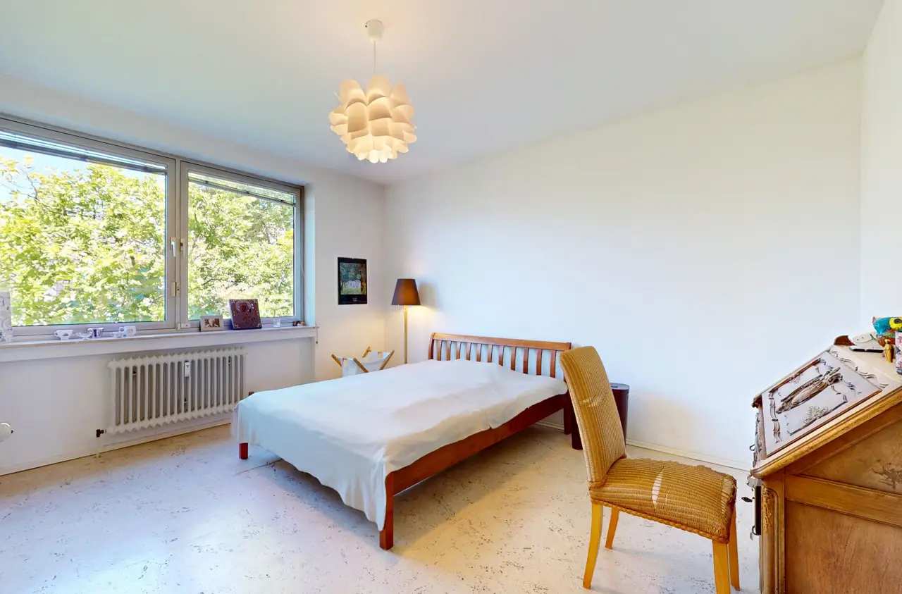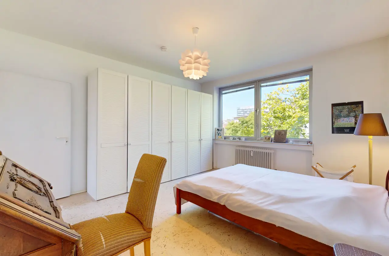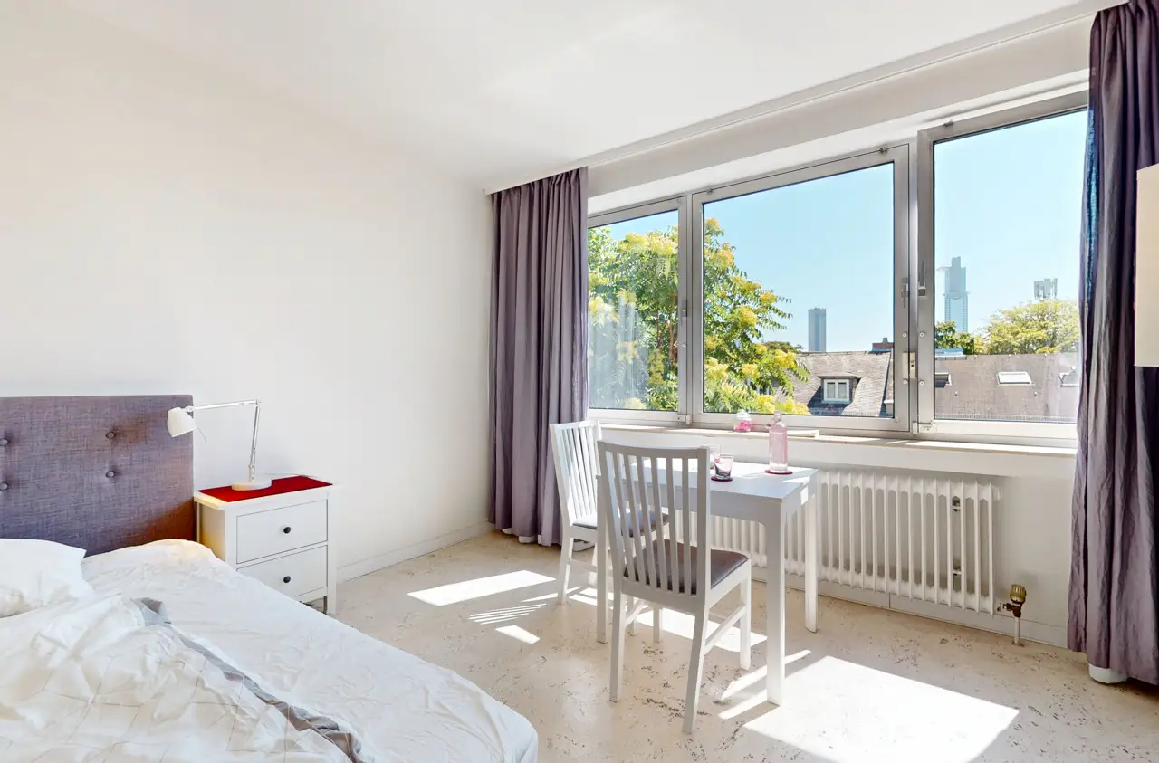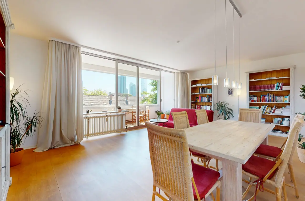 This light-flooded three-room apartment is located on the 5th floor of a well-kept apartment building and is easily accessible by elevator. The picturesque Palmengarten, Grüneburgpark and Frankfurt's lively city center are just a few minutes' walk away. The sought-after location in Westend boasts an excellent infrastructure with numerous shopping facilities, cozy restaurants, excellent public transport connections and green retreats in the immediate vicinity. The apartment has two well-designed bedrooms and a spacious living/dining area with an open-plan layout that invites you to linger. From here, you have direct access to the sunny loggia, which offers a magnificent view of the Frankfurt skyline. Large window fronts in all rooms create a bright, friendly living atmosphere and underline the pleasant feeling of space. Another highlight is the lovingly landscaped communal garden, which is available to all residents and invites them to relax in the greenery. Six parking spaces are jointly owned by the apartment owners. This apartment has the right to use one parking space.