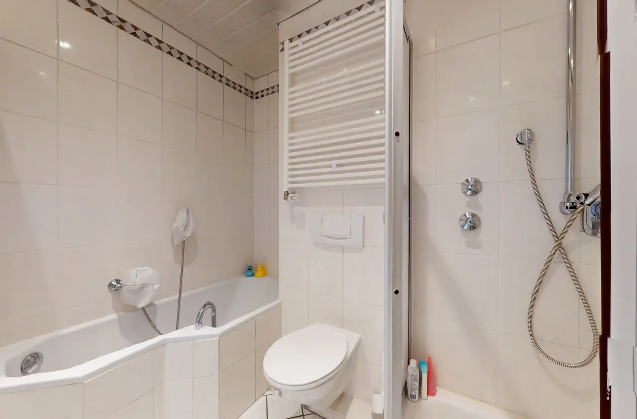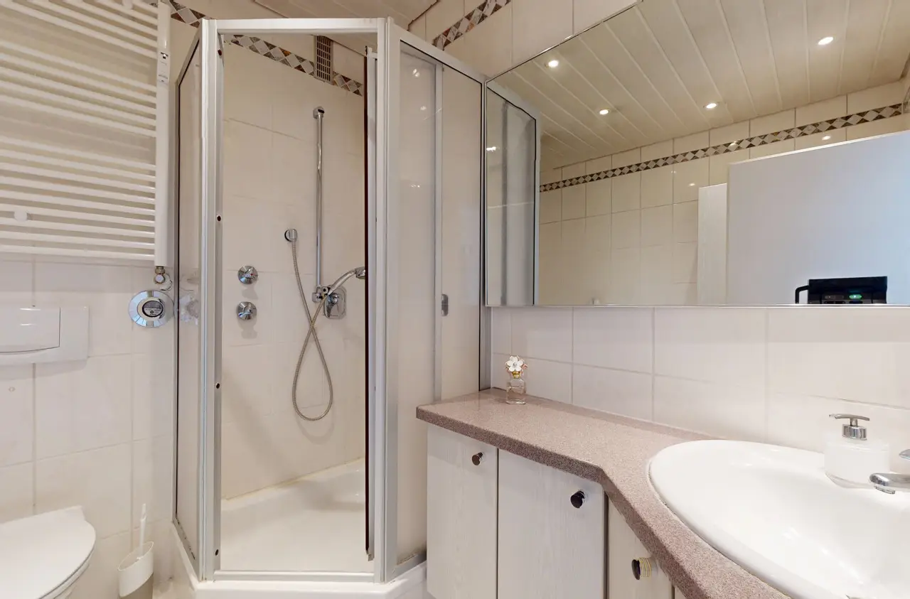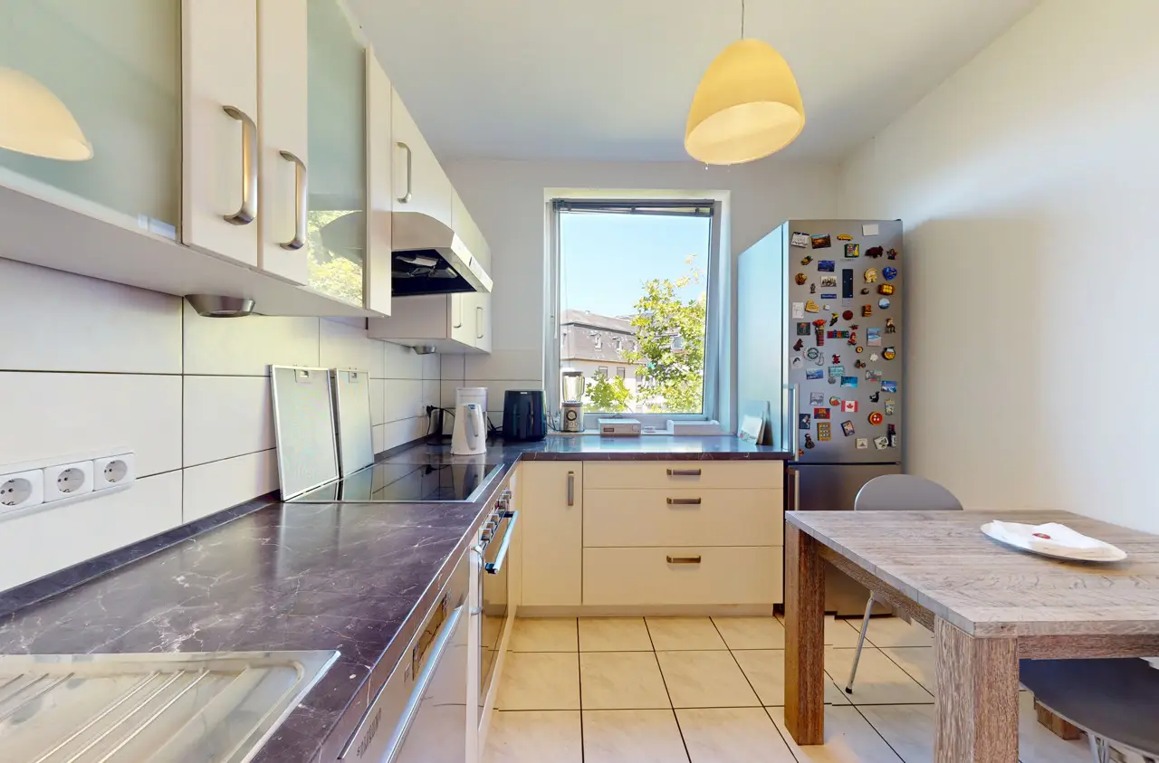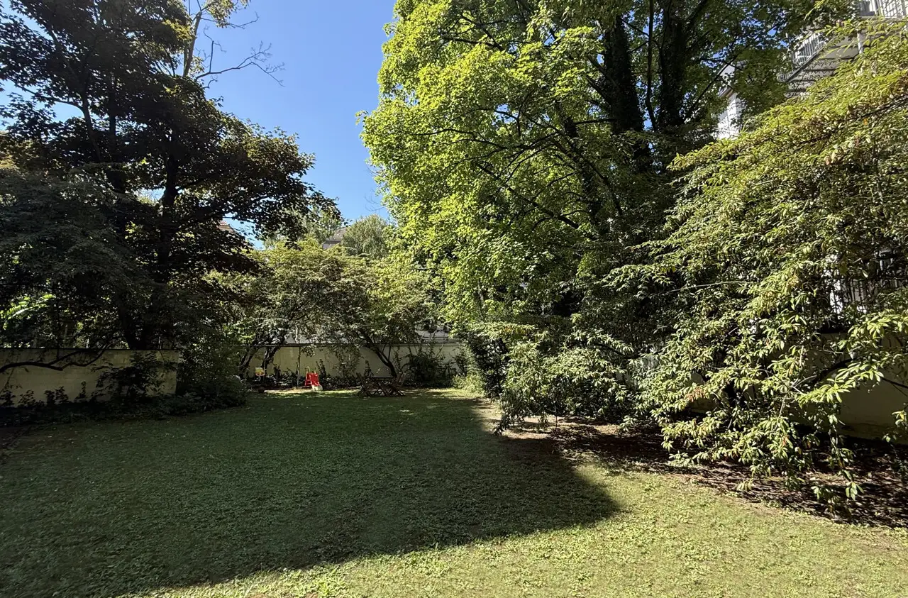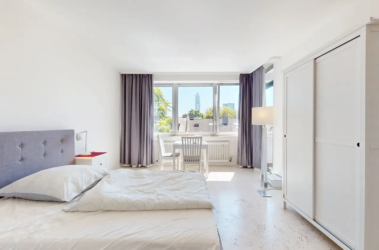 This light-flooded three-room apartment is located on the 5th floor of a well-kept apartment building and is easily accessible by elevator. The picturesque Palmengarten, Grüneburgpark and Frankfurt's lively city center are just a few minutes' walk away. The sought-after location in Westend boasts an excellent infrastructure with numerous shopping facilities, cozy restaurants, excellent public transport connections and green retreats in the immediate vicinity. The apartment has two well-designed bedrooms and a spacious living/dining area with an open-plan layout that invites you to linger. From here, you have direct access to the sunny loggia, which offers a magnificent view of the Frankfurt skyline. Large window fronts in all rooms create a bright, friendly living atmosphere and underline the pleasant feeling of space. Another highlight is the lovingly landscaped communal garden, which is available to all residents and invites them to relax in the greenery. Six parking spaces are jointly owned by the apartment owners. This apartment has the right to use one parking space.