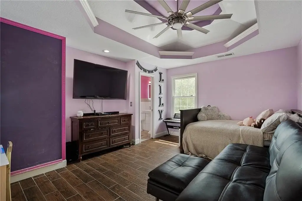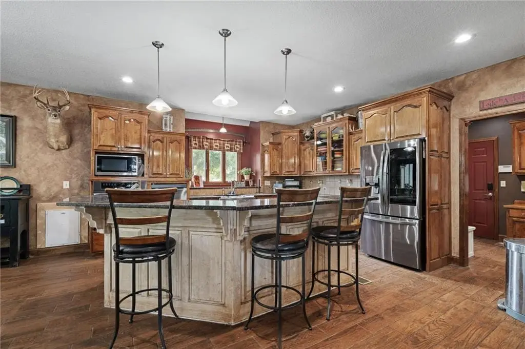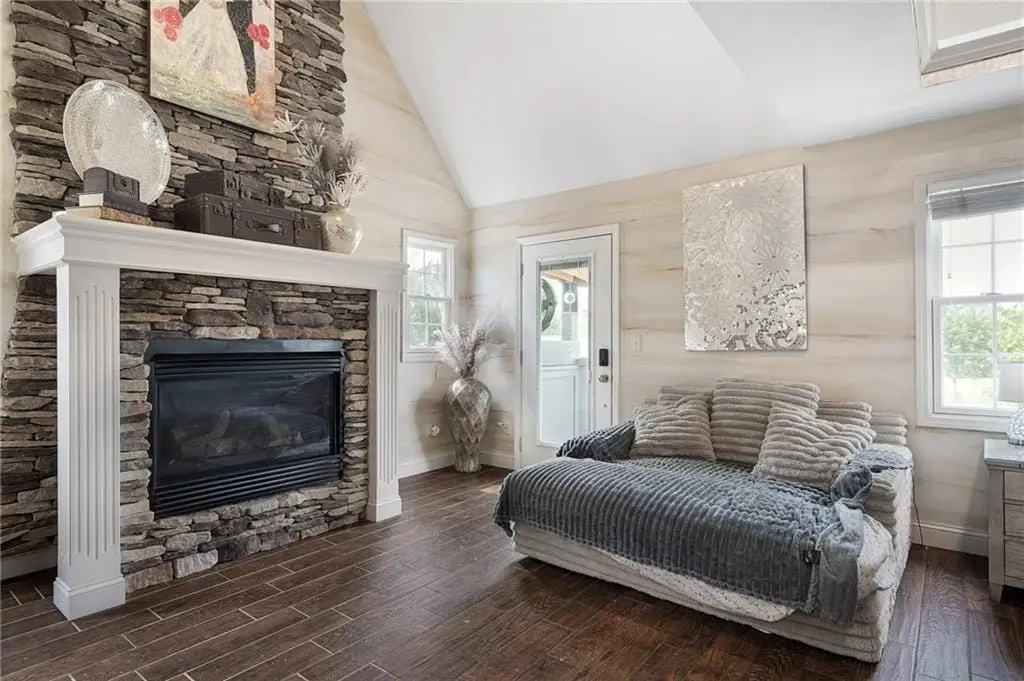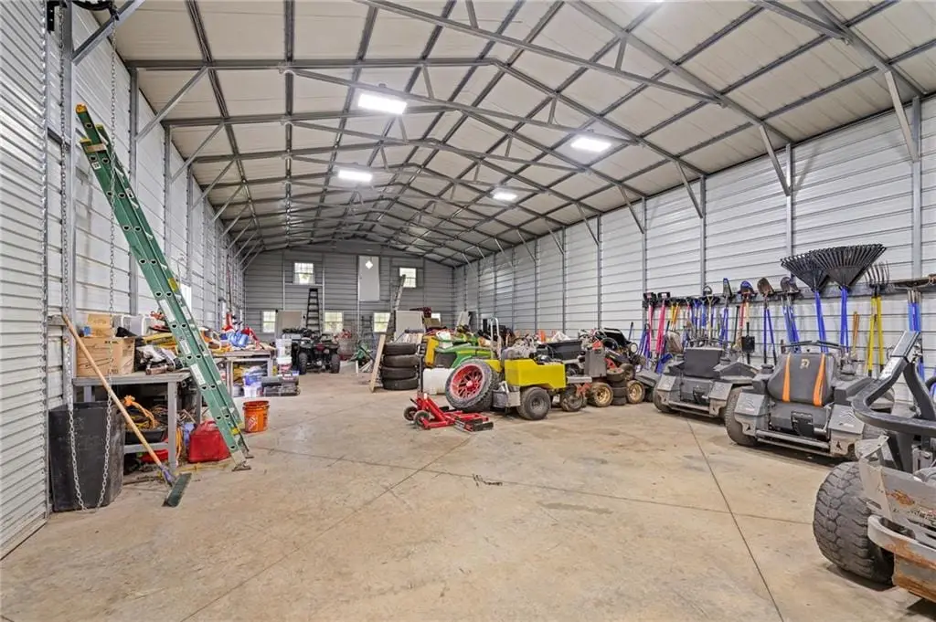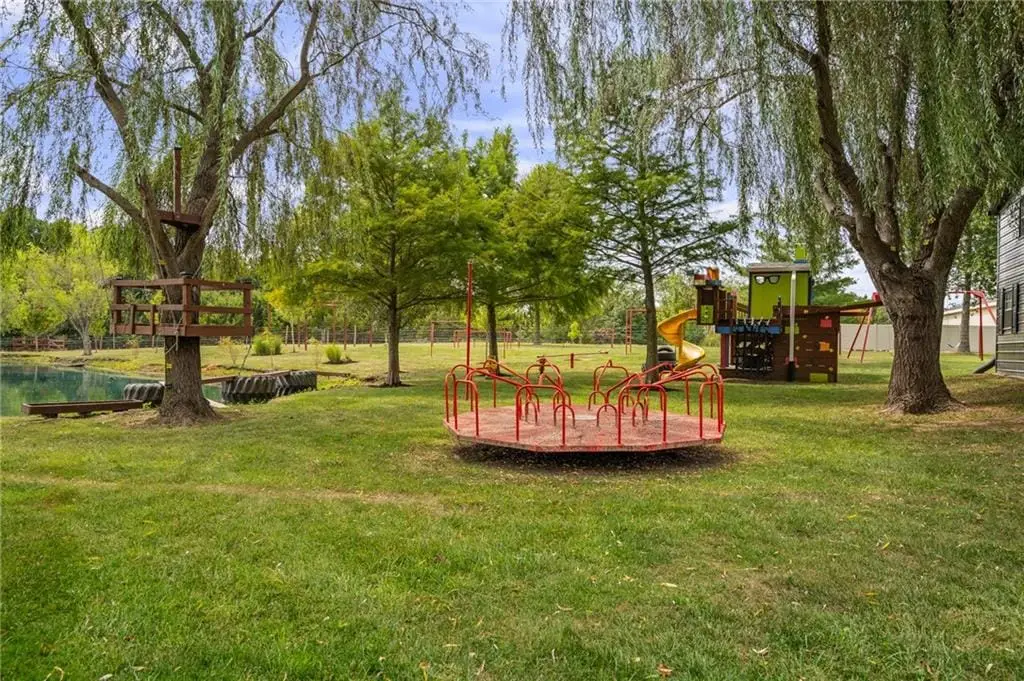 Unmatched in character and amenities, this gated 5-acre Lone Jack property is designed for those who love to entertain, live outdoors, and need space for a home-based business. The grounds are extraordinary, with two large ponds - one offering a sandy beach, dock, playhouse with hurricane deck, and zip line, the other showcasing a dramatic 12-foot stone waterfall. Multiple weeping willows surround the water, creating a picturesque, park-like setting. Outdoor living is unbelievable with a swimming pool, outdoor shower, festive poolside bar, basketball court, striped parking for nine cars, multiple firepits, fountains, and extensive landscaping and unique trees. A huge raised-bed garden with drip irrigation and automatic watering, vintage 1950s merry-go-round, playground and pergola framed with wisteria over the water complete the retreat. The 2006-built two-story home offers quality and comfort with hard surface flooring throughout the main level, five fireplaces, formal dining, office, and a hearth room/kitchen with island seating for five, Viking six-burner cooktop. French doors open to a fenced dog yard with pergola and hibachi grill. Upstairs, four bedrooms each enjoy private baths; the oversized primary suite boasts a fireplace, sitting area, private covered balcony with mini split, and a massive walk-in closet. The walkout lower level is built for gathering, with a theater, arcade, full bar, non-conforming fifth bedroom, full bath, and access to a saloon-style patio with hot tub and firepit. Complete set up for livestock and farm animals with fenced pen, multiple shelters and duck pond. The property also includes a new outbuilding with concrete floor, two large overhead doors, built-in compressor, and plumbing for living quarters - ideal for equipment storage, hobbies, or running a business. Meticulously maintained and set on blacktop, this one-of-a-kind estate combines resort-style living with everyday functionality - an entertainer’s paradise inside and out.