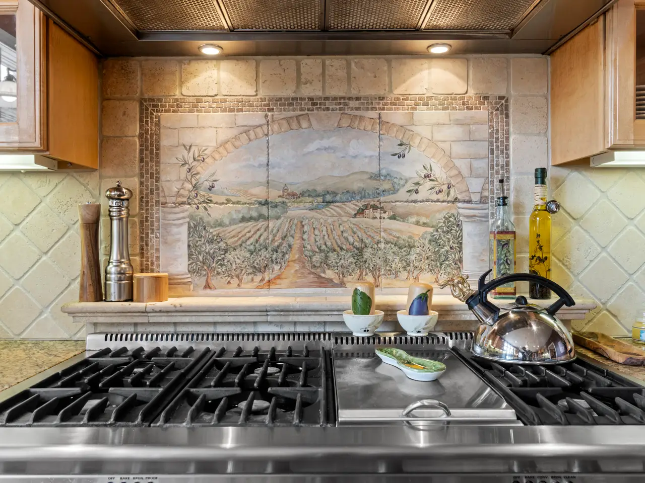 Custom backsplash featuring scenes of Tuscany