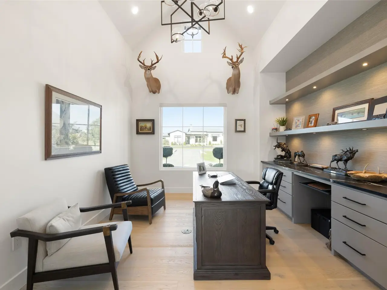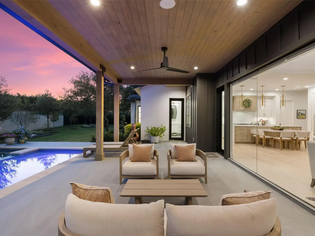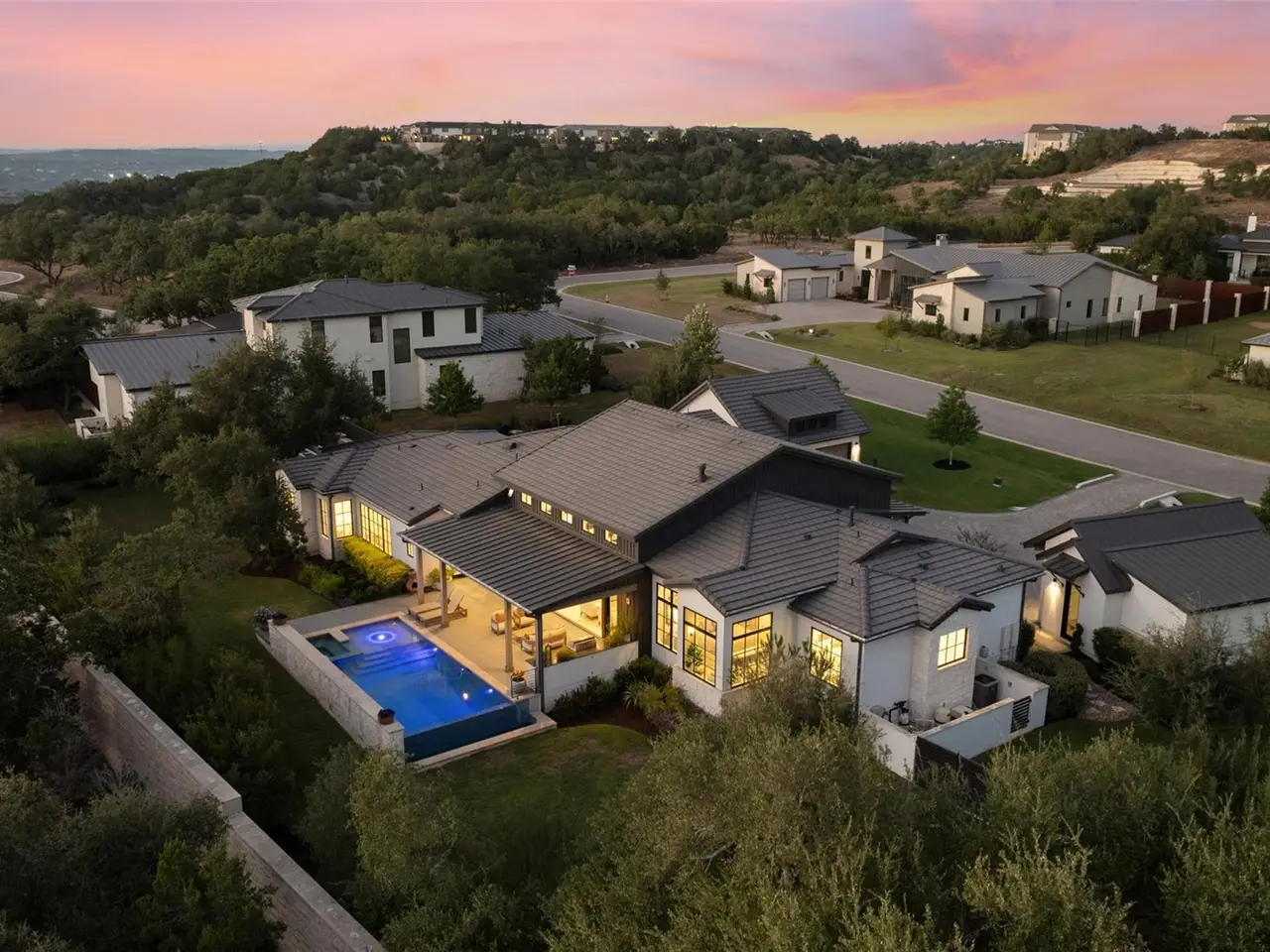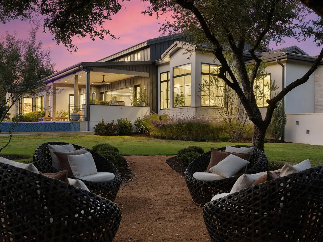 Welcome to 17213 Morning Grove Lane, a beautifully executed single-story custom home built by Eppright Homes in 2023 and situated on a flat, oak-studded lot in the gated community, Madrone Canyon. With thoughtful architecture and timeless Hill Country appeal, this home pairs soft modern finishes with warm natural textures highlighted by wide-plank wood floors, vaulted ceilings with beams, designer lighting, and abundant natural light throughout. An open-concept layout connects the spacious living room, dining area, and gourmet kitchen, where professional-grade appliances and a generous island anchor the heart of the home.Designed for both comfort and flexibility, the home includes four spacious bedrooms each with its own en-suite bath, plus two separate offices, a dedicated pool bath, and a well-appointed four-car garage. The primary suite is a private retreat, featuring serene backyard views, a spa-style bath with a deep soaking tub, oversized walk-in shower, dual vanities, and a beautifully customized closet. Every detail inside has been intentionally selected, from the ambient lighting and wallpaper accents to the automated window shades and bespoke hardware.Out back, a resort-style pool and spa with a negative edge and waterfall feature become the centerpiece of the landscape, surrounded by a large covered patio, raised garden beds, and open lawn shaded by mature oaks. With its calm, elegant style and a layout that blends functionality with ease, 17213 Morning Grove Lane offers refined Hill Country living just minutes from everyday conveniences in both Bee Cave and Lakeway along with top-rated Lake Travis schools.