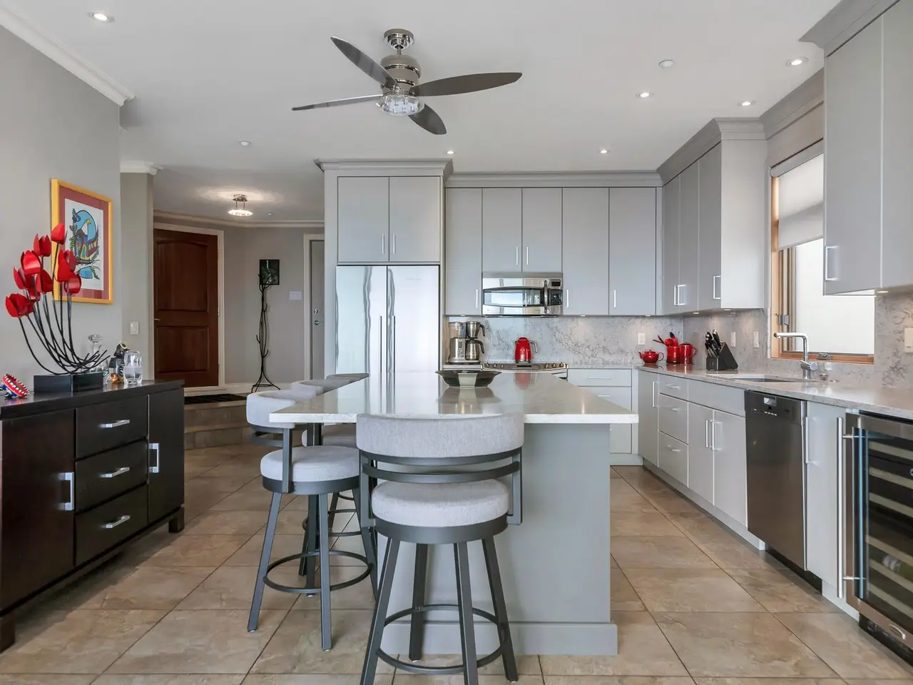 Ocean view updated 3 bedroom hillside home with 2 bedroom legal suite with separate access & laundry and great parking. Quality built home with hot water radiant heat for all 3 levels with 5 zones, low maintenance hardie plank siding. wood metal clad windows & sliding doors, 9' ceilings, tiled floors on the main floor with double 4' sliding doors leading to spacious ocean view deck featuring 2 cm porcelain tiles complimented with topless railings & privacy screens both sides of the deck. Some extra feature include wood interior doors and trims, tall baseboards, crown and detailed ceilings, gorgeous updated kitchen with cabinets to the ceiling complimented with stainless steel appliance package, quartz countertops, backsplash & matching island/breakfast bar with storage. Bonus media room!