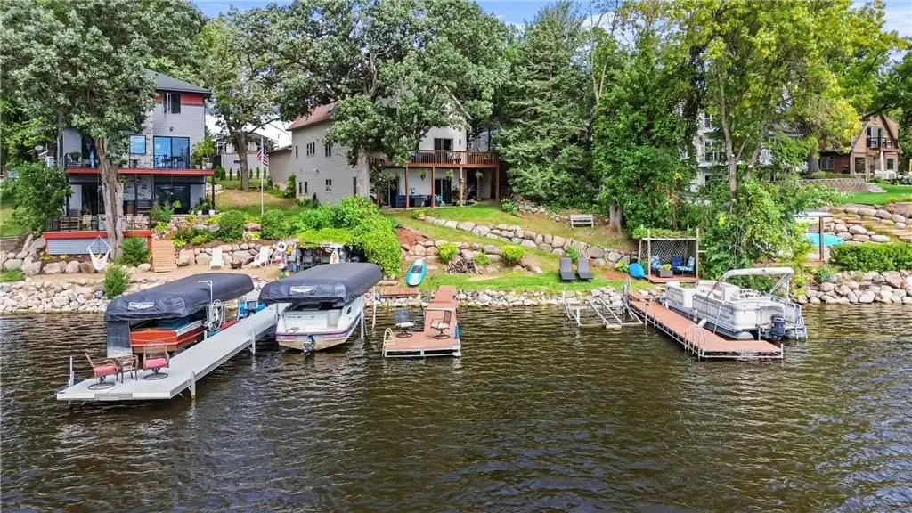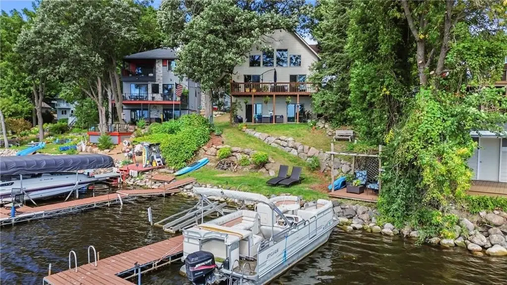 Enjoy life on Lower Prior Lake! This well-maintained home is perfectly situated on Grainwood Bay, just before Martinson Island-offering stunning views, a wraparound deck, and direct backyard access to the lake. Inside, you'll find hardwood floors, large windows, and multiple sliding glass doors that bring the outdoors in. The main level includes a bedroom, full bath, and laundry just off the three-car garage. Upstairs, the loft and spacious primary suite offer panoramic lake views, a walk-in closet, and a luxurious bath with soaker tub and walk-in shower. The walkout lower level features a second gas fireplace, wet bar, two bedrooms, and another full bath-plus two more sliding doors that open to a lakeside patio. Whether you're relaxing or ready to launch your boat, this is lake living at its best!