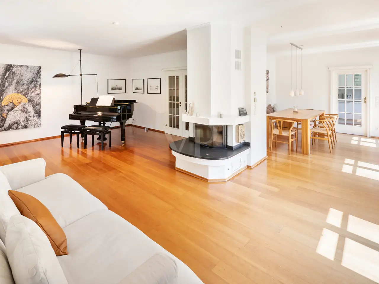 In the prestigious Villa Colony II, this charming property presents itself as a rare opportunity for families who demand space, style and quality of living. Originally built in 1957, the house with its historic flair was extensively renovated in 1997 and continuously modernized. On a generous living space of approx. 245 m² and a sunny plot of approx. 561 m², the house offers an ideal combination of classic living comfort and contemporary furnishings. Thanks to numerous windows, the entire house is flooded with light and conveys an open, inviting atmosphere. A particular architectural highlight is the striking tower on the building, which gives the house its unmistakable character. Two large terraces facing south-west and south-east as well as two balconies create attractive outdoor retreats and provide a view of the lovingly landscaped garden with garden shed. Inside, the house impresses with high-quality features such as fine cherry wood parquet flooring in all living areas, ceramic tiles in the kitchen and bathrooms and a stylish fitted kitchen that meets the highest standards both functionally and visually. The spacious living area is complemented by an elegant fireplace, which creates a cozy atmosphere on cooler days. A combination of underfloor heating and radiators ensures a pleasant indoor climate in the various areas of the house. A modern bathroom with a bathtub and a separate shower room provide comfort in everyday life. The converted top floor houses the popular open-plan lounge and the beautiful home office with south-west orientation and floor-to-ceiling windows. There is plenty of storage space in the basement of the house, which offers practical benefits for the residents. A hobby room or fitness room also allows for a variety of uses and rounds off the offer perfectly. This spacious property combines stylish living with historic charm - a rarity in this prestigious and family-friendly residential area. Immediate occupancy is possible.