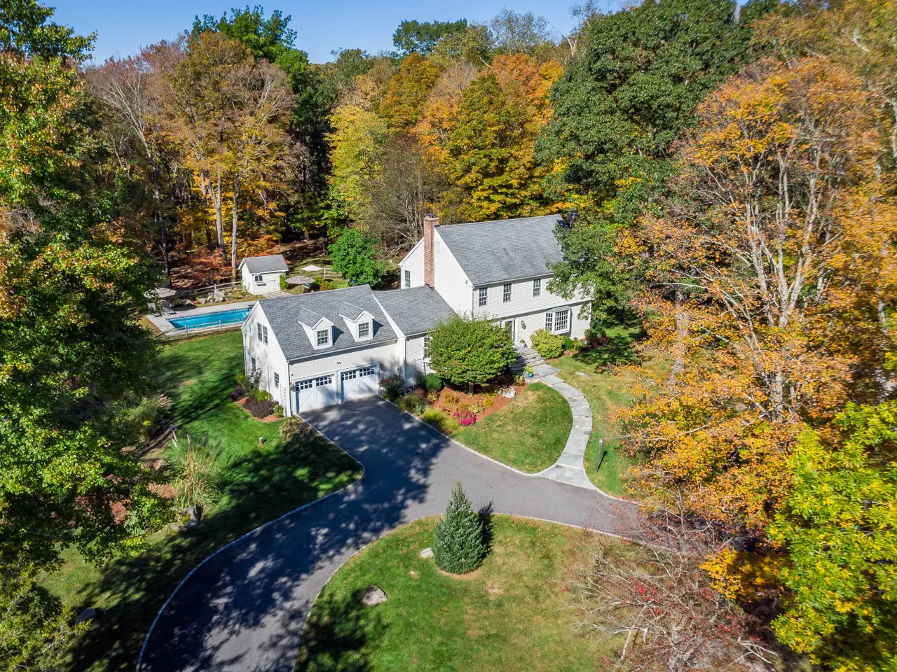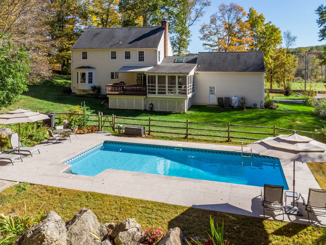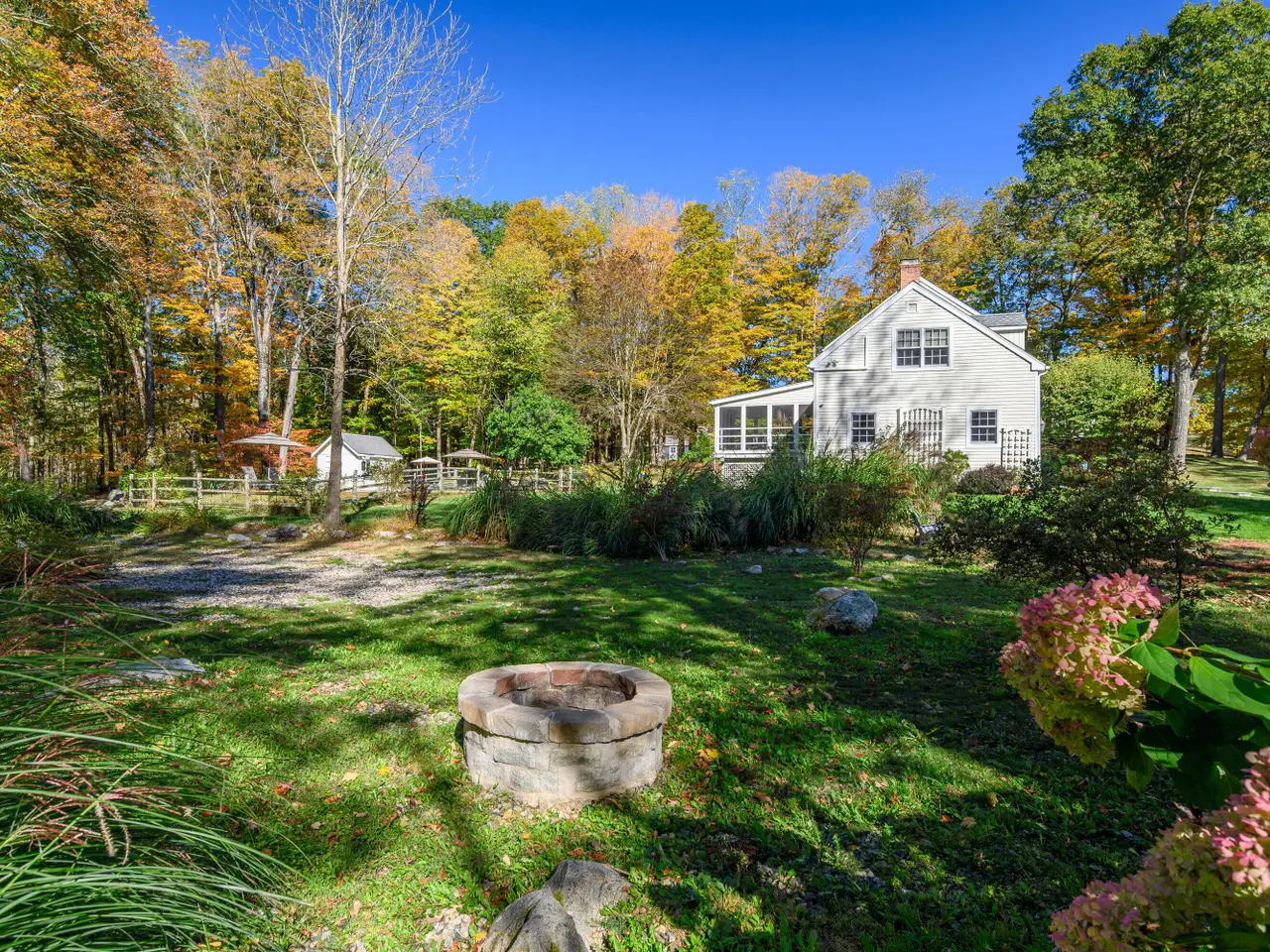 Quintessential Connecticut. Drive past estates on a country lane to be greeted by stone pillars, iron gates, professionally designed stone walls & a Belgian block lined circular driveway. An unparalleled setting of mature trees & a sweeping pastoral view just across the way. Step inside to discover a sophisticated yet relaxed country retreat ideal for weekend getaways or year-round living. Timeless character is evidenced by the bay windows with built-in seating, making the perfect spot for curling up with a book. Entertain friends in the step-down family room with a dramatic two-story brick fireplace where the sounds and smells of crackling wood can be enjoyed. Outdoor living takes place on the covered screened porch and adjacent spacious deck. Head upstairs to find a worthy primary suite that embraces a professionally designed walk-in dressing room/closet with built-ins leading to a designer bath. Do not miss the 5th bedroom over the garage, hosting a full bath, ideal for in-laws or weekend guests. Heated in-ground pool in a private, fully fenced-in park-like setting on over 5 acres. It is ideally located minutes to the sought-after quaint downtown of Ridgefield, offering charming boutiques, restaurants, the Ridgefield Playhouse, museums, a nearby golf course, award-winning schools, and so much more. The nearby equestrian center elevates the living experience at a home you will cherish forever.
