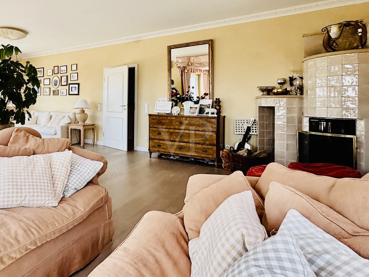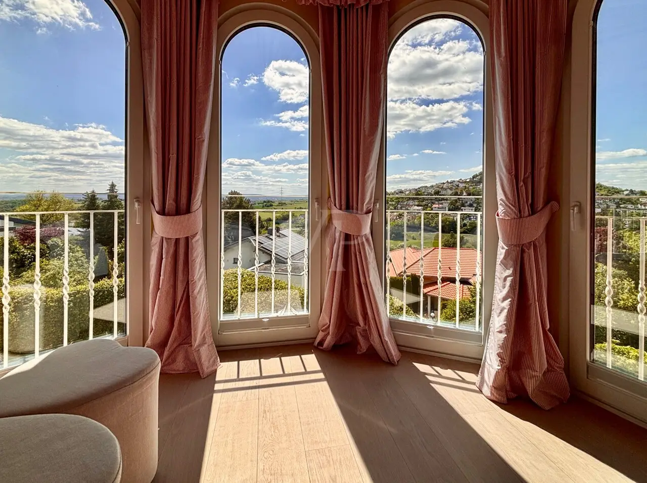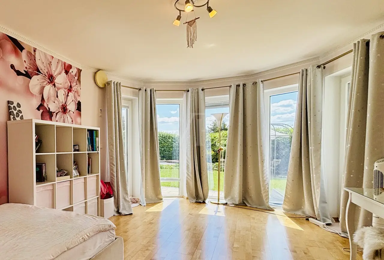 This special residence is located on a spacious plot of approx. 1500 m² on the edge of the forest. With a living space of approx. 313 m², the house extends over three floors and offers space for eight spacious rooms. The construction method of the Isartal timber house from 2005 impresses with its quality and sustainability. The property has five well-proportioned bedrooms and three high-quality bathrooms, providing ample private space for a family. The underfloor heating and an efficient wood pellet heating system combine to create a comfortable living environment and support sustainable energy use. Particularly noteworthy is the wood-burning stove from 2013, which provides additional warmth and a special atmosphere. The open, large fitted kitchen is equipped with first-class appliances from Zug and offers plenty of space for culinary creations. There is plenty of space for the family in the adjoining dining and living area. The unusual architecture with a bay window over all floors creates special places with spectacular views. For company and relaxation outdoors, the pool with osmosis and counter-current system offers welcome cooling in the summer months. This area is complemented by a summer kitchen and various outdoor areas for socializing in the open air. Various play equipment is available for children, while the teahouse offers peace and quiet. The secure property is equipped with electric gates and has a double garage with space for two vehicles. There is the option of installing a kitchen connection in the basement, which significantly expands the possible uses. A wine cellar rounds off the offer and provides optimal storage conditions for lovers of fine wines. With a particular focus on feng shui, harmonious aspects were incorporated into the design to create a pleasant and balanced living environment. The combination of modern comfort and well thought-out details makes this house a unique offering on the market. The quality of living and the feel-good ambience are unique. Combined with one of the most beautiful views in the area.