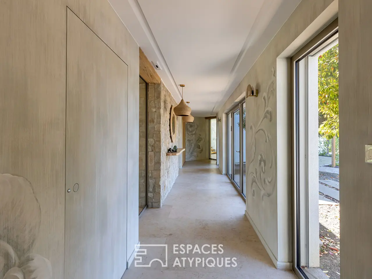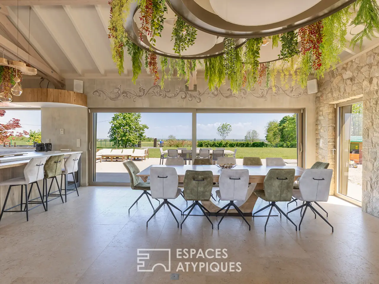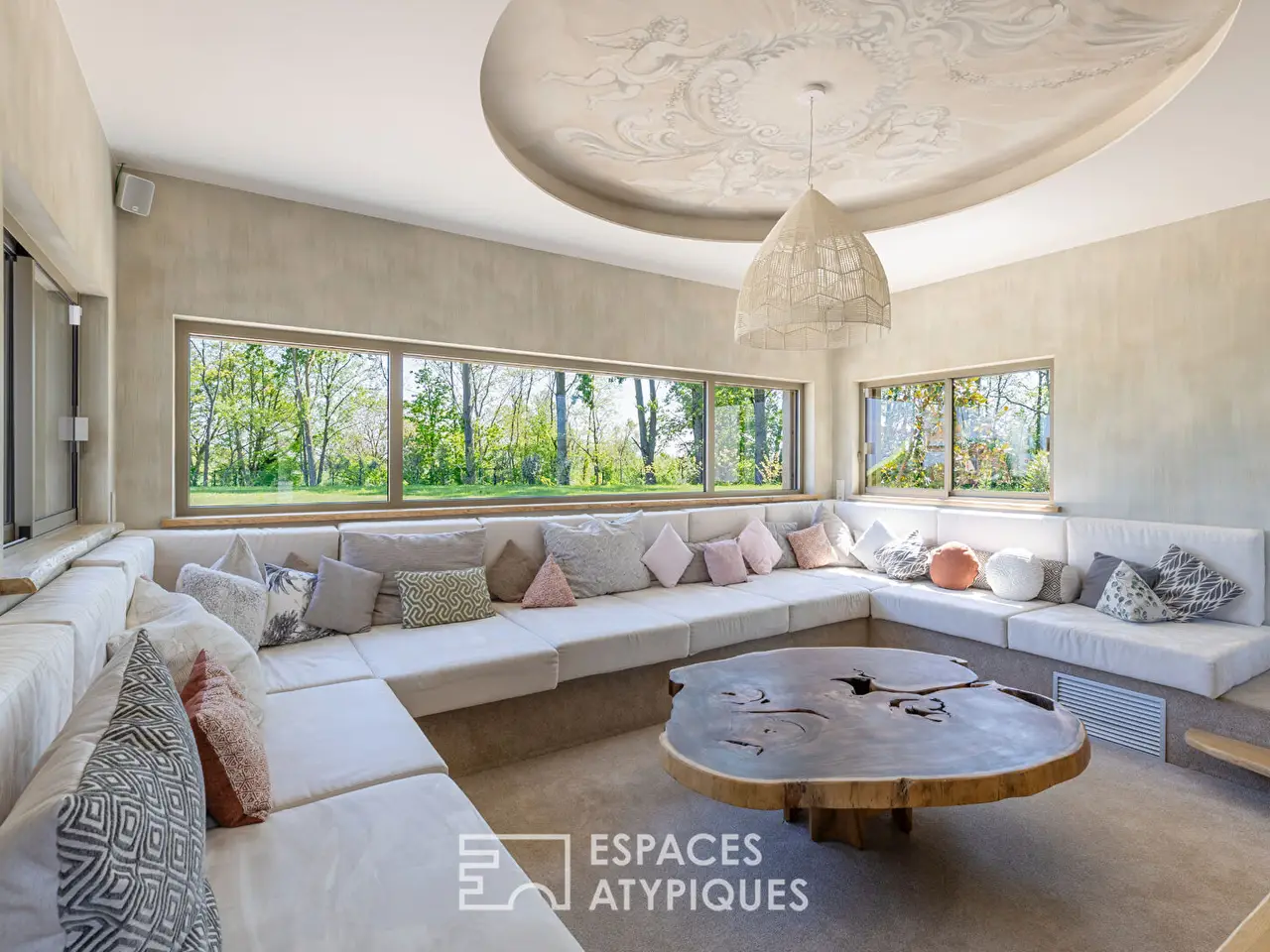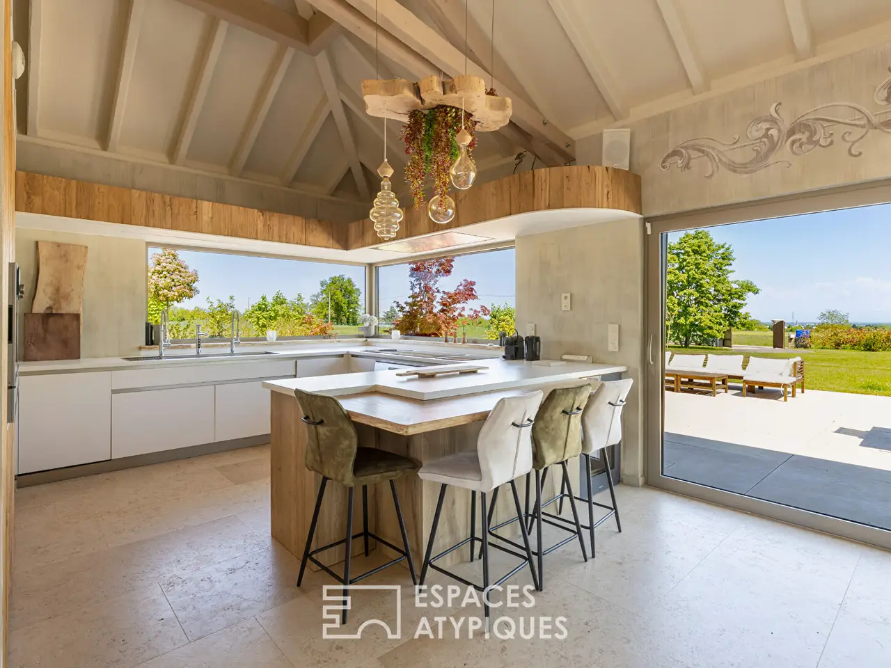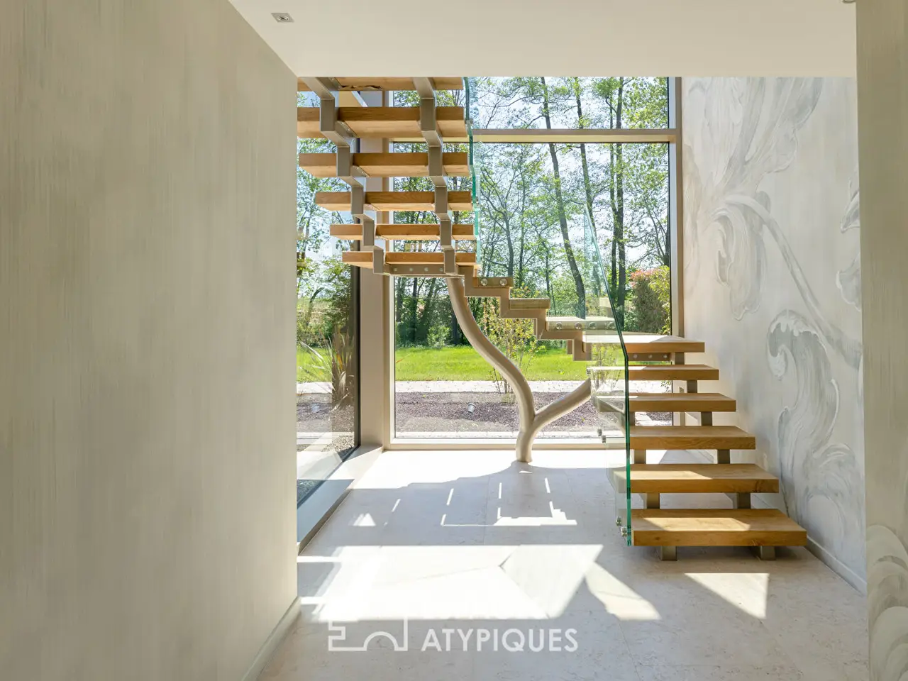 This 222 m2 contemporary house, built in 2023 on almost one hectare of fully-enclosed grounds in the immediate vicinity of Guebwiller in the heart of a green setting between fields and vines, embodies the perfect blend of architectural elegance, top-of-the-range features and unspoilt nature. Set away from all residential development, it enjoys a privileged, quiet and confidential location, yet remains close to amenities, schools and major roads.The entrance to the estate is through a majestic gate framed by stone columns, underlining the unique character of the property. Its vast terrace, jacuzzi, high-quality landscaping and eco-friendly design make this an exceptional property.The light-filled, carefully designed interior features a 75 m2 living room bathed in light thanks to its large picture windows. The open-plan kitchen, fully equipped with top-of-the-range Gaggenau appliances, features a rare layout: two dishwashers, three ovens, a built-in wok, a wine cellar and plenty of storage space integrated into bespoke oak units. The dining room and small adjoining lounge offer a convivial atmosphere, enhanced by a mural created by a renowned artist, which can also be seen in the bedrooms upstairs. The ground-level master suite has direct access to the outdoor jacuzzi, as well as a refined bathroom with double shower, bath, double washbasin unit and a vast dressing room. A multimedia room, storeroom and utility room complete this level.Access to the first floor is via a wooden staircase that leads through a spectacular space with impressive glazed surfaces, bathing the corridors in natural light. There are two cosy bedrooms with parquet flooring, each with its own shower room, and attic space that could be converted into a study or guest bedroom.The carefully planted and fully fenced grounds include a carport, a children's play area and uninterrupted views of the surrounding countryside.The house is self-sufficient in water thanks to an underground catchment and treatment system, ensuring a completely independent domestic supply. A heat pump with underfloor heating, a wood-burning stove and an air conditioning system ensure optimum comfort all year round.With its unique setting in the heart of nature, monumental entrance, artistic frescoes, light-filled rooms, noble materials and top-quality fixtures and fittings, this property offers a rare living experience, combining architectural inspiration with absolute serenity. A resolutely atypical property, designed for lovers of art and space.Schools 15 minutes' walk, 10 minutes by bike, 5 minutes by carMotorway 20 minutes' driveBasel/Mulhouse airport 40 minutes' driveREF. 1632Additional information* 6 rooms* 3 bedrooms* 1 bathroom* 2 shower rooms* 2 floors in the building* Outdoor space : 9995 SQM* Parking : 6 parking spaces* Property tax : 1 501 €Energy Performance CertificatePrimary energy consumptionb : 85 kWh/m2.yearHigh performance housing*A*85kWh/m2.year2*kg CO2/m2.yearB*C*D*E*F*GExtremely poor housing performance* Of which greenhouse gas emissionsa : 2 kg CO2/m2.yearLow CO2 emissions*2kg CO2/m2.yearA*B*C*D*E*F*GVery high CO2 emissionsEstimated average annual energy costs for standard use, indexed to specific years 2021, 2022, 2023 : between 1310 € and 1850 € Subscription IncludedAgency feesThe fees include VAT and are payable by the vendorMediatorMediation Franchise-Consommateurswww.mediation-franchise.com29 Boulevar