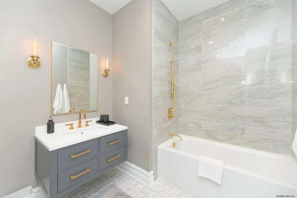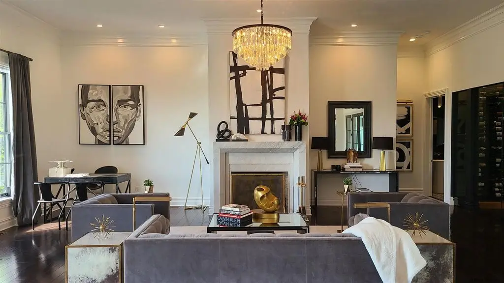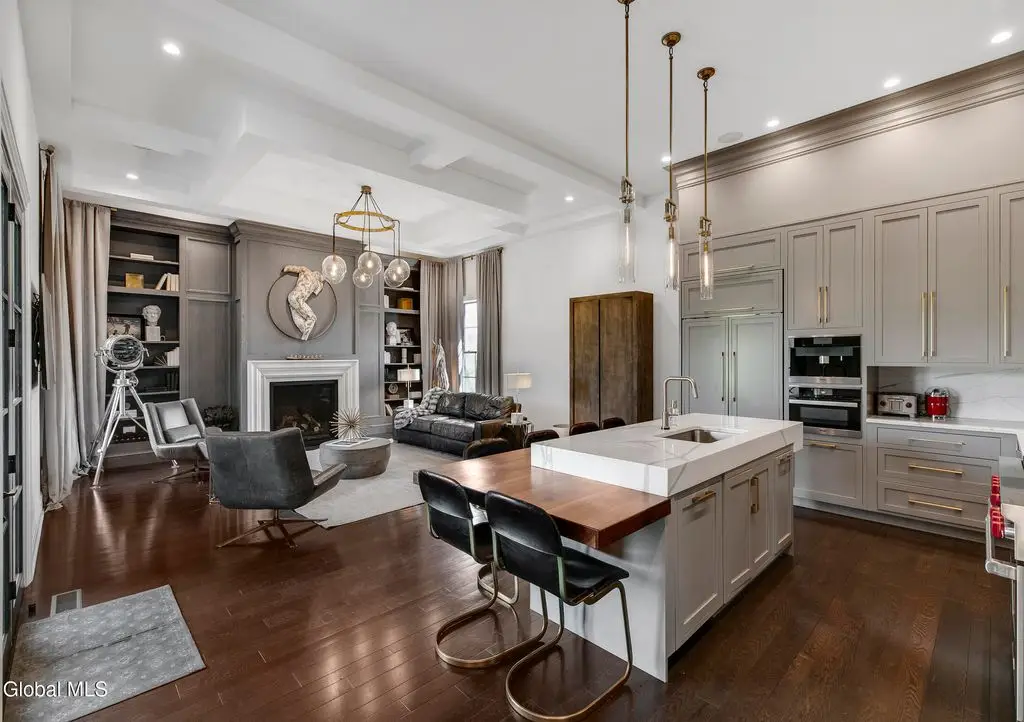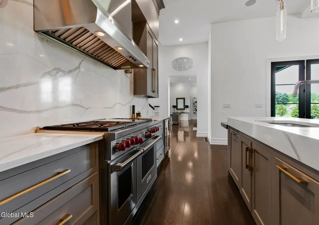 Stunning Georgian-style estate on 8+ acres located just 10 minutes from the Saratoga racetrack. Designed for entertaining, this 5-bedroom home offers an open floorplan with a comfortable, elegant, contemporary finish unique to other luxury homes in the Capital District. Your family and guests can relax and take in the incredible views by the heated, saltwater pool as you fire up the grill at the Stoll custom outdoor kitchen with bar, sink, and fridge. End the day down at the pond, surrounded by nature and gather at the firepit. Features: 12' ceilings, dual fireplaces, a climate-controlled wine cellar, and both first and second-floor primary suites, pool bathroom, and finished lower level. Premium appliances: Bosch, Miele, Wolf, and Sub-Zero.