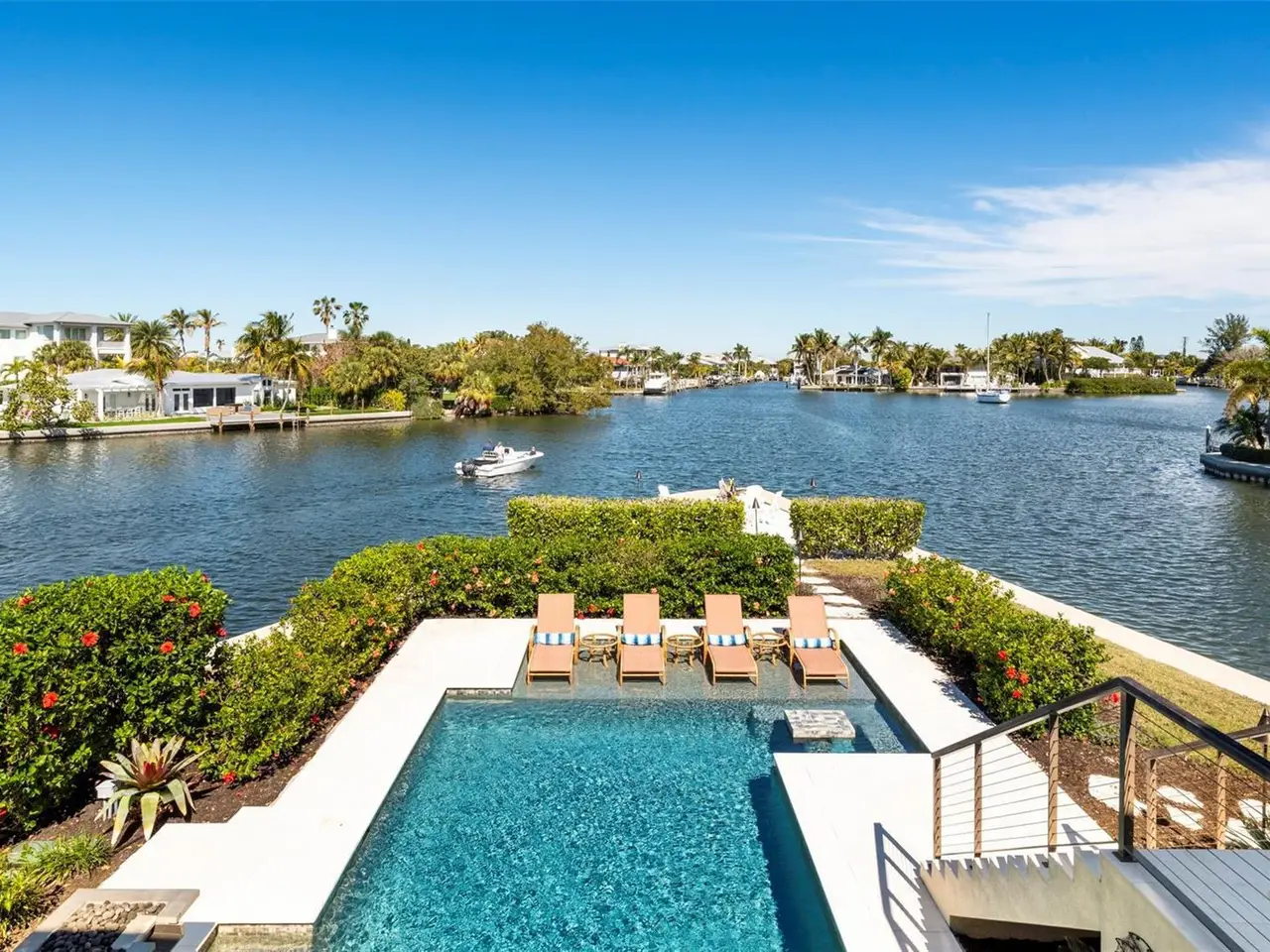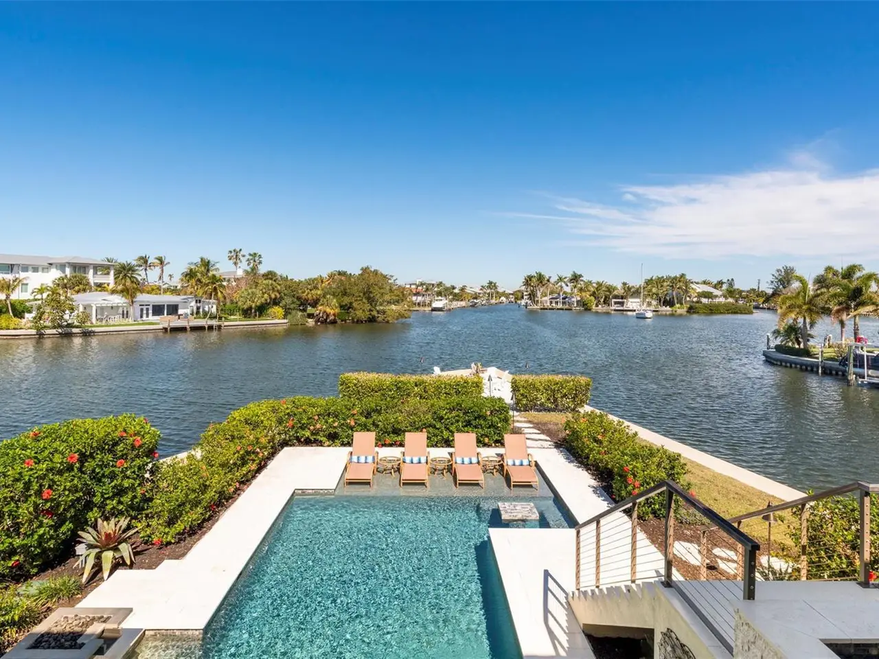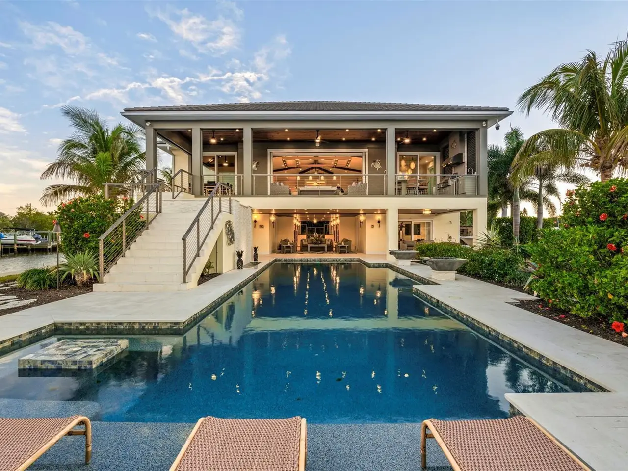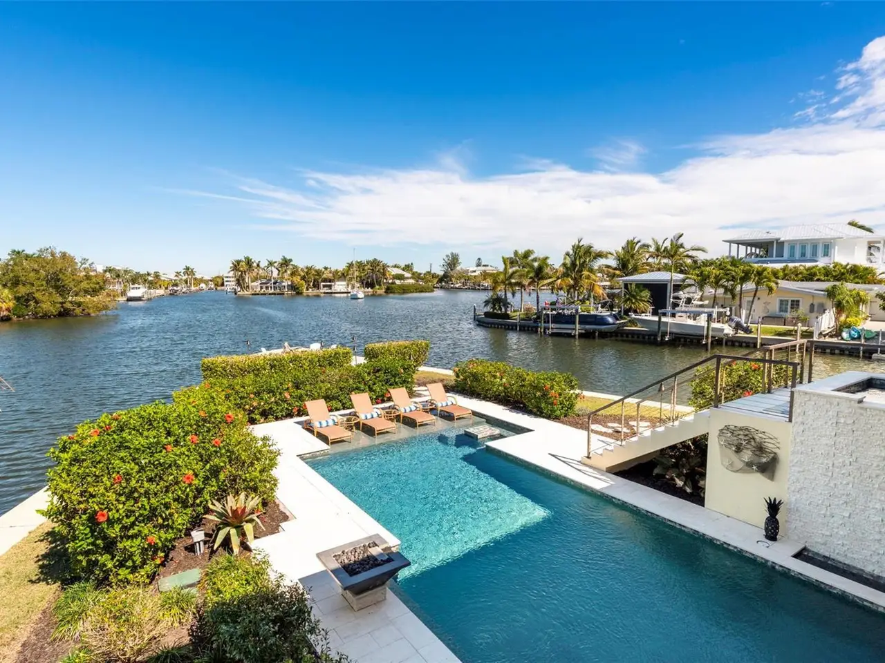 A rare opportunity now exists to own what has been described by many as one of the most beautiful homes on Anna Maria Island. This remarkable family estate has it all: location, architectural beauty and quality, elevated construction. In a sea of homes renovated or built for rental income, this property stands out as a true family residence, constructed to withstand the storms, yet take advantage of the beautiful Florida weather. Newly built in 2020, the spectacular home is set on a stunning triangular, gated property with over 500 feet of water frontage. It is located on the only street on the island that directly accesses both the famous beaches of Anna Maria and the pristine boating waters of Bimini Bay. With Anna Maria’s ideal climate, this home brings a seamless flow between indoor and outdoor living. The 3850 feet luxury air conditioned, elevated home combines with a further 4000 feet of covered and finished living space, to create an expansive family residence that is ideal for entertaining guests. Stepping out of the elevator into the huge vaulted great room, you are met with spectacular views over Bimini Bay. The stunning chef’s kitchen, with imported cabinetry and illuminated glass countertops, adjoins the family dining room with seating for ten and a living room with a fireplace for the occasional cool winter night. Throughout the home, imported cabinetry and Tahitian-inspired finishes reflect craftsmanship and thoughtful design. When not needed, a 20ft set of hurricane safe glass doors disappear into the outdoor walls, allowing a seamless flow from the kitchen onto the massive covered lanai The 800 square foot lanai, with retractable screens, is home to a full outdoor kitchen, a Teppanyaki cooking table with seating for eight, a built in fire table, outdoor dining and seating areas, and it has direct access to the elevated spa. All of this with spectacular views of Bimini Bay, over the resort-style pool below, the tropical gardens, fire and water features, and a waterfront “beach” fire pit, where family and guests gather beneath the stars. In the main house, there are two luxurious primary bedrooms enhanced with full ensuites, while in the guest house, connected by a covered bridge, there are two additional bedrooms, a full bathroom and a kitchenette providing a private retreat for your guests or the grandkids! A 20-foot dock is ideal for launching the Kayaks or SUP, while serious boating enthusiasts will appreciate 500 feet of new concrete reinforced seawall, a 60-foot boat dock, and a 12,000 lb. boatlift, with direct access to Tampa Bay and the Gulf of Mexico. This estate truly represents one of the island’s most distinguished offerings. Private viewings are available exclusively by appointment. Meanwhile, you are welcome to enjoy a narrated video preview at the property’s private website, amidreamhome.com.