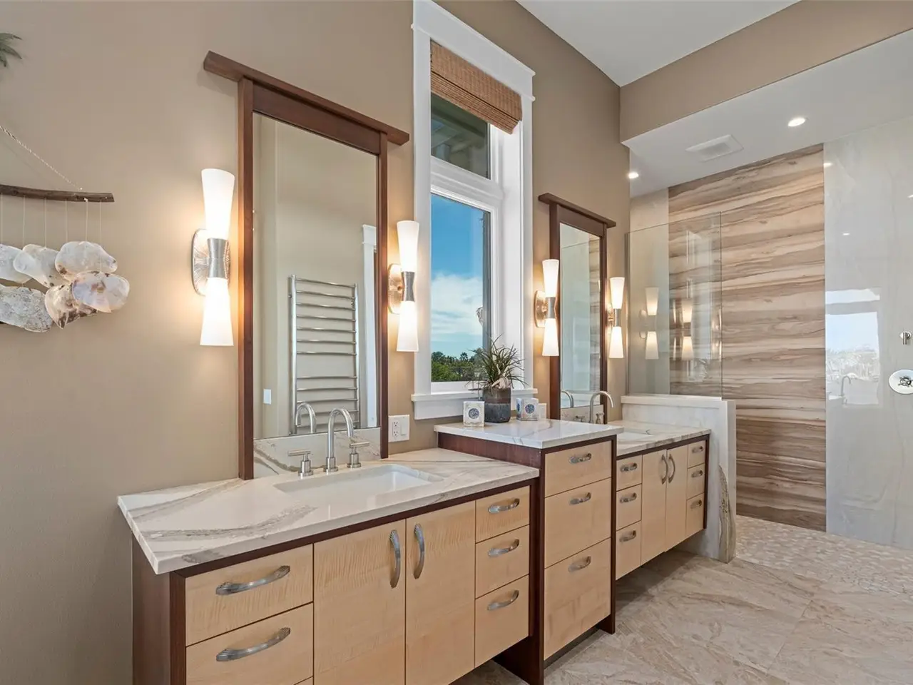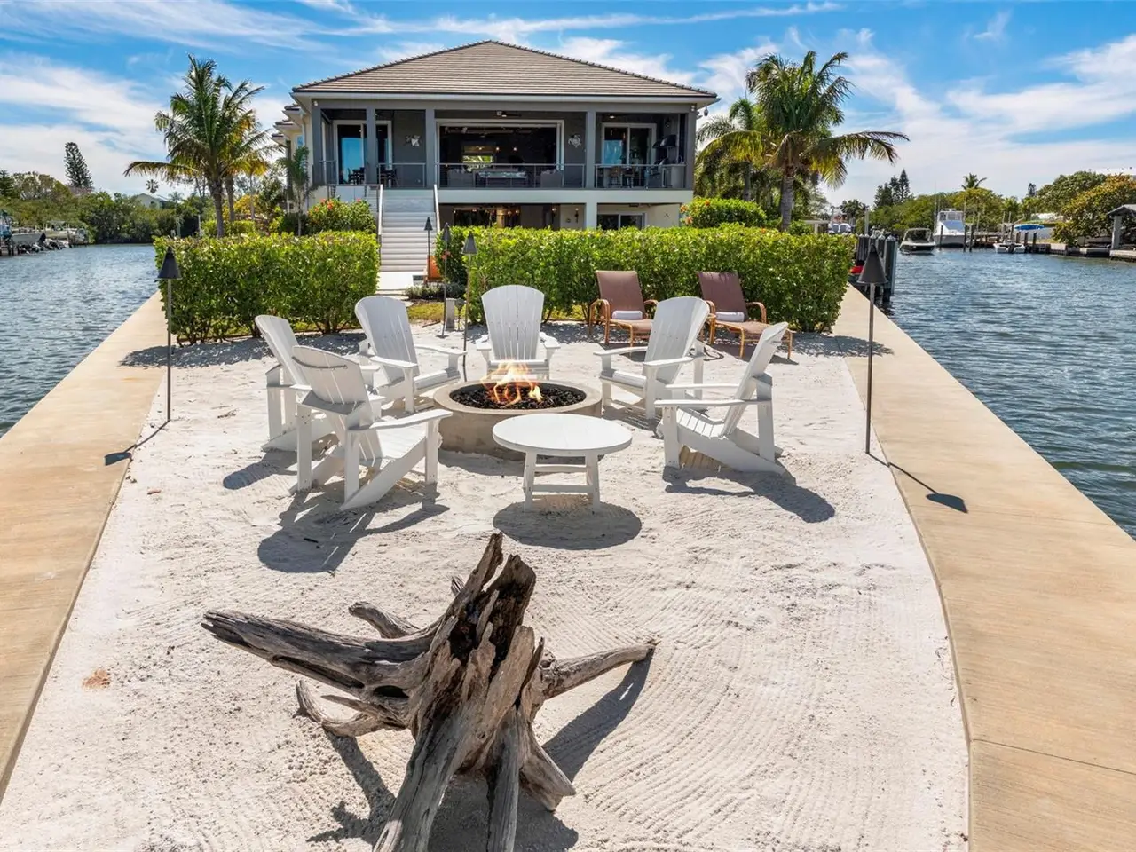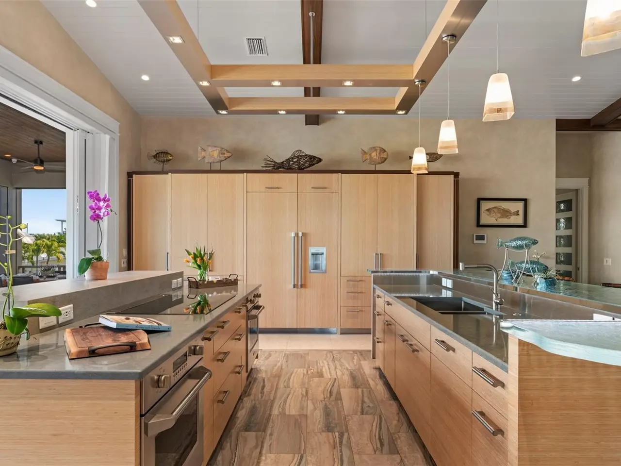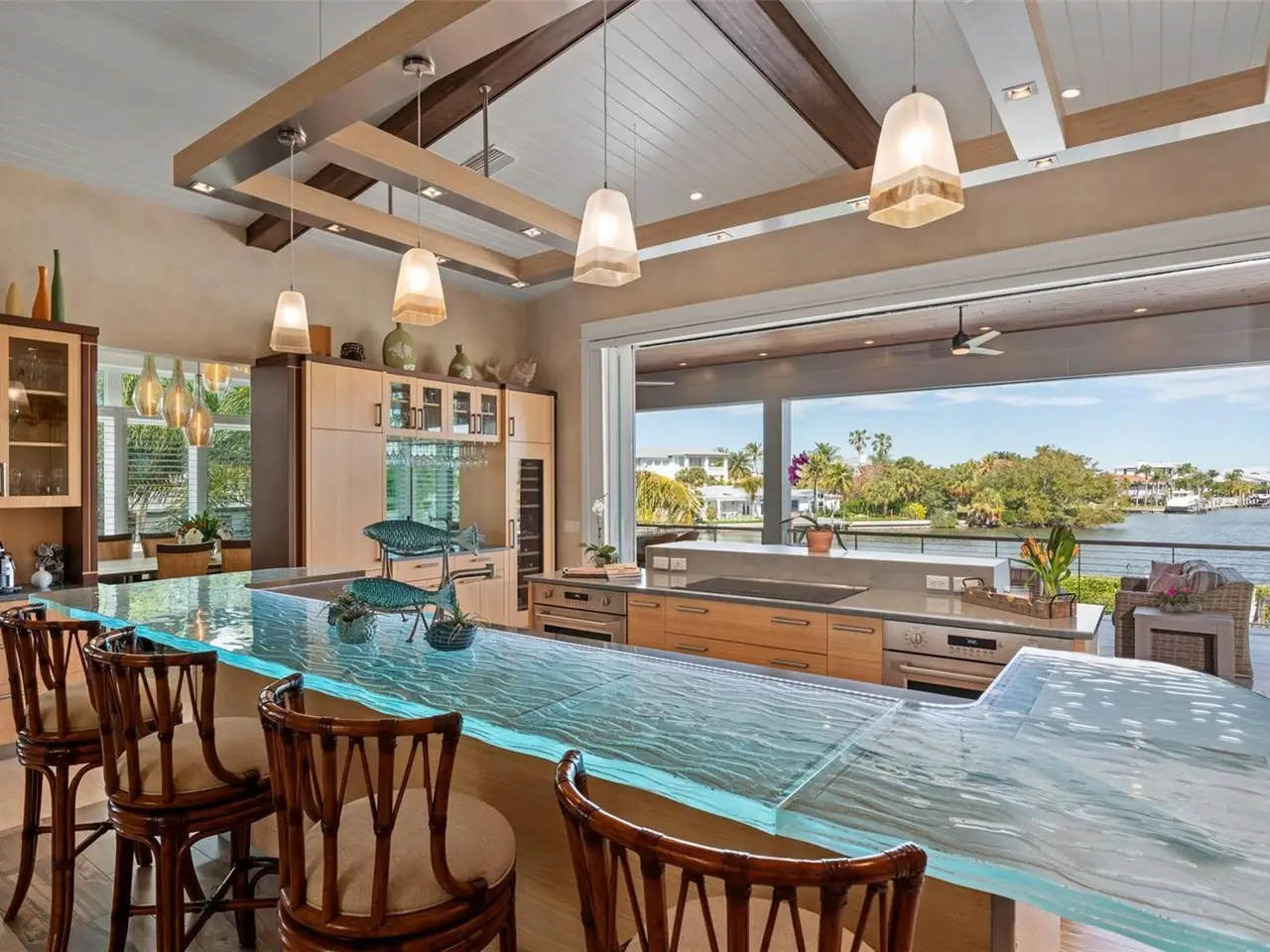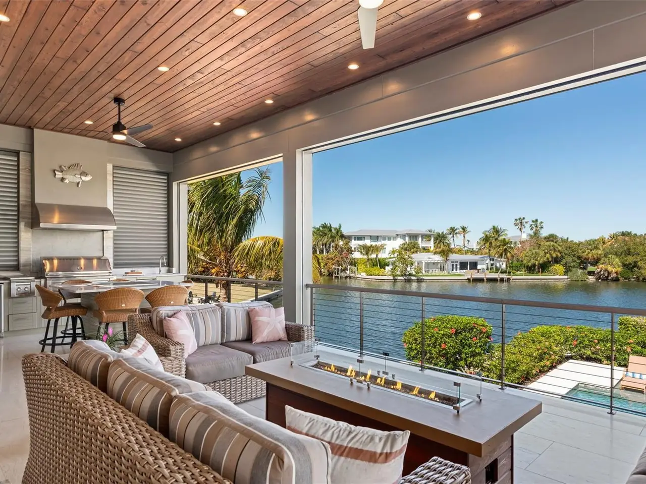 A rare opportunity now exists to own what has been described by many as one of the most beautiful homes on Anna Maria Island. This remarkable family estate has it all: location, architectural beauty and quality, elevated construction. In a sea of homes renovated or built for rental income, this property stands out as a true family residence, constructed to withstand the storms, yet take advantage of the beautiful Florida weather. Newly built in 2020, the spectacular home is set on a stunning triangular, gated property with over 500 feet of water frontage. It is located on the only street on the island that directly accesses both the famous beaches of Anna Maria and the pristine boating waters of Bimini Bay. With Anna Maria’s ideal climate, this home brings a seamless flow between indoor and outdoor living. The 3850 feet luxury air conditioned, elevated home combines with a further 4000 feet of covered and finished living space, to create an expansive family residence that is ideal for entertaining guests. Stepping out of the elevator into the huge vaulted great room, you are met with spectacular views over Bimini Bay. The stunning chef’s kitchen, with imported cabinetry and illuminated glass countertops, adjoins the family dining room with seating for ten and a living room with a fireplace for the occasional cool winter night. Throughout the home, imported cabinetry and Tahitian-inspired finishes reflect craftsmanship and thoughtful design. When not needed, a 20ft set of hurricane safe glass doors disappear into the outdoor walls, allowing a seamless flow from the kitchen onto the massive covered lanai The 800 square foot lanai, with retractable screens, is home to a full outdoor kitchen, a Teppanyaki cooking table with seating for eight, a built in fire table, outdoor dining and seating areas, and it has direct access to the elevated spa. All of this with spectacular views of Bimini Bay, over the resort-style pool below, the tropical gardens, fire and water features, and a waterfront “beach” fire pit, where family and guests gather beneath the stars. In the main house, there are two luxurious primary bedrooms enhanced with full ensuites, while in the guest house, connected by a covered bridge, there are two additional bedrooms, a full bathroom and a kitchenette providing a private retreat for your guests or the grandkids! A 20-foot dock is ideal for launching the Kayaks or SUP, while serious boating enthusiasts will appreciate 500 feet of new concrete reinforced seawall, a 60-foot boat dock, and a 12,000 lb. boatlift, with direct access to Tampa Bay and the Gulf of Mexico. This estate truly represents one of the island’s most distinguished offerings. Private viewings are available exclusively by appointment. Meanwhile, you are welcome to enjoy a narrated video preview at the property’s private website, amidreamhome.com.