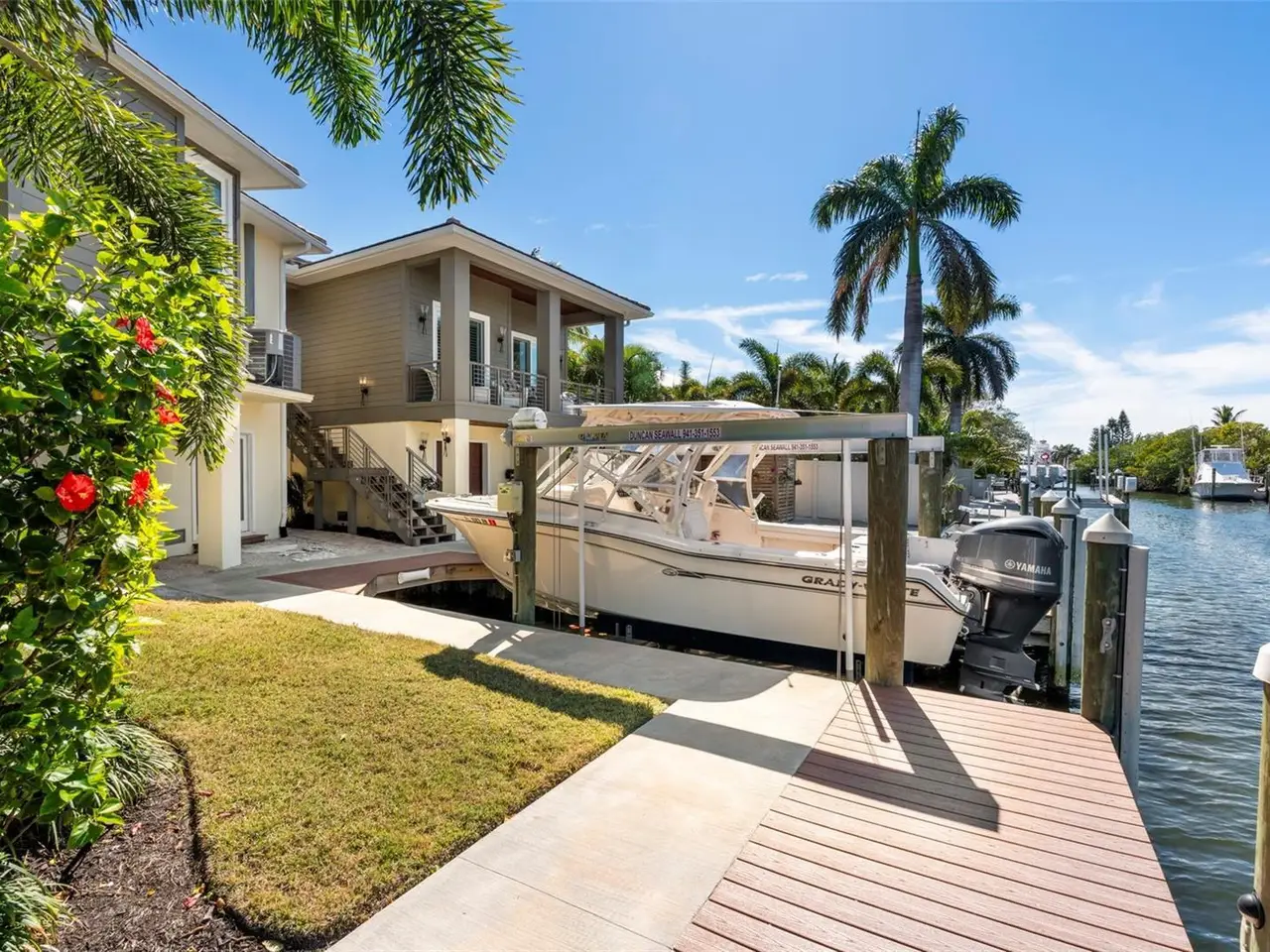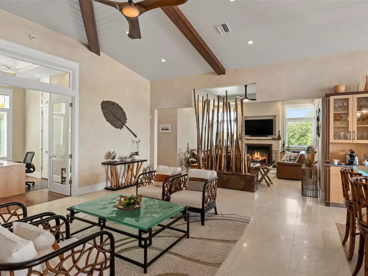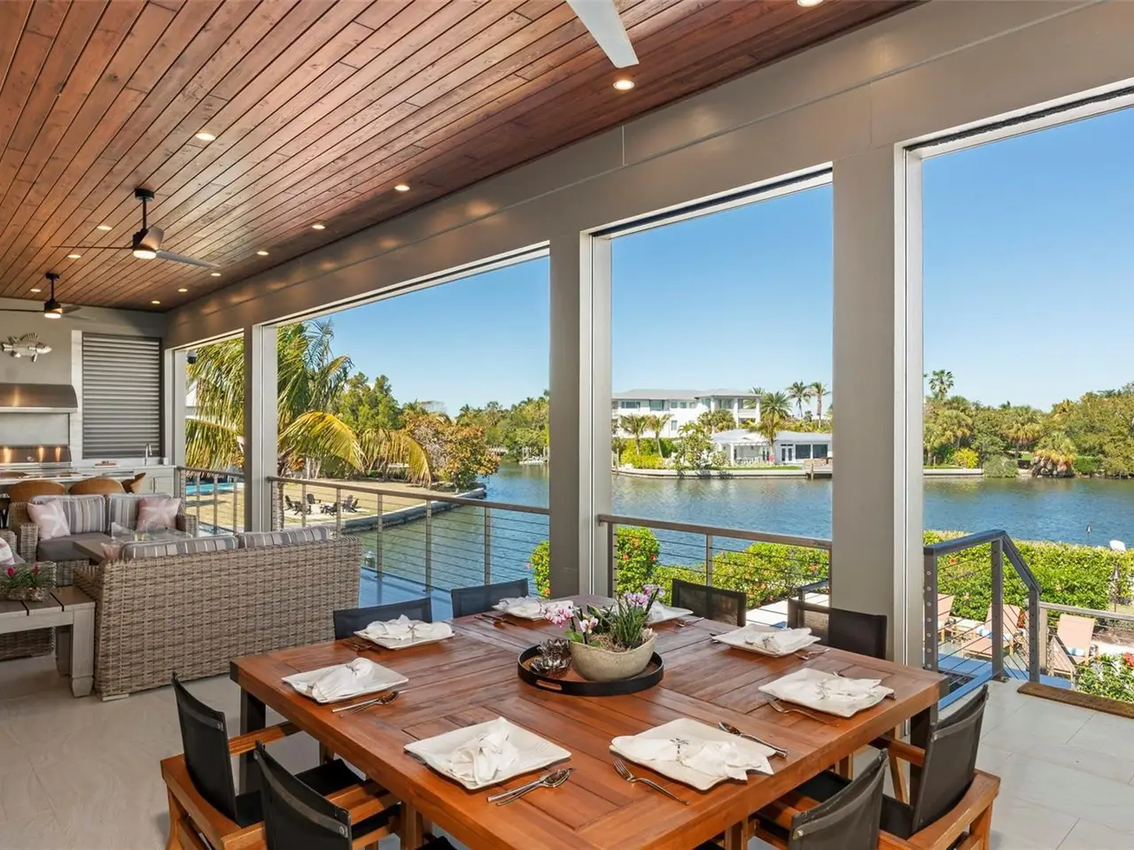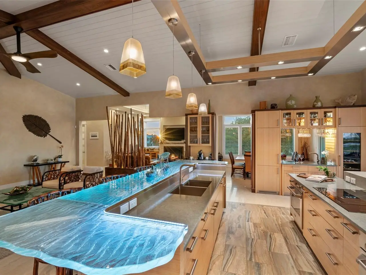 A rare opportunity now exists to own what has been described by many as one of the most beautiful homes on Anna Maria Island. This remarkable family estate has it all: location, architectural beauty and quality, elevated construction. In a sea of homes renovated or built for rental income, this property stands out as a true family residence, constructed to withstand the storms, yet take advantage of the beautiful Florida weather. Newly built in 2020, the spectacular home is set on a stunning triangular, gated property with over 500 feet of water frontage. It is located on the only street on the island that directly accesses both the famous beaches of Anna Maria and the pristine boating waters of Bimini Bay. With Anna Maria’s ideal climate, this home brings a seamless flow between indoor and outdoor living. The 3850 feet luxury air conditioned, elevated home combines with a further 4000 feet of covered and finished living space, to create an expansive family residence that is ideal for entertaining guests. Stepping out of the elevator into the huge vaulted great room, you are met with spectacular views over Bimini Bay. The stunning chef’s kitchen, with imported cabinetry and illuminated glass countertops, adjoins the family dining room with seating for ten and a living room with a fireplace for the occasional cool winter night. Throughout the home, imported cabinetry and Tahitian-inspired finishes reflect craftsmanship and thoughtful design. When not needed, a 20ft set of hurricane safe glass doors disappear into the outdoor walls, allowing a seamless flow from the kitchen onto the massive covered lanai The 800 square foot lanai, with retractable screens, is home to a full outdoor kitchen, a Teppanyaki cooking table with seating for eight, a built in fire table, outdoor dining and seating areas, and it has direct access to the elevated spa. All of this with spectacular views of Bimini Bay, over the resort-style pool below, the tropical gardens, fire and water features, and a waterfront “beach” fire pit, where family and guests gather beneath the stars. In the main house, there are two luxurious primary bedrooms enhanced with full ensuites, while in the guest house, connected by a covered bridge, there are two additional bedrooms, a full bathroom and a kitchenette providing a private retreat for your guests or the grandkids! A 20-foot dock is ideal for launching the Kayaks or SUP, while serious boating enthusiasts will appreciate 500 feet of new concrete reinforced seawall, a 60-foot boat dock, and a 12,000 lb. boatlift, with direct access to Tampa Bay and the Gulf of Mexico. This estate truly represents one of the island’s most distinguished offerings. Private viewings are available exclusively by appointment. Meanwhile, you are welcome to enjoy a narrated video preview at the property’s private website, amidreamhome.com.