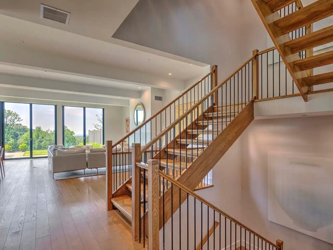 • Expansive Pella window walls capturing panoramic countryside vistas
