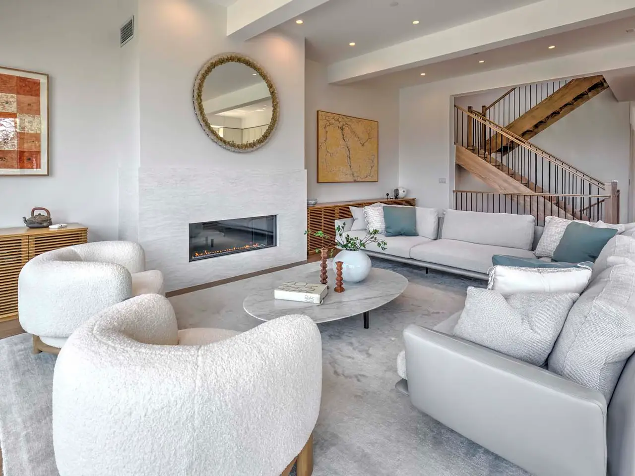 • Contemporary gas fireplace clad in Cambria quartzite