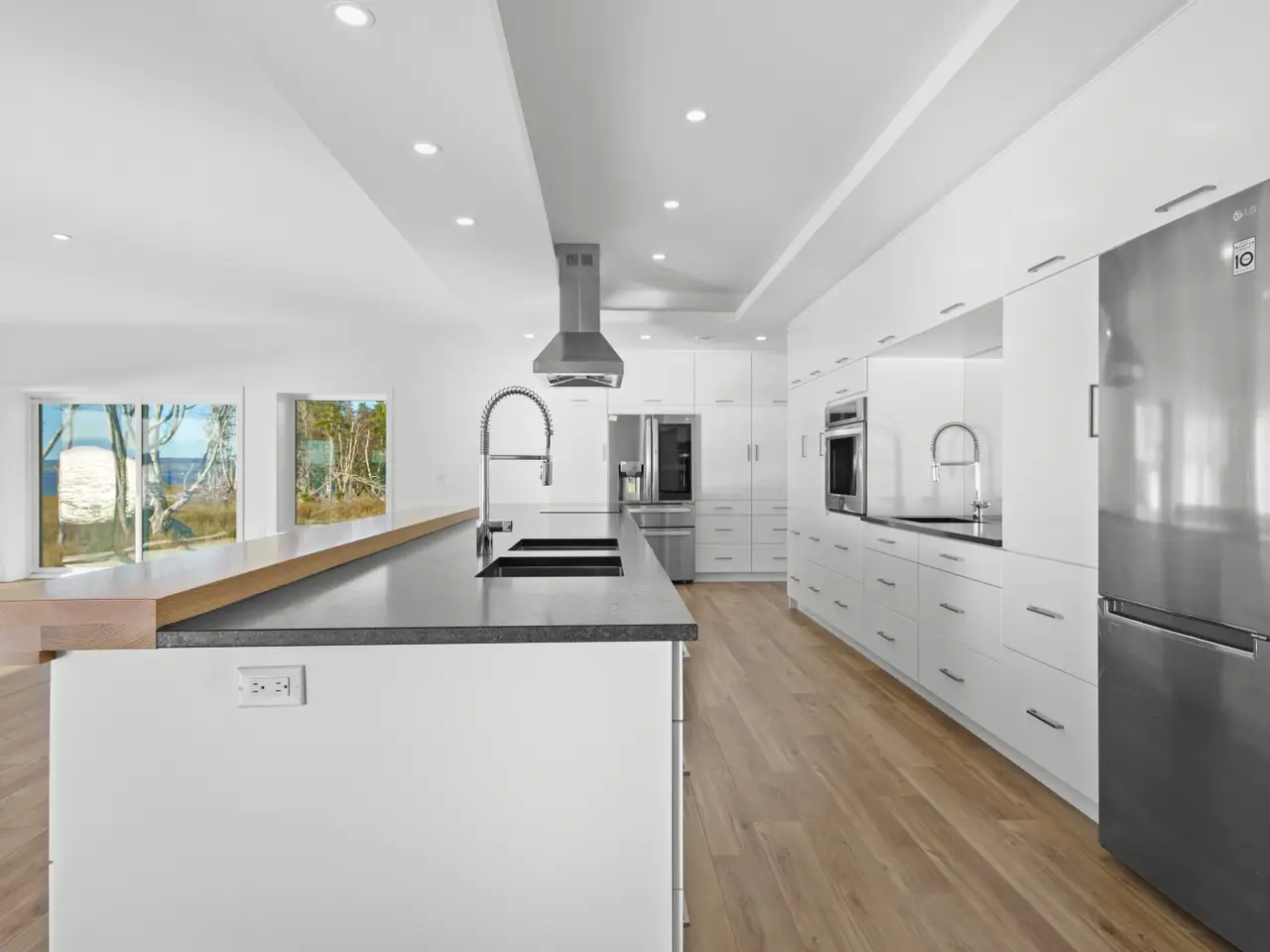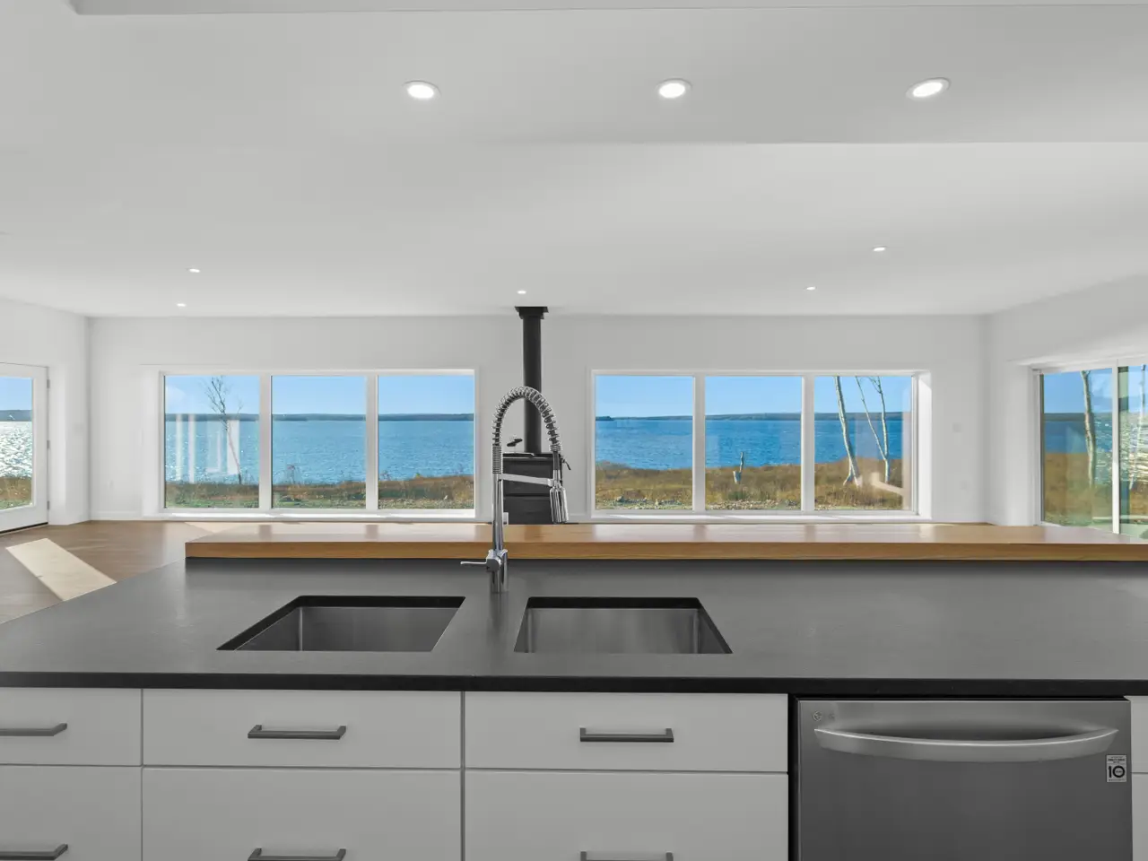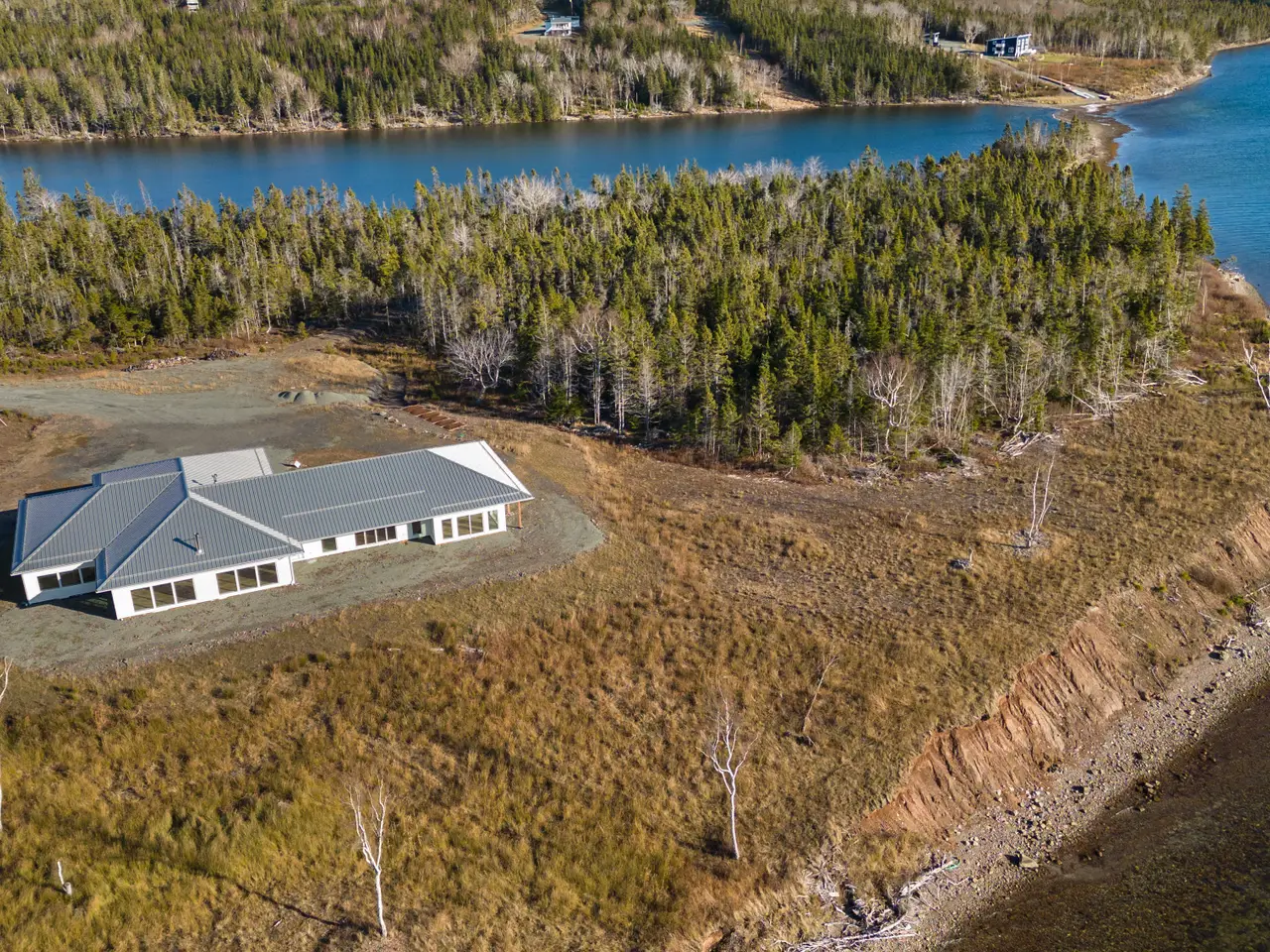 Exclusive lakefront private estate facing 1.26 km of Bras d'Or Lake shoreline with own sand beach. Custom-built luxury 5,000 square foot bungalow (completed in 2024) offers the perfect layout for one-level living. The 35.5 acres of land are divided into 12 parcels, each with its own waterfront. Prime location, highly private, and just a 40-minute drive to Sydney or 45 minutes to Port Hawkesbury and the mainland. Three famous golf courses are easily accessible. This bright, sun-filled, lakefront modern-style home is exceptional, offering countless features. The open-concept design seamlessly connects the kitchen, dining, and living areas, making it perfect for entertaining or relaxing with family while enjoying stunning views of Bras d'Or Lake. The open concept layout allows you to enjoy the lake view from all areas Enjoy the convenience of entering your home from the attached triple car garage, especially during the colder months, with direct access to your mudroom, shower and pantry. Kuuma Indoor Sauna. Generator-Generac RD048Kw. This estate has so much to offer—just book your viewing and start living your dream!