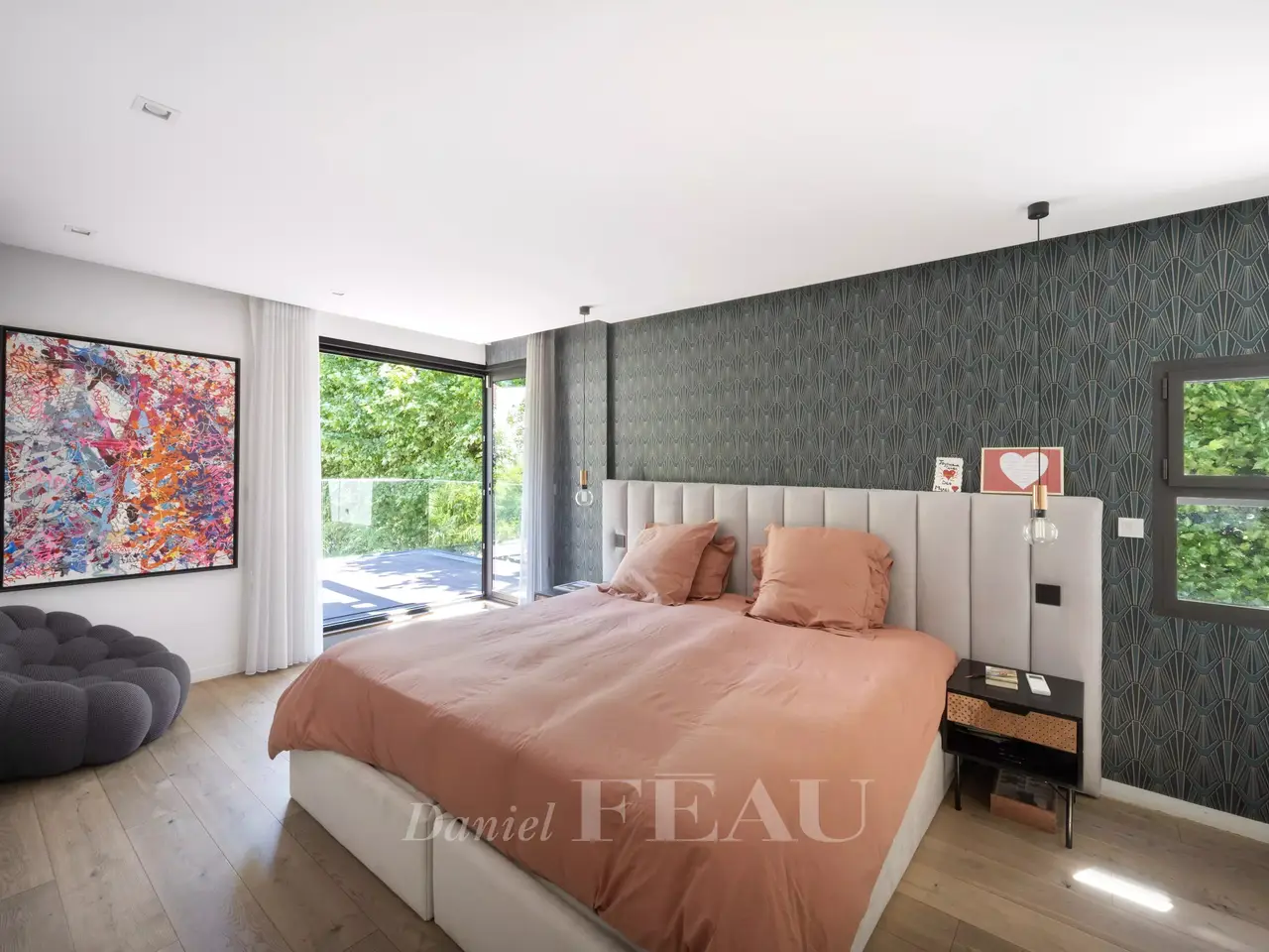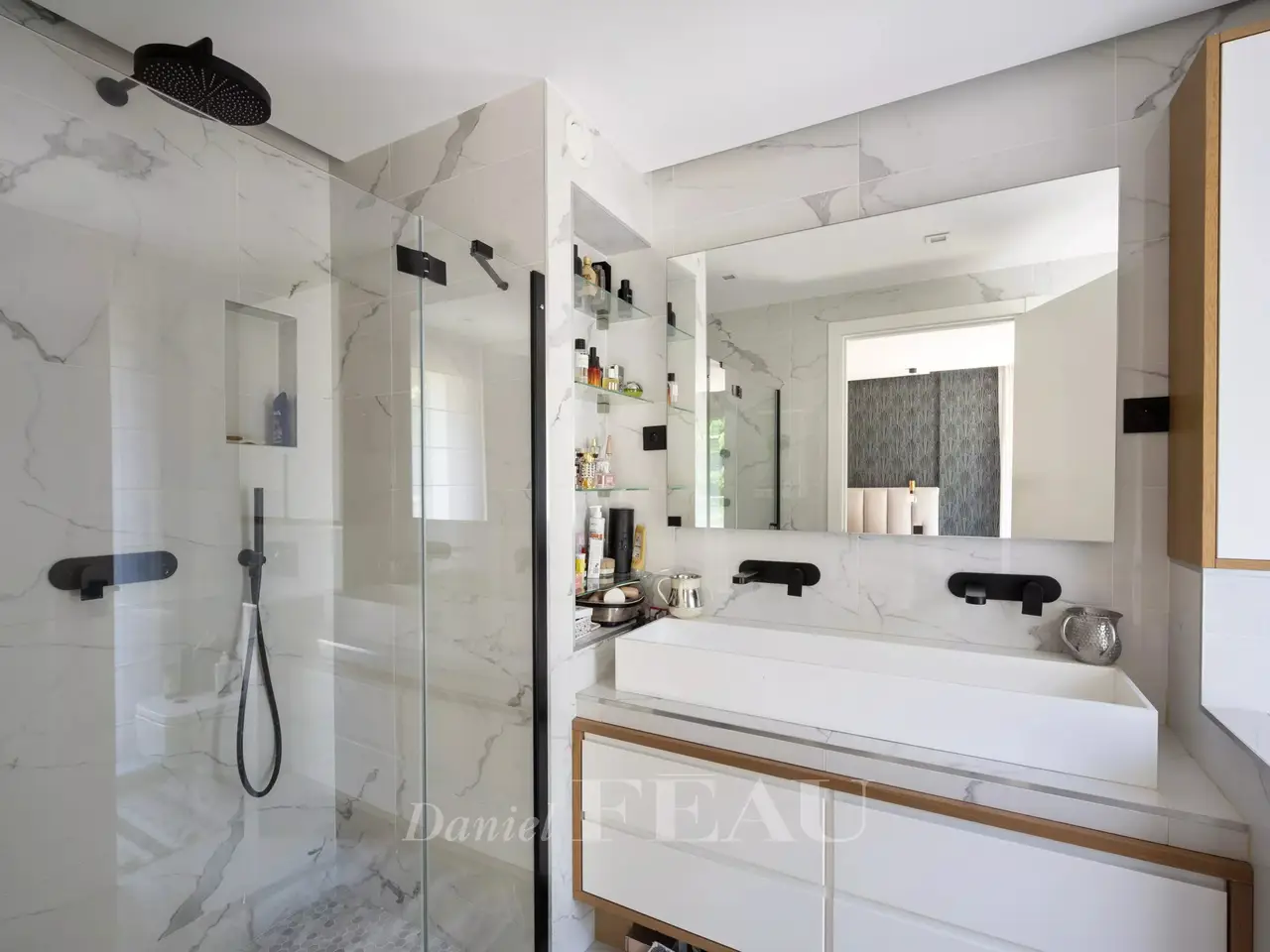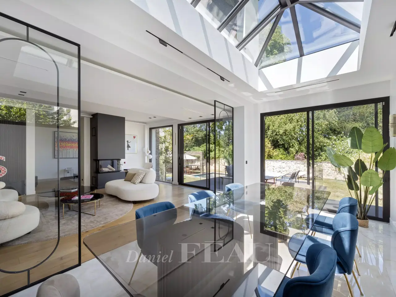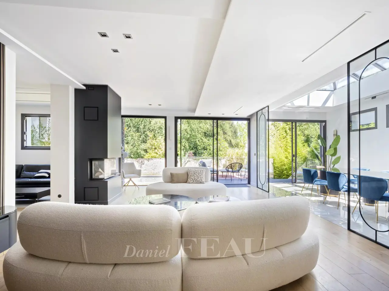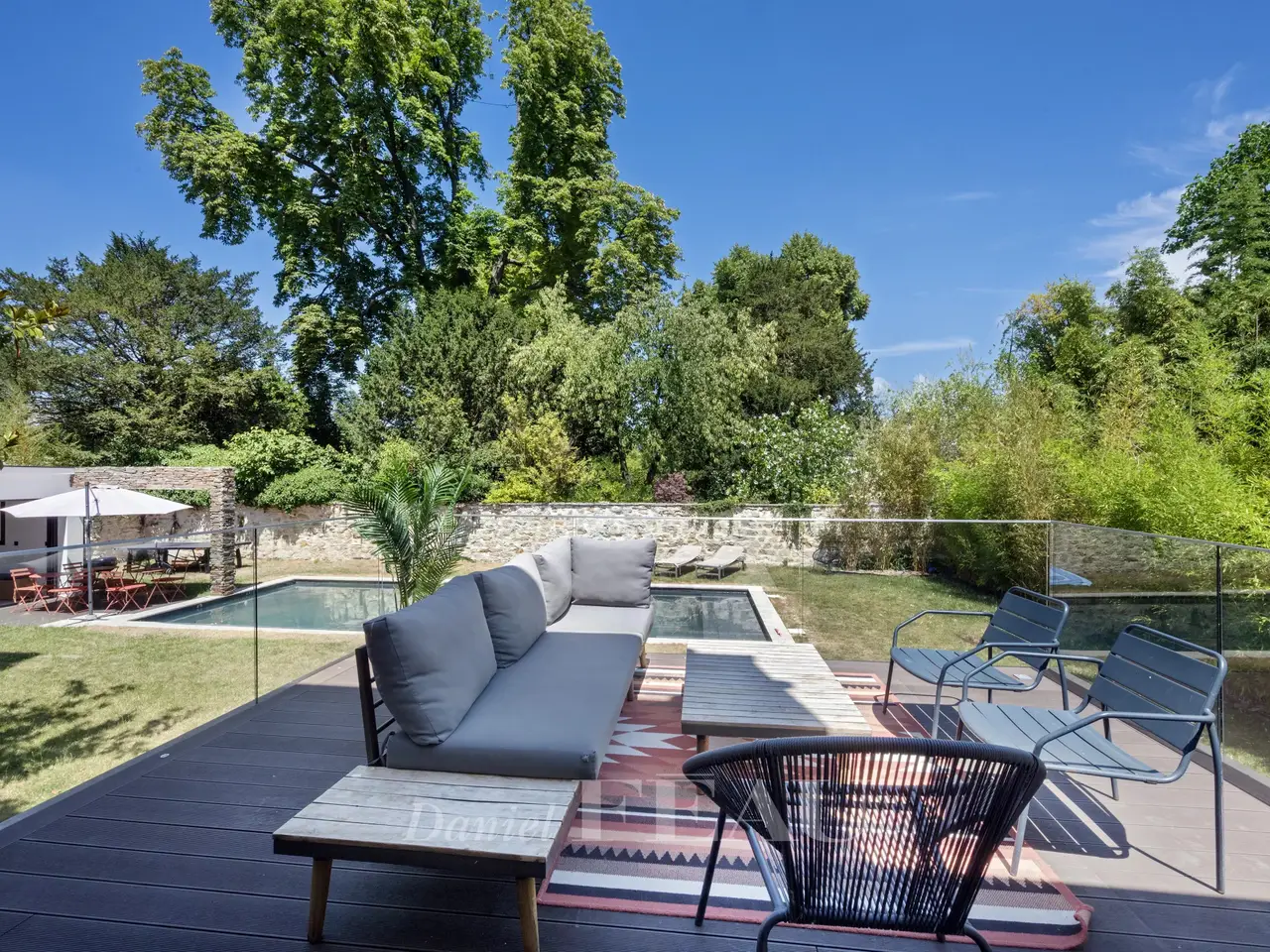 Contemporary Architect-Designed House in La Varenne Saint-Hilaire – Just Steps from the Banks of the Marne Located in the sought-after neighborhood of La Varenne Saint-Hilaire, just a few steps from the banks of the Marne River, this architect-designed house, built in 2018, combines raw concrete and schist for a strikingly contemporary aesthetic. With approximately 400 m² (4,305 sq ft) of living space spread over three levels, this exceptional property sits on a nearly 800 m² (8,611 sq ft) plot, with a 145 m² (1,560 sq ft) building footprint. It also includes a fully equipped 50 m² (538 sq ft) pool house (25 m² on the garden level and 25 m² upstairs). Layout of the spaces: Garden level: Entrance hall with built-in storage Dual-aspect kitchen facing Boulevard de la Marne, with direct access to a first terrace Spacious and bright living room opening directly onto a second terrace and the garden Lounge/study with garden views and direct access Guest toilet with storage Fully equipped technical room: home automation system, distribution panels, thermodynamic water heater, underfloor heating (present on all three levels), centralized air conditioning First floor (sleeping area): 5 bedrooms, including: A master suite with walk-in closet, en-suite bathroom, and access to a private terrace with panoramic Marne views Two bedrooms with private shower rooms Two additional bedrooms with direct access to the terrace 4 bathrooms and 3 separate toilets Pool House (total of 50 m² / 538 sq ft): Open kitchen and living area Bedroom, bathroom, and toilet Natural light-filled basement: Gym with garden access Office with large window overlooking the garden (can serve as an extra bedroom), with adjoining shower room Large storage room with built-in closets Children’s playroom Secondary refrigerator and laundry area Double garage with storage and electric vehicle charging station Outdoor features and amenities: 3 terraces, including one with unobstructed views of the Marne Heated swimming pool (11 x 4.5 m / depth: 1.45 m) with heat pump Landscaped, private garden with no overlooking neighbors This recent home combines contemporary design, functionality, and comfort in a quiet, green setting, just steps from the Marne and the conveniences of La Varenne. The building complies with RT2012 energy regulations.