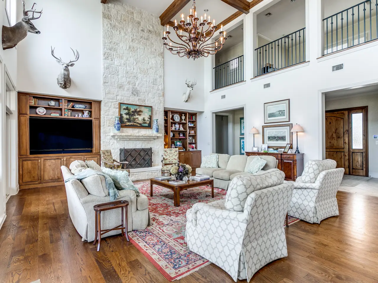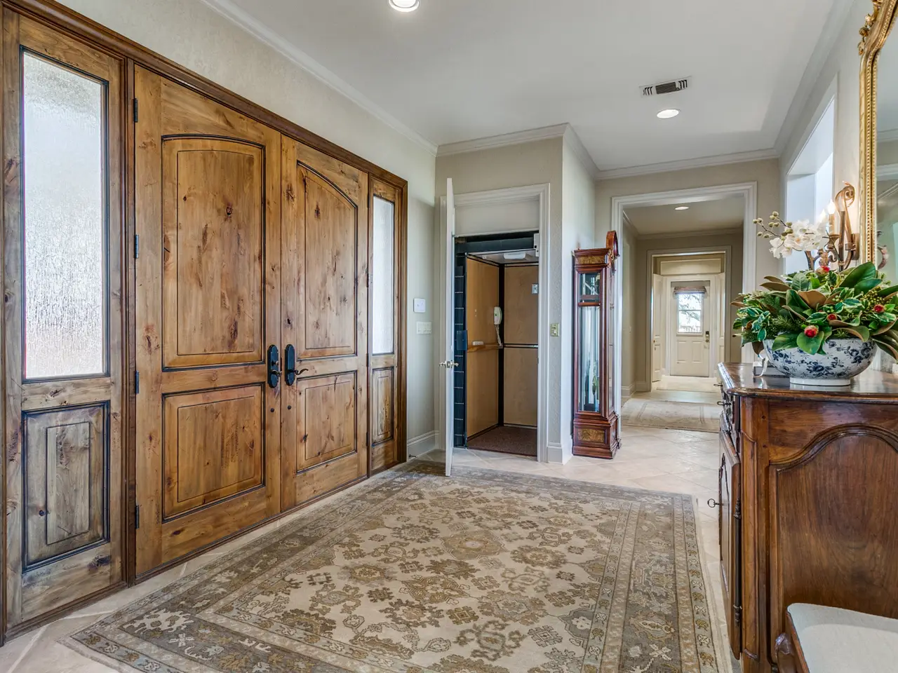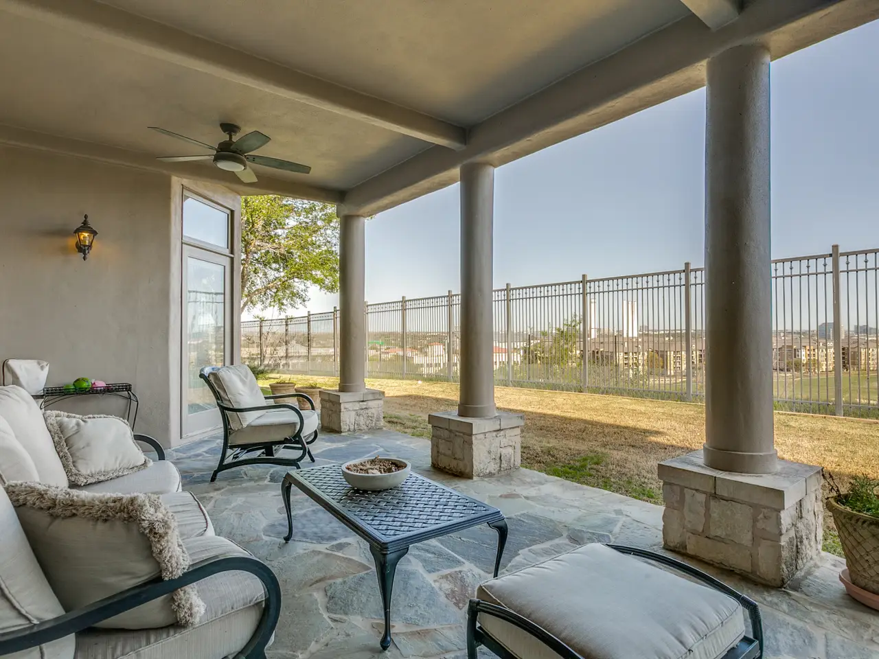 Perched atop a stunning cliff, this exquisite estate in Lincoln Heights offers breathtaking views of San Antonio and the Quarry Golf Course. Step into the impressive 45-foot-long entrance hall, which seamlessly connects the main areas of the home. The grand two-story living room sets the tone for elegance, complemented by a formal dining room perfect for entertaining. A versatile study or fifth bedroom includes a walk-in closet and full bath. The expansive chef's kitchen boasts refrigerator drawers alongside a large built-in refrigerator, double ovens, a spacious gas cooktop, a generous center island with a sink, hidden storage, a built-in bar, a butler's pantry, and an additional walk-in pantry. The primary suite, located on the main level, features separate walk-in closets for ample storage. A secondary bedroom and a mudroom complete the downstairs layout. Upstairs, you'll find three large ensuite bedrooms, a cozy sitting room with a balcony and closet, and an open loft area overlooking the living room below. Additional highlights include an elevator, a fully equipped gym, and abundant storage throughout. The spacious garage and workshop provide even more built-in storage options. This estate is a rare gem that perfectly balances luxury, comfort, and breathtaking surroundings.