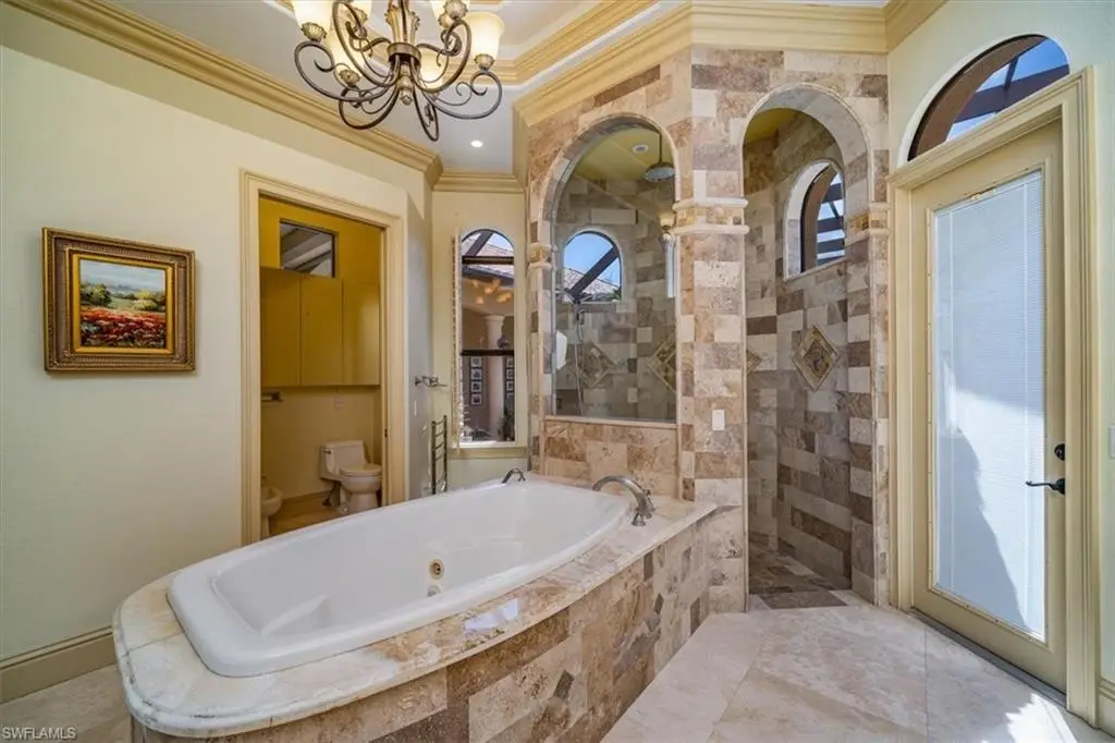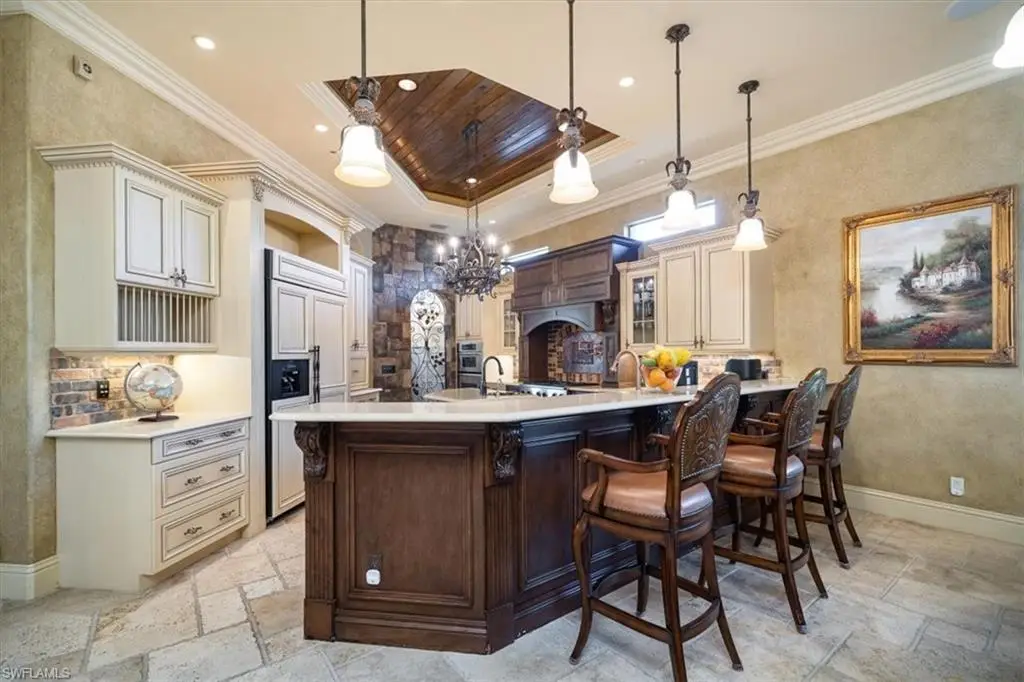 Experience luxury living in this spacious, beautifully appointed 7-bedroom home, designed with superior finishes and stately curb appeal. This exquisite 7,000 square foot property is part of a 2.5-acre fully-fenced gated family compound estate with manicured grounds, accessed via a double electric gated entry. The main house features a charming brick paver driveway, while a separate asphalt drive leads to a large 2,640 sq ft workshop/garage with RV-sized roll-up doors and climate-controlled spaces. This versatile area is perfect for a home-based business, RV, boat, or car collection. Enhancements to the estate include offices, guest suites, and a kitchenette, as well as a magnificent 1,000 sq ft primary bedroom closet with glass-enclosed sections, a cedar-lined room, and a fur vault/wine room. The primary suite also boasts a private spa with steam shower. The living space is enriched by a gas fireplace, and the kitchen is equipped with a six-burner Dacor gas stove and a dual-room pantry. The dining room features a wet bar, while an air conditioned gazebo with wet bar, sink and seating complements the pool and spa area, creating an ideal setting for entertaining. Additional amenities include a water treatment system in a 16x12 CBS building, Croci roll shutters, and generators for both the house and the workshop. This estate offers unparalleled luxury and functionality for discerning buyers.