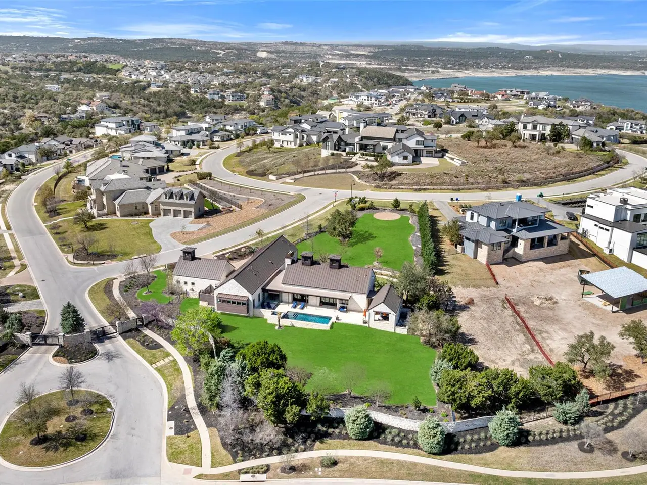 Nestled within the esteemed gated community of the Peninsula at Rough Hollow, this modern farmhouse estate offers a harmonious blend of sophistication and resort-style living on a 1.176-acre lot. Originally built for the 2017 Parade of Homes, this property showcases exceptional craftsmanship, high-end finishes, and seamless indoor-outdoor integration.Upon entering the private courtyard through grand barn doors, you're welcomed by floor-to-ceiling windows that illuminate the expansive great room, dining area, and chef's kitchen. The kitchen boasts top-tier appliances, an oversized center island, and a walk-in pantry. Vaulted ceilings, multiple wet bars, and a dedicated wine room enhance the home's entertainment appeal. The floors, crafted from 100-year-old reclaimed wood, add warmth and character throughout the space.The primary suite serves as a tranquil retreat, offering a spa-like bathroom with dual vanities, a clawfoot tub, and a seamless glass shower with outdoor access. A detached casita with a full bathroom provides versatile space, ideal for guests or as a private office.The outdoor oasis features a negative-edge pool and spa, multiple lounging areas, and a covered kitchen with a fireplace, all overlooking the expansive backyard. The property also includes a glass-enclosed office with panoramic hill country views.Residents enjoy access to Rough Hollow's amenities, including a yacht club and marina, fitness center, and extensive hiking and biking trails. Located within the Lake Travis Independent School District, this property combines luxury living with the natural beauty of the Texas Hill Country.
