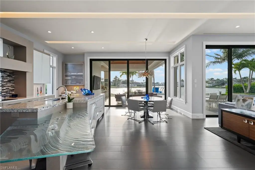 Welcome to your dream retreat in the heart of Coquina Sands - one of Naples' most desirable neighborhoods. Thoughtfully designed by acclaimed architect Stofft Cooney and built by the renowned Toscana Homes, this elevated custom estate (built at over 10 feet) is a boater's dream, offering direct bay access and everything you need for the ultimate waterfront lifestyle. The private dock is fully equipped with a boat lift, kayak launch, water and power hookups, Snook lights, and a fish cleaning station - perfect for sunset cruises or catching dinner right from your backyard. With nearly 1,900 sq ft of open-air deck space, an oversized infinity-edge pool with multi-color lighting, spa, fire pit, and lush landscaping featuring rare tropical trees, the outdoor setting is nothing short of spectacular. Inside, the home makes a striking first impression with a reflection pool and dramatic bay views from the moment you enter. Wide-plank wood flooring flows into the expansive great room, featuring a sleek linear fireplace and two climate-controlled wine cellars holding up to 1,000 bottles. Entertain with ease at the bar with beverage fridge or cook in the show-stopping kitchen with hidden breakfast bar, Sub-Zero and Wolf appliances, steam oven, and high-end European cabinetry. Wake to stunning water views in the main-level master suite, which offers dual walk-in closets, a steam shower, and two water closets. A second bedroom is also downstairs, while the upper level includes three additional bedrooms - or two and a media/game room - all with balcony access and more incredible bay views. Additional features include electric screens and shutters, a summer kitchen, Vantage lighting system, 6 zone Sonos system, electric window shades, built-in audio, 55 solar panels, a full-home generator, and a durable metal roof. This exceptional residence combines expert craftsmanship with unbeatable location and waterfront luxury - a true boater's paradise in the heart of Naples.