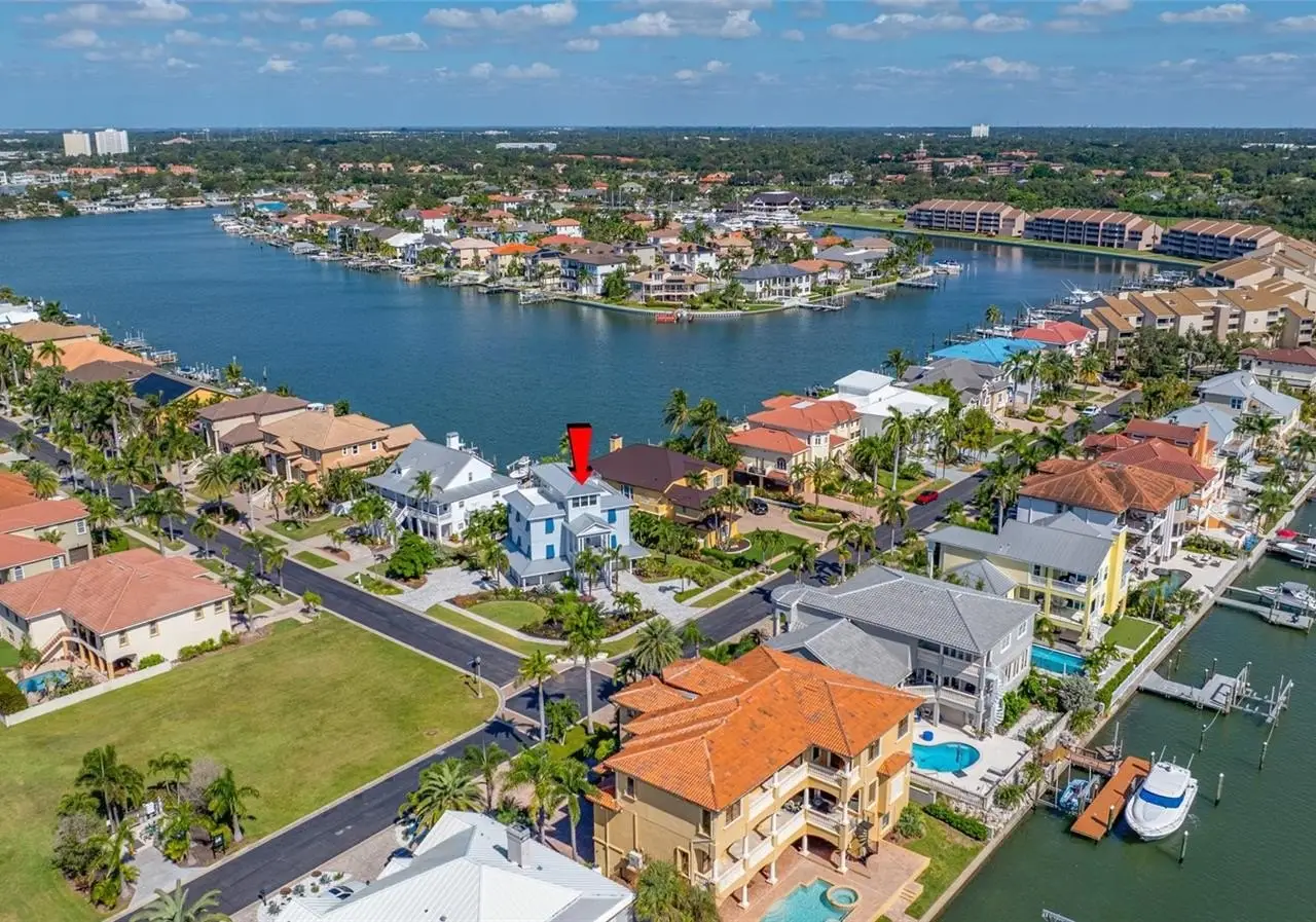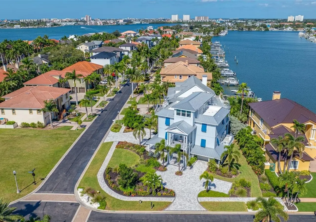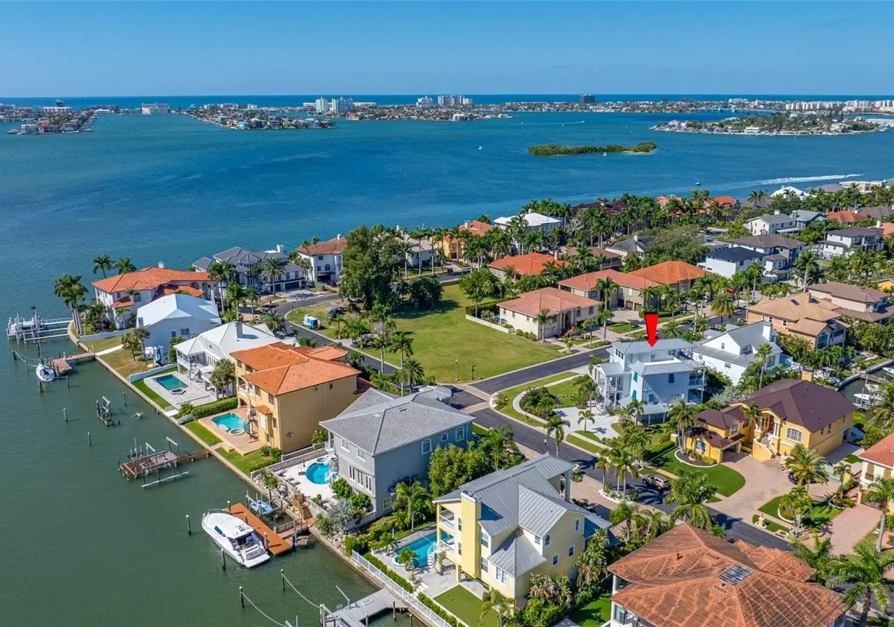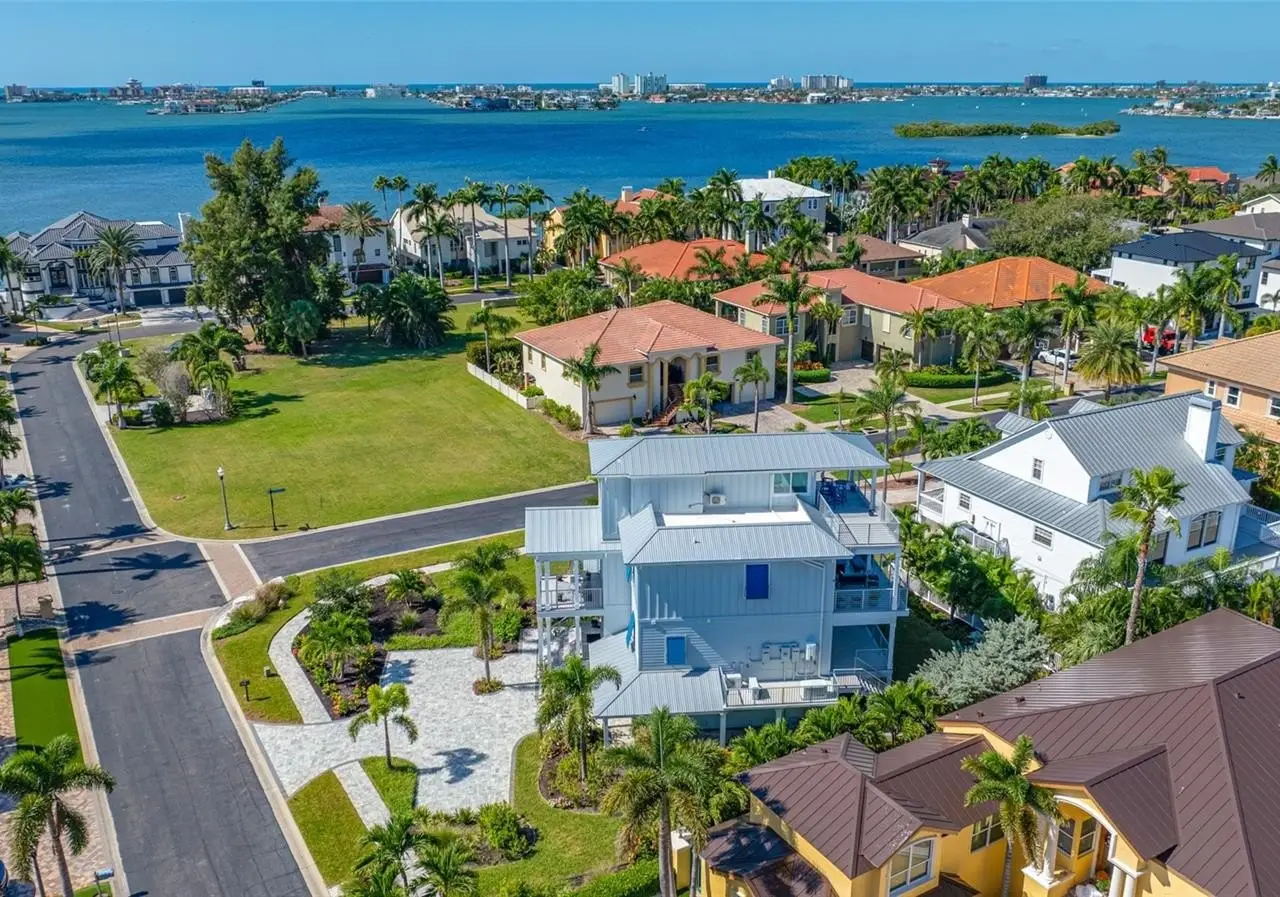 Welcome to this exceptional elevated Key West style 4-bedroom, plus rooftop bonus room, 4-bathroom, 4 car garage custom-built residence with breathtaking views of Boca Ciega Bay, in the prestigious gated Pasadena Yacht & Country Club. The home was completed December 30th 2021 to the highest coastal construction standards and thoughtfully designed to capture the panoramic and coastal views, while offering luxurious living across four levels, which are all serviced by a residential elevator. The grand staircase leads to the main entry with double front doors, setting the tone for the elegance and craftsmanship found throughout. On the first living level, you'll find three spacious bedrooms, including one with its own ensuite, a shared bathroom, a family room or study, and a laundry room. The 2nd living level features a large master suite with ensuite, an open-concept great room with surround sound, dining area, chef’s kitchen with pantry, and a guest bath. Crowning the home is a versatile Cupola on the 3rd level, perfect as an office, guest room, or entertainment area to soak in coastal views, spectacular sunsets, and holiday firework displays. This top-floor retreat is cooled by a dedicated mini-split AC unit. All floors have large balconies. The epoxy-coated garage level accommodates 4 cars plus a golf cart, includes a workshop area, hanging storage shelves, and is pre-wired for EV charging (3 vehicles). This home is packed with high-end features, including but not limited to: York high efficiency, low decibel cooling and heating pump, Lorex security cameras system, all house generator 22kw Generac (propane), 4 level residential elevator, all custom build wood cabinetry with Quartz countertops, automatic rainbird irrigation system via inground well, smart appliances, 250 gl inground propane tank and so much more. The home sustained NO flood damage during the 2024 hurricanes, underscoring its superior construction and resilience. Located within the serene, park-like Pasadena Yacht & Country Club, residents enjoy exclusive access to a world-class golf course, junior Olympic-sized pool, poolside bar/cafe, clubhouse restaurant, fitness center, tennis & pickleball courts, and private marina with boat slips (membership required). The charming coastal town of Gulfport is just a 15-minute walk away, offering boutique shopping, dining, and a popular weekly market. The home also enjoys convenient access to I-275, connecting you quickly to Tampa or Sarasota airports, Fort De Soto National Park, and the pristine beaches of St. Pete, Madeira, and Clearwater. This is more than a home, it's a lifestyle of coastal luxury, comfort, and community, perfect for families, retirees, and anyone seeking the best of Florida living.