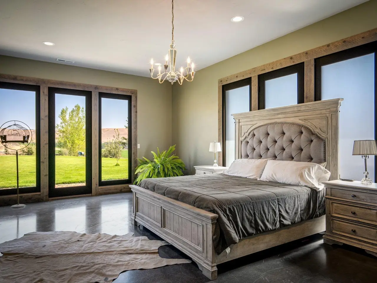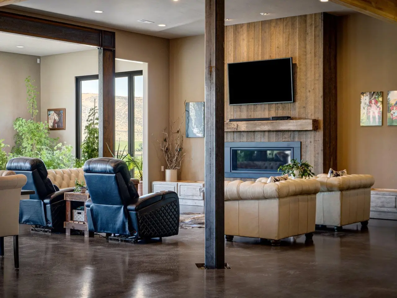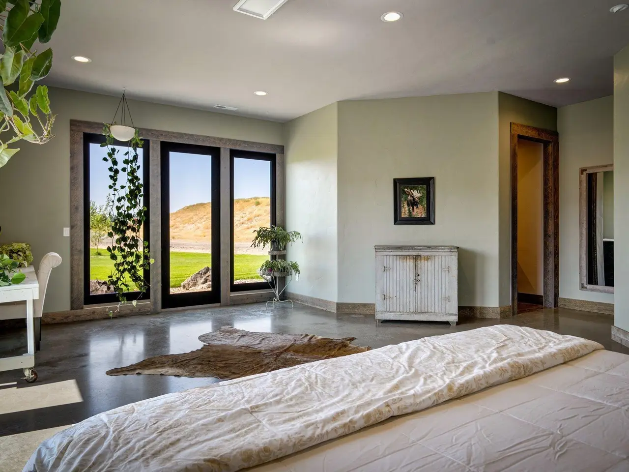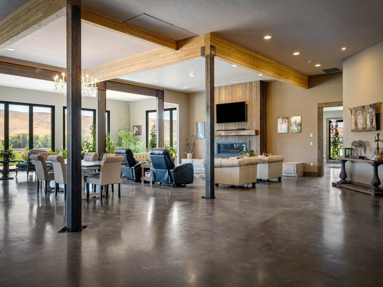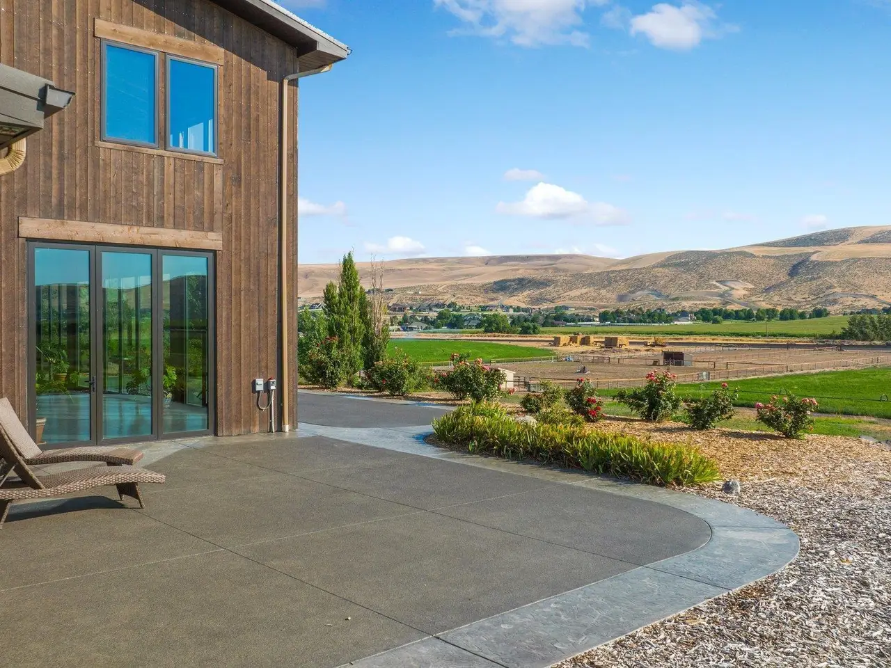 Embrace the rustic charm of country living on this expansive view property that encapsulates the heart and soul of farm life. A span of approximately 46 acres offers both a haven for a myriad of farming and equestrian pursuits, and luxurious countryside dwelling. Surrounded by unparalleled 360-degree views of Badger Canyon is the 7,500 square foot estate home, exuding rustic elegance and offering a seamless blend of character and comfort. The main level spans 5,000 square feet, with an unfinished upper level adding another 2,500 square feet. Two separate two-car garages provide 1,250 square feet of automotive heaven. Unlock a world of indoor-outdoor living with over sixty linear feet of floor-to-ceiling glass panoramic doors and an expansive wrap-around concrete patio. Crafted from Montana Timber Products Ranchwood circle sawn cedar siding, the home effortlessly blends into the surrounding landscape. Step inside and discover the blend of natural elements and modern amenities that make this home so extraordinary. A custom Schonbek crystal chandelier suspended from the twelve-foot ceilings adds elegance and serenity, while the exposed timber and iron beams and hand-stained finished concrete flooring evoke a sense of timelessness and strength to the expansive open-concept design. The kitchen is a chef's dream, with custom soft-closed cabinetry and book-matched backsplash all topped with Brazilian Zumaia quartzite. A commanding seven-foot dual exhaust hood takes center stage, harmonizing with stonework and cabinetry. Designed for culinary enthusiasts and entertaining, the kitchen offers two of everything with dual islands, gas and electric ranges, dishwashers, and refrigerators, and can easily accommodate an entire family of chefs. Explore the 36'x72' workshop, featuring five bays including one pull-through, offering abundant space for diverse uses. Fully insulated and heated, with a RV water and electric hookup on site, and supported by two 200-amp service boxes. The land itself features 24 acres under a pivot, with ten acres in wheel lines, and an additional five acres in solid sets, all in alfalfa. At the heart of the farm, approximately three acres are a dedicated equine facility, featuring five-foot pressure treat and no-climb fencing, a 220'x210' watered riding arena, and a feed and tack shed. For the horses, there are two large turnout areas and four 50'x50' paddocks, each with water, electricity, and matted shelters. Make an appointment today to see the endless possibilities firsthand.