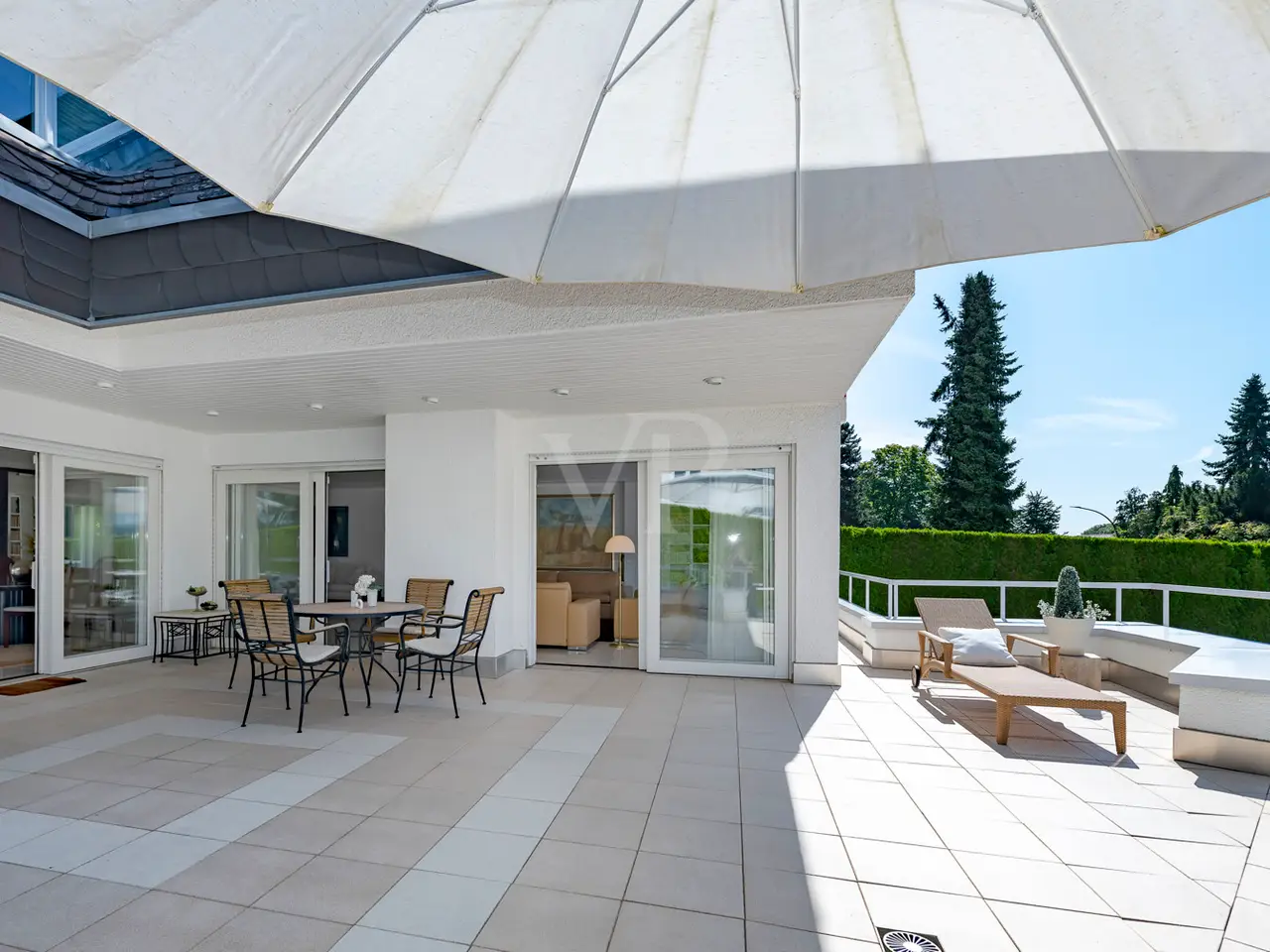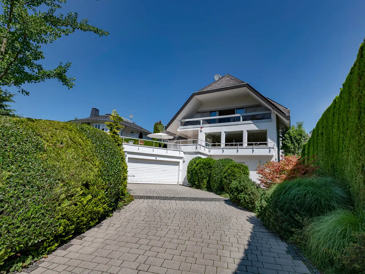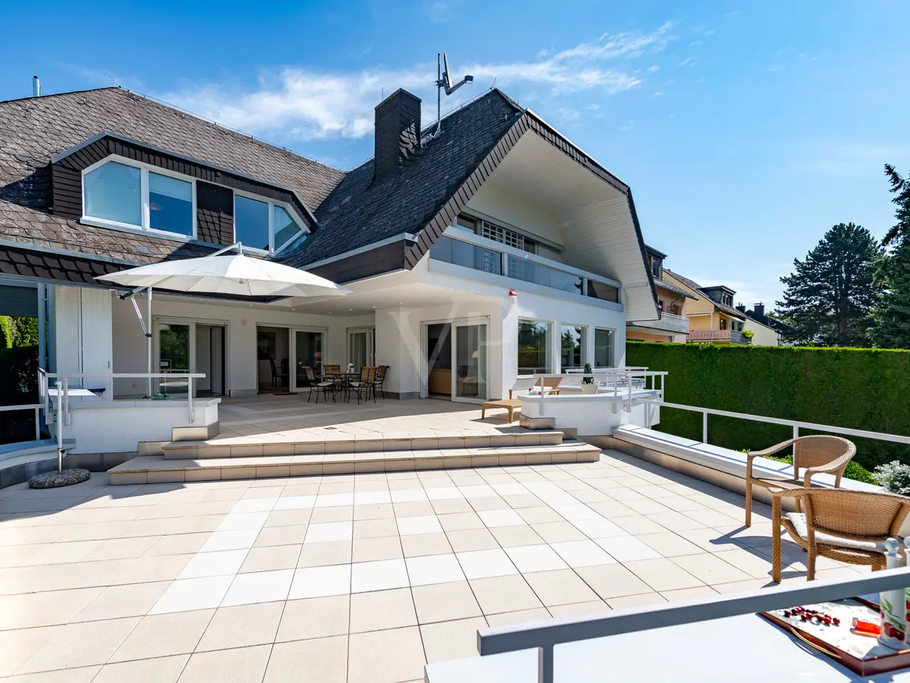 Where character meets space and tranquillity... in this prestigious, timeless entrepreneur's villa you will find not only imposing elegance but also sufficient privacy, both in the house and on the tastefully landscaped grounds! Are you looking for an individual retreat in a quiet location? Then you will find your time-out from everyday life with your large family here in Georgenborn. In addition to generously proportioned rooms and fascinating views and light axes, this home offers you plenty of space for family members, a home office, guest or leisure area.... You will be impressed by the timeless, functionally sophisticated room layout, high-quality materials and the beautifully landscaped plot around the two terrace levels! The entrance floor with its representative character impresses with its spacious, open living area with its unobstructed views of the lush garden. From here you can access the two split-level terraces of almost 100m² - the ideal starting point for summer celebrations... The functional kitchen can be extended at any time and, in addition to the practical study or TV room, you will of course also find a guest WC on this level. On the upper floor, the family has their private retreat, master bedroom with master bathroom, dressing room and 2 further rooms for the children as well as a smaller shower room. On the garden level, which can also be accessed through the double garage, there is a spacious granny apartment with its own terrace, kitchen solution, shower room, bedroom and living area with its own access. The highlight of course is the private spa area with a wonderful indoor pool and sauna area - here you can relax from everyday life all year round! Of course, there are also various cellar rooms and a double garage! You enter the property through the electric gate. Please understand that we may request a credit report from you before viewing and look forward to receiving your inquiries!