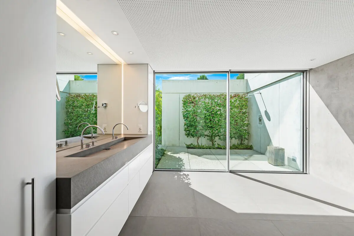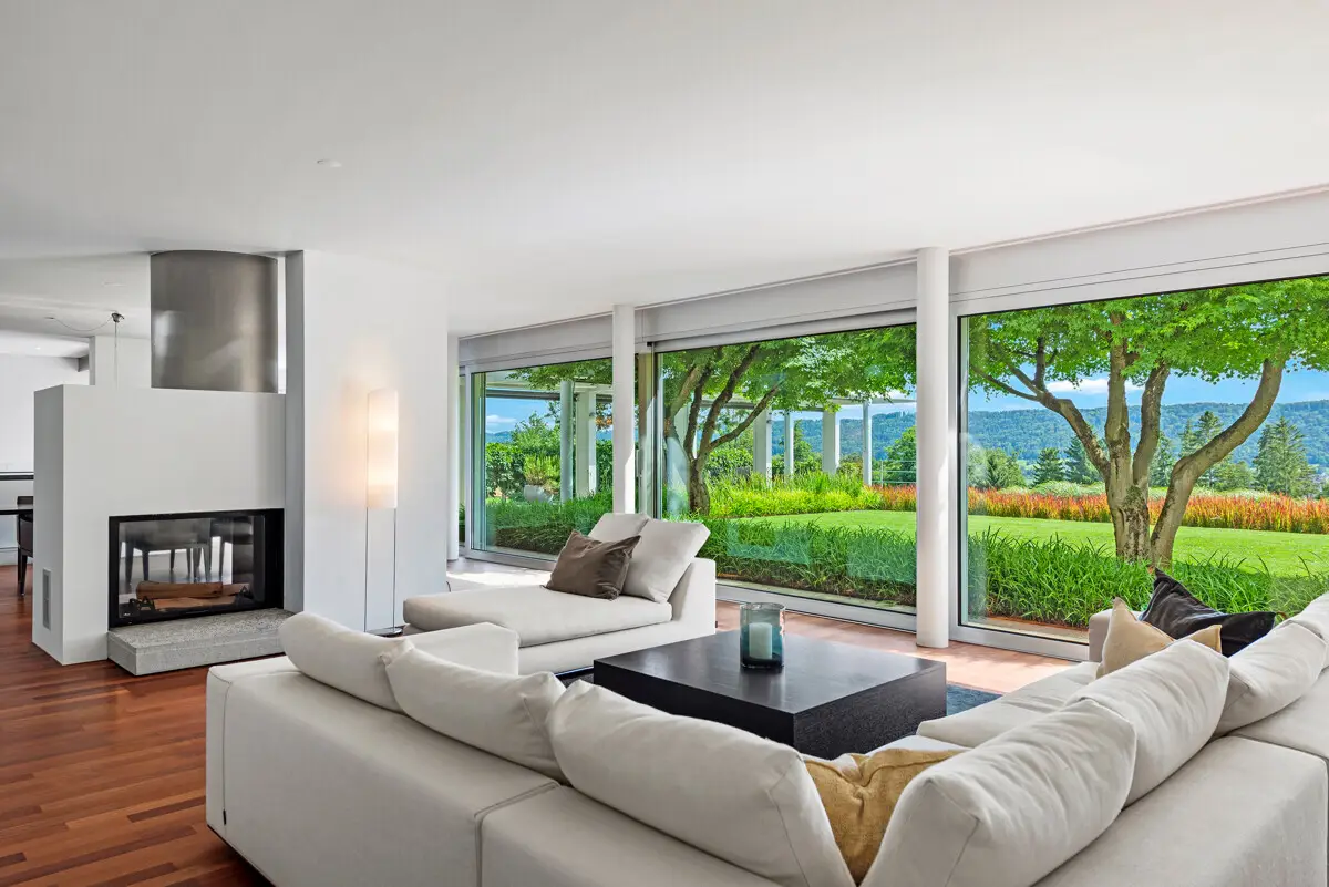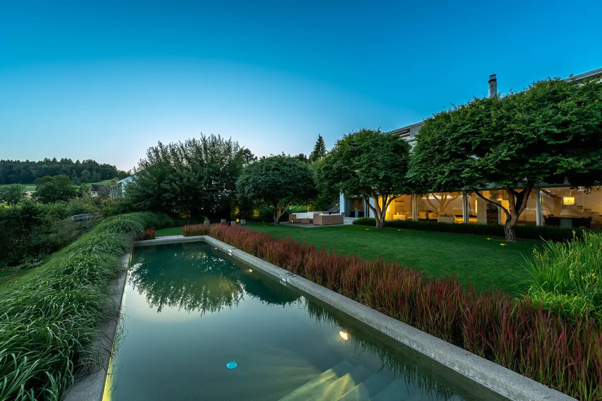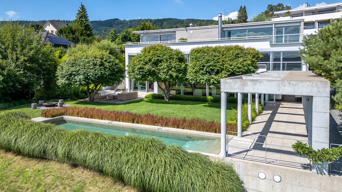 This out-of-the-ordinary property in Boppelsen has undeniable impact with its seamless blend of timeless architecture, a well-conceived interior arrangement and refined elegance. Designed by architect Fausto Form, the detached house features high ceilings, open-plan spaces and an adaptable layout. The integral Bulthaup kitchen connects directly to the bright living and dining area with fireplace and opens across the full width to the beautifully landscaped garden with pool by means of full-height, sliding patio doors. The master suite with sauna, steam bath, fitness zone and generous dressing area provides an unparalleled degree of comfort. A separate studio with kitchenette can be converted into a self-contained flat if required. The choice of finishes is particularly attractive, with warm wood floors and natural stone reflecting the consistently high quality inside and out. The garden, designed by Atelier Enea, is a highlight in itself – with Japanese maple trees, bamboo and blooming hydrangeas forming an elegantly refined outdoor setting. The property - Approx. 371m² of living area - Superior quality of finish - Fireplace - Bulthaup designer-kitchen - Above-average room heights - Wellness zone with spa and steam room - Fabulous, landscaped garden including outdoor pool - Captivating views - Quiet setting with sunny aspect - 2 garage parking spaces fitted with an EV charging point