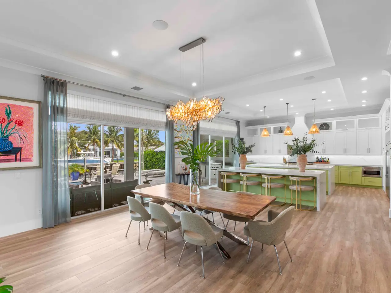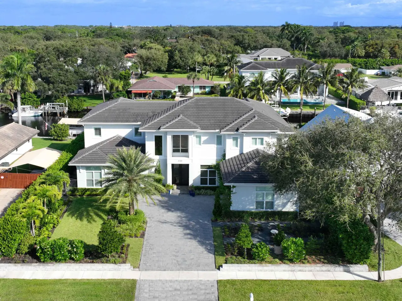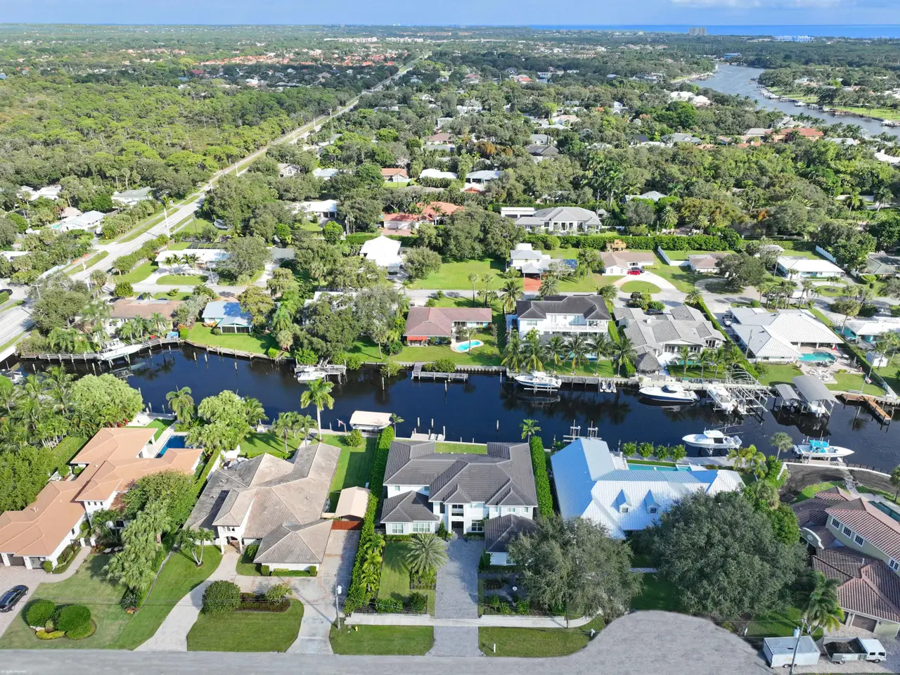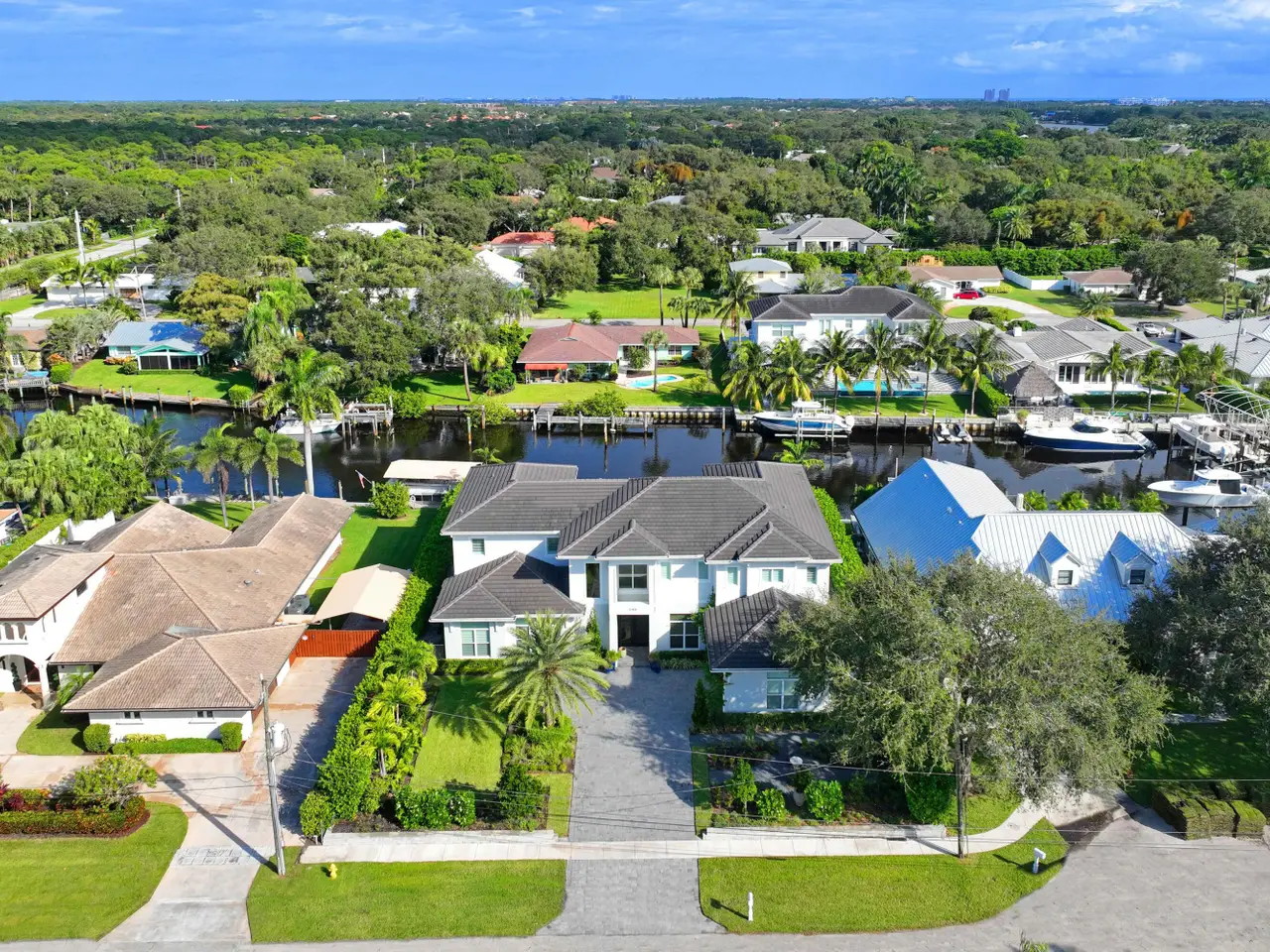 Built new in 2020, this fabulous Palm Beach Gardens Modern Island Smart Home boasts 5 bedrooms and 5.5 baths and over 7900 total sq ft! The open floor plan includes a Gourmet Chef's kitchen with 2 large islands and a huge pantry! A wall of French Doors all open to a massive covered and screened patio with a summer kitchen and a beautiful, heated infinity pool/spa and 100' of waterfront including a boat dock! The primary suite is stunning with a massive bath and huge closets. All the bedrooms upstairs have access to a large open balcony to capture the water views or to watch a sunrise or sunset. The home has high ceilings with recessed lighting, Plantation Shutters, an elevator and a whole house generator. It's a boater's paradise yet just minutes away from everything.