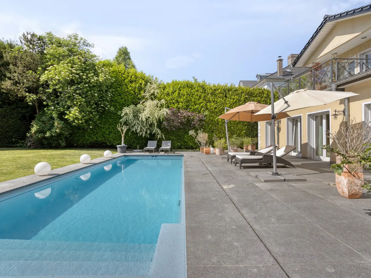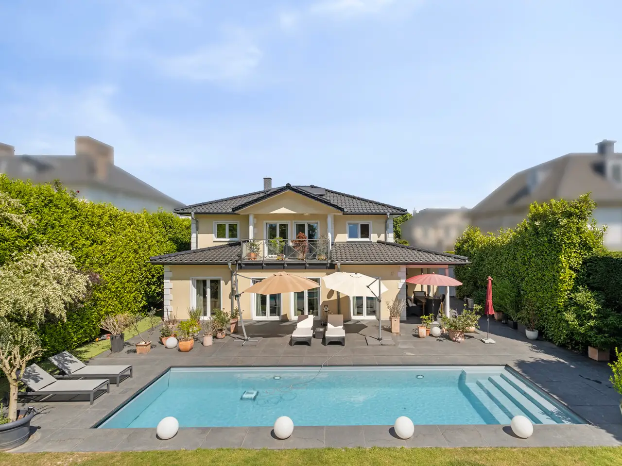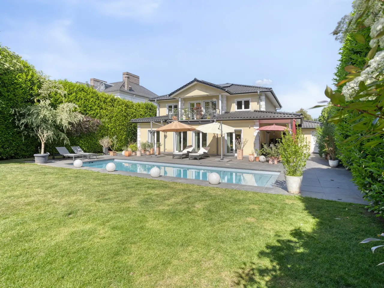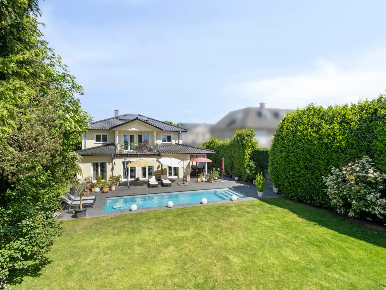 Bring your vacation home, because this villa, built in 2007 on a plot of around 1,175 m², now offers you living at the highest level on approx. 274 m² of living space and a total of 6 rooms, with the heated outdoor pool, the spacious terrace areas and the secluded garden providing a vacation feeling almost all year round. State-of-the-art building technology with fuel cell heating and a photovoltaic system with storage also ensure outstanding energy efficiency. You enter the house via the partially paved front garden, which is enclosed by a fence and wall, through a prestigious reception area into the spacious entrance hall, from where your gaze falls directly onto the high ceilings and the open gallery on the upper floor. From the entrance hall, you enter the kitchen on the left and the guest area with bedroom, small hallway and en-suite shower room on the right. The loft-like living and dining area with around 63 m² of living space is located in front of you. Here, the large marble fireplace creates a cozy atmosphere in winter, while the 5 floor-to-ceiling windows offer a seamless transition to the spacious pool area and garden in summer. This creates interesting axes of light and views, all of which lead through large window fronts into the surrounding garden and pool area. The large terrace by the outdoor pool and a covered outdoor seating area to the side of the house offer plenty of space to enjoy the beautiful days of the year with family and friends. And if you like it sporty, you will find your opponent in the pool's counter-current system. Solar panels in the pool's electric roller cover help to heat the pool in spring. The kitchen is already equipped with a high-quality country-style fitted kitchen and also has a useful storage room and direct access to the double garage. The open-plan staircase leads to the gallery on the upper floor and from there to the four bedrooms on this floor. The air-conditioned master bedroom has a spacious en suite bathroom with shower and bathtub and access to the balcony on this level. All rooms on both the ground and upper floors can be darkened with electric shutters. In the basement, which has a partial cellar, there is a hobby room and the utility room, which also houses the swimming pool equipment. The garden is densely planted and offers plenty of privacy and is barely visible, and is kept wonderfully green with an irrigation system. Next to the pool, an outdoor shower with warm water provides cooling and a small garden shed provides storage space in the outdoor area. The double garage can also be accessed through the garden. This is equipped with an electric door and offers space for further parking spaces in front of it, which are secured from the street by another door. You can also expect high-quality fittings on all levels of the house. Stone and parquet floors, a high-quality fitted kitchen and modern building technology are just a few examples. We cordially invite you to arrange a viewing appointment on site to see the charm and quality of the property for yourself.