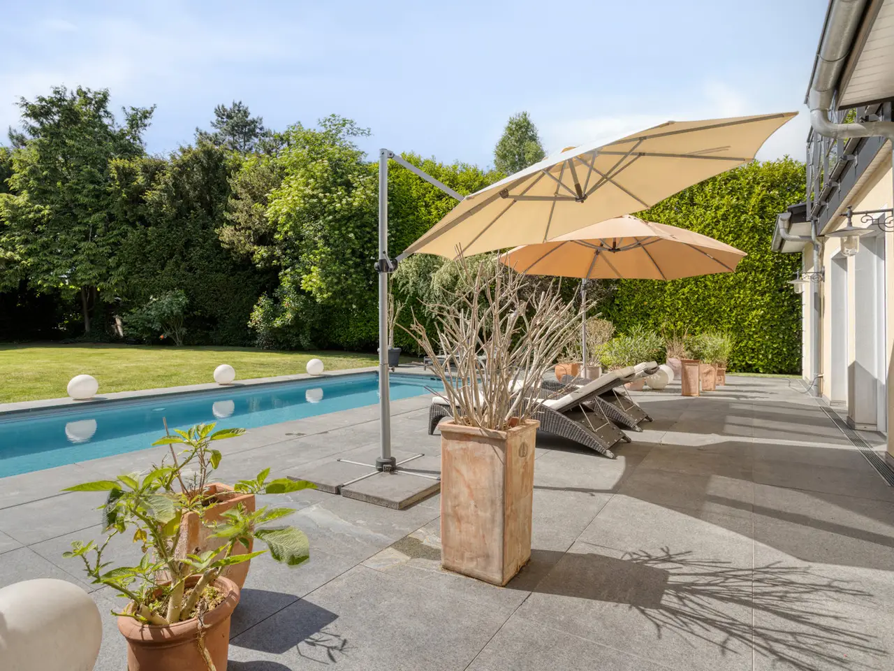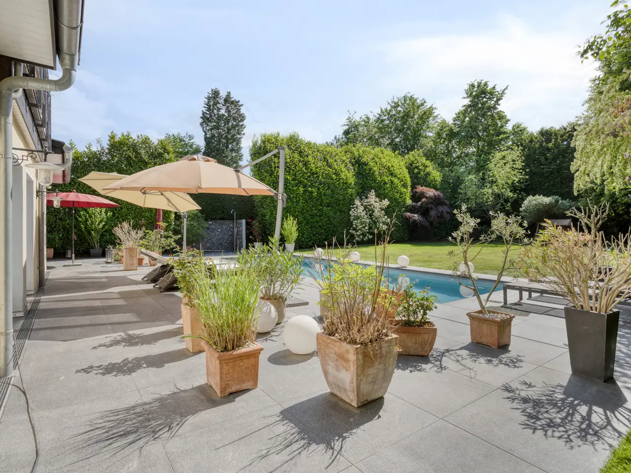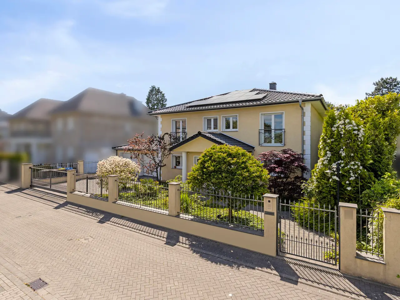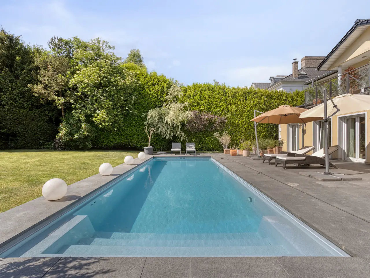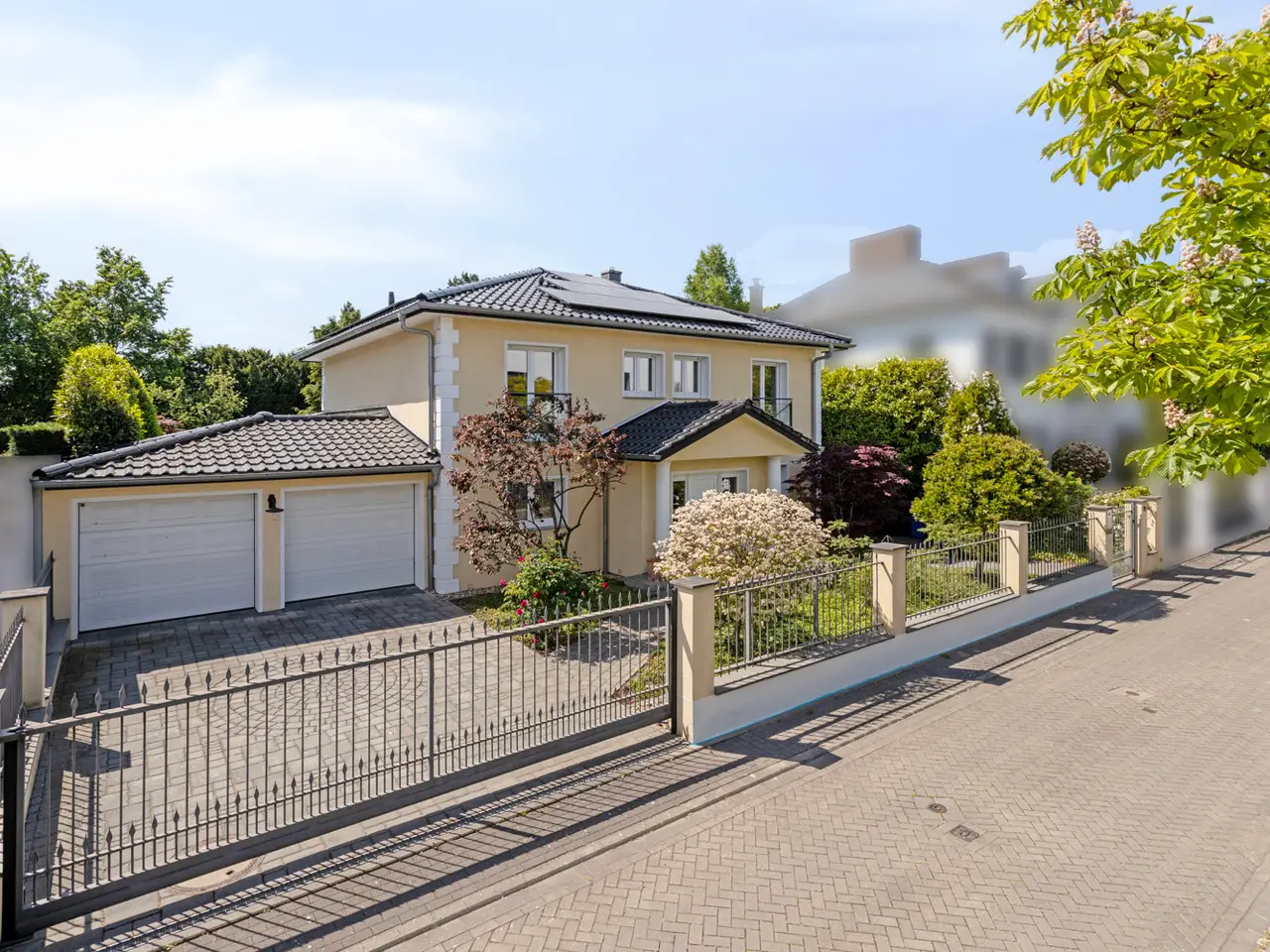 Bring your vacation home, because this villa, built in 2007 on a plot of around 1,175 m², now offers you living at the highest level on approx. 274 m² of living space and a total of 6 rooms, with the heated outdoor pool, the spacious terrace areas and the secluded garden providing a vacation feeling almost all year round. State-of-the-art building technology with fuel cell heating and a photovoltaic system with storage also ensure outstanding energy efficiency. You enter the house via the partially paved front garden, which is enclosed by a fence and wall, through a prestigious reception area into the spacious entrance hall, from where your gaze falls directly onto the high ceilings and the open gallery on the upper floor. From the entrance hall, you enter the kitchen on the left and the guest area with bedroom, small hallway and en-suite shower room on the right. The loft-like living and dining area with around 63 m² of living space is located in front of you. Here, the large marble fireplace creates a cozy atmosphere in winter, while the 5 floor-to-ceiling windows offer a seamless transition to the spacious pool area and garden in summer. This creates interesting axes of light and views, all of which lead through large window fronts into the surrounding garden and pool area. The large terrace by the outdoor pool and a covered outdoor seating area to the side of the house offer plenty of space to enjoy the beautiful days of the year with family and friends. And if you like it sporty, you will find your opponent in the pool's counter-current system. Solar panels in the pool's electric roller cover help to heat the pool in spring. The kitchen is already equipped with a high-quality country-style fitted kitchen and also has a useful storage room and direct access to the double garage. The open-plan staircase leads to the gallery on the upper floor and from there to the four bedrooms on this floor. The air-conditioned master bedroom has a spacious en suite bathroom with shower and bathtub and access to the balcony on this level. All rooms on both the ground and upper floors can be darkened with electric shutters. In the basement, which has a partial cellar, there is a hobby room and the utility room, which also houses the swimming pool equipment. The garden is densely planted and offers plenty of privacy and is barely visible, and is kept wonderfully green with an irrigation system. Next to the pool, an outdoor shower with warm water provides cooling and a small garden shed provides storage space in the outdoor area. The double garage can also be accessed through the garden. This is equipped with an electric door and offers space for further parking spaces in front of it, which are secured from the street by another door. You can also expect high-quality fittings on all levels of the house. Stone and parquet floors, a high-quality fitted kitchen and modern building technology are just a few examples. We cordially invite you to arrange a viewing appointment on site to see the charm and quality of the property for yourself.