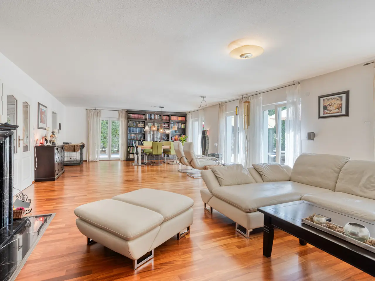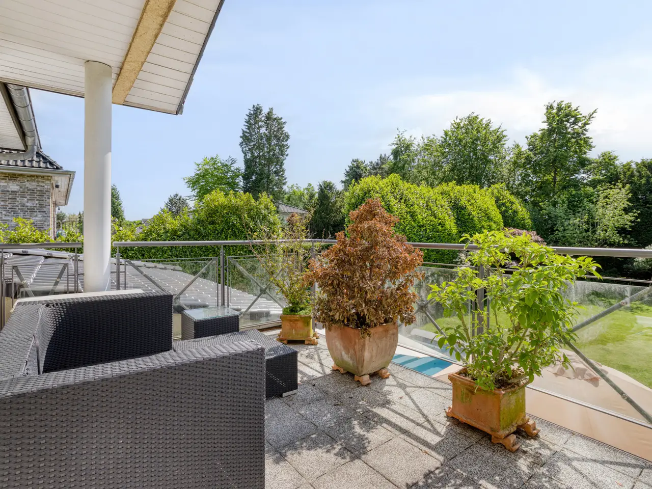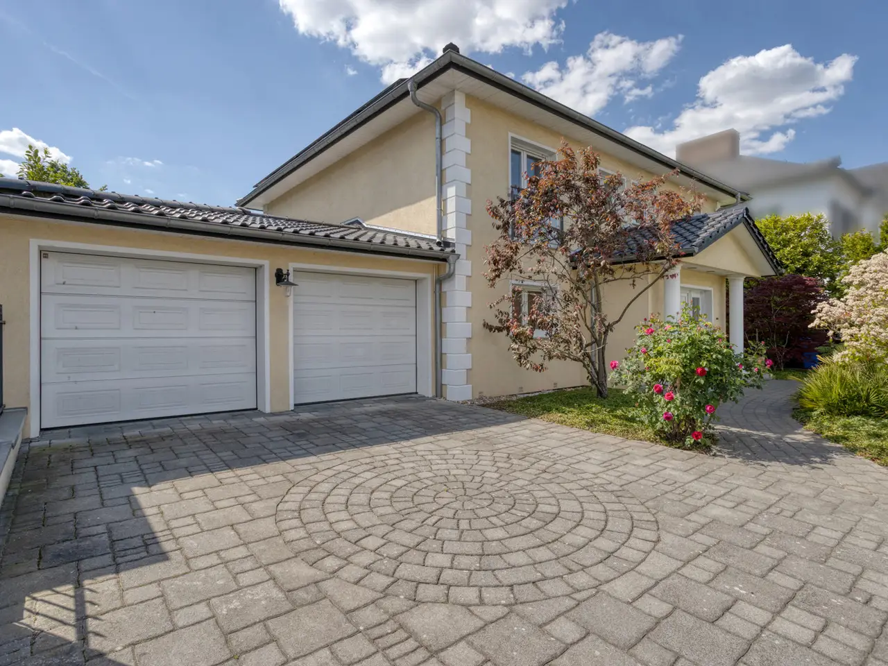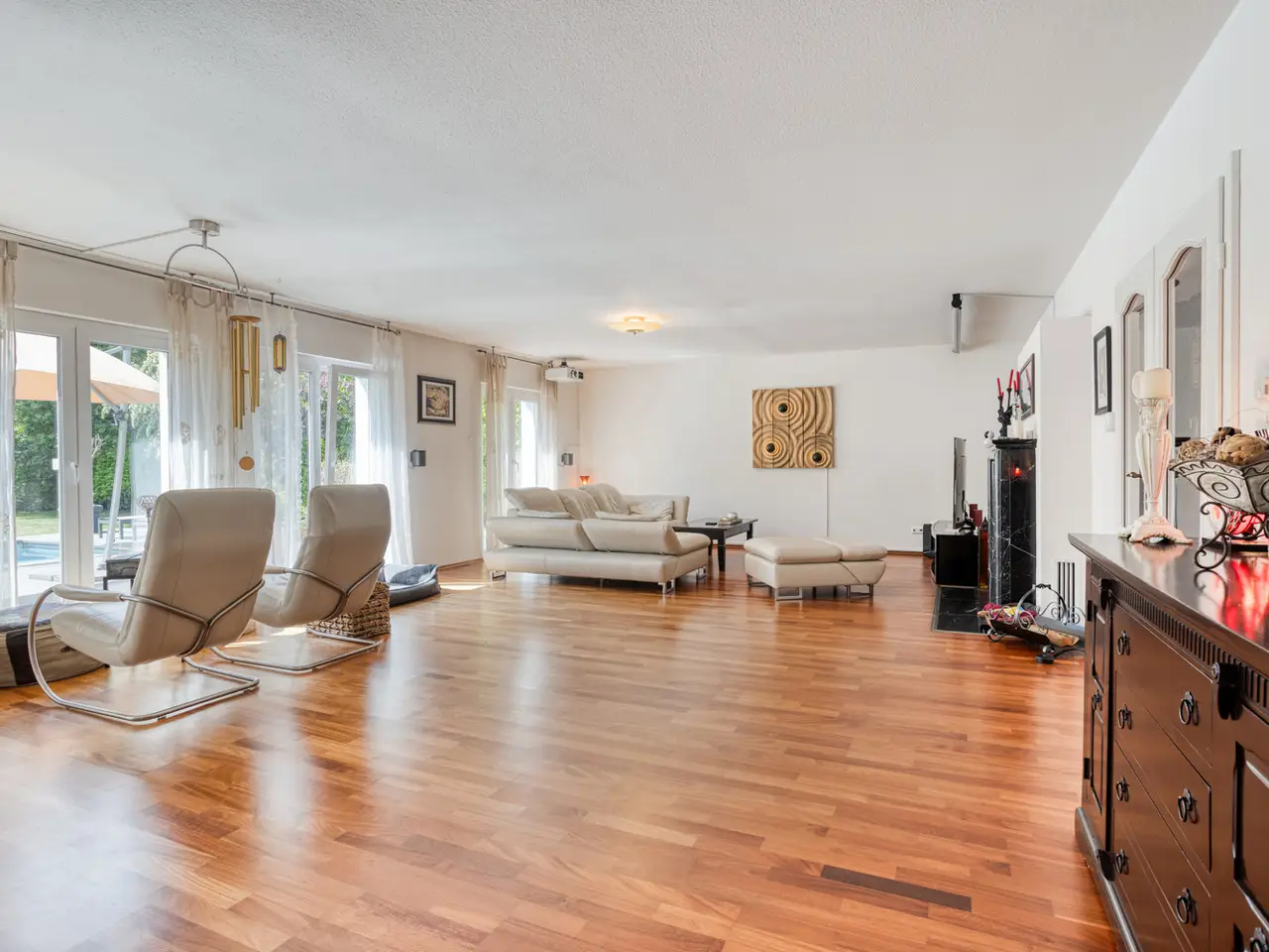 Bring your vacation home, because this villa, built in 2007 on a plot of around 1,175 m², now offers you living at the highest level on approx. 274 m² of living space and a total of 6 rooms, with the heated outdoor pool, the spacious terrace areas and the secluded garden providing a vacation feeling almost all year round. State-of-the-art building technology with fuel cell heating and a photovoltaic system with storage also ensure outstanding energy efficiency. You enter the house via the partially paved front garden, which is enclosed by a fence and wall, through a prestigious reception area into the spacious entrance hall, from where your gaze falls directly onto the high ceilings and the open gallery on the upper floor. From the entrance hall, you enter the kitchen on the left and the guest area with bedroom, small hallway and en-suite shower room on the right. The loft-like living and dining area with around 63 m² of living space is located in front of you. Here, the large marble fireplace creates a cozy atmosphere in winter, while the 5 floor-to-ceiling windows offer a seamless transition to the spacious pool area and garden in summer. This creates interesting axes of light and views, all of which lead through large window fronts into the surrounding garden and pool area. The large terrace by the outdoor pool and a covered outdoor seating area to the side of the house offer plenty of space to enjoy the beautiful days of the year with family and friends. And if you like it sporty, you will find your opponent in the pool's counter-current system. Solar panels in the pool's electric roller cover help to heat the pool in spring. The kitchen is already equipped with a high-quality country-style fitted kitchen and also has a useful storage room and direct access to the double garage. The open-plan staircase leads to the gallery on the upper floor and from there to the four bedrooms on this floor. The air-conditioned master bedroom has a spacious en suite bathroom with shower and bathtub and access to the balcony on this level. All rooms on both the ground and upper floors can be darkened with electric shutters. In the basement, which has a partial cellar, there is a hobby room and the utility room, which also houses the swimming pool equipment. The garden is densely planted and offers plenty of privacy and is barely visible, and is kept wonderfully green with an irrigation system. Next to the pool, an outdoor shower with warm water provides cooling and a small garden shed provides storage space in the outdoor area. The double garage can also be accessed through the garden. This is equipped with an electric door and offers space for further parking spaces in front of it, which are secured from the street by another door. You can also expect high-quality fittings on all levels of the house. Stone and parquet floors, a high-quality fitted kitchen and modern building technology are just a few examples. We cordially invite you to arrange a viewing appointment on site to see the charm and quality of the property for yourself.