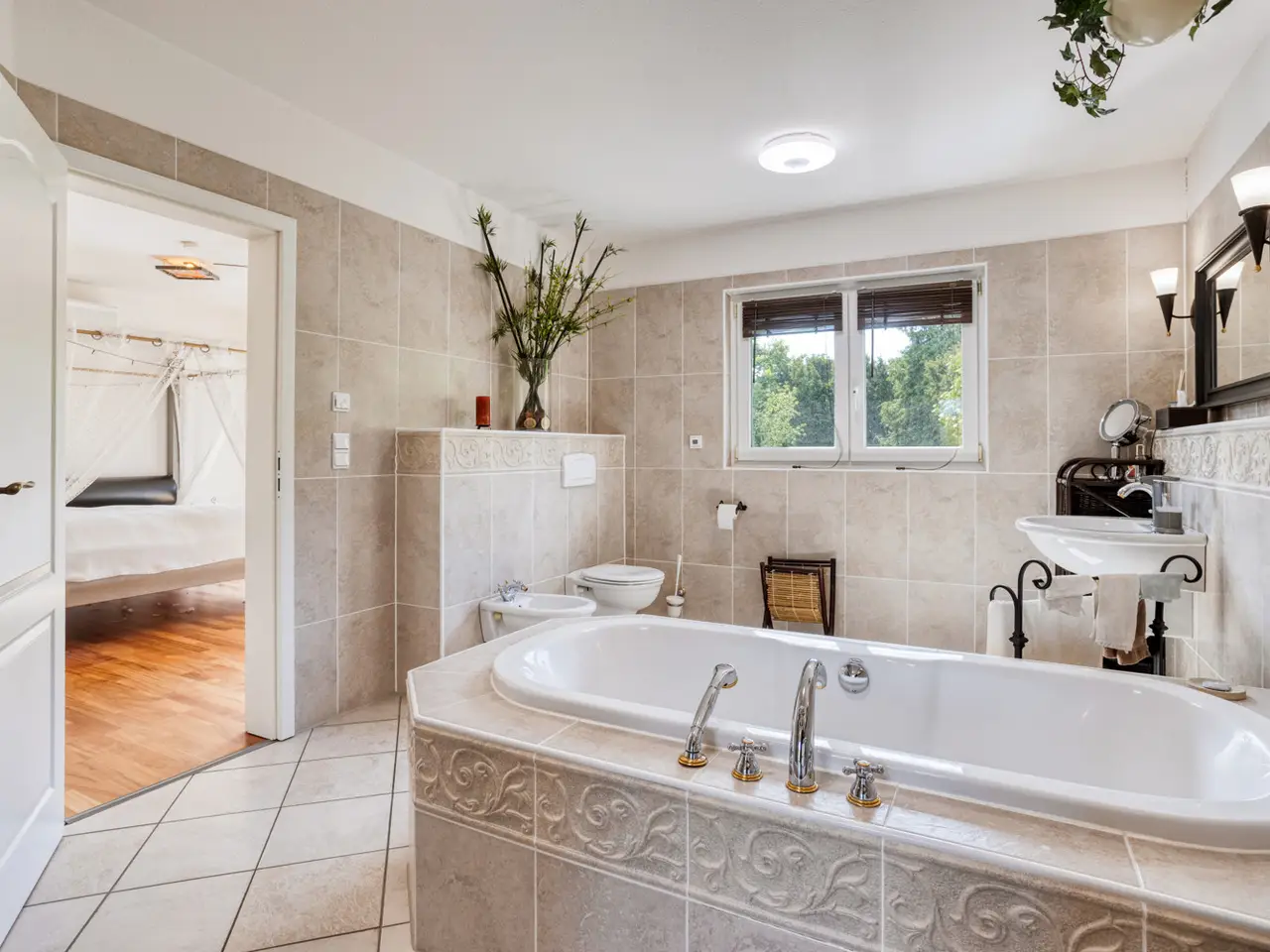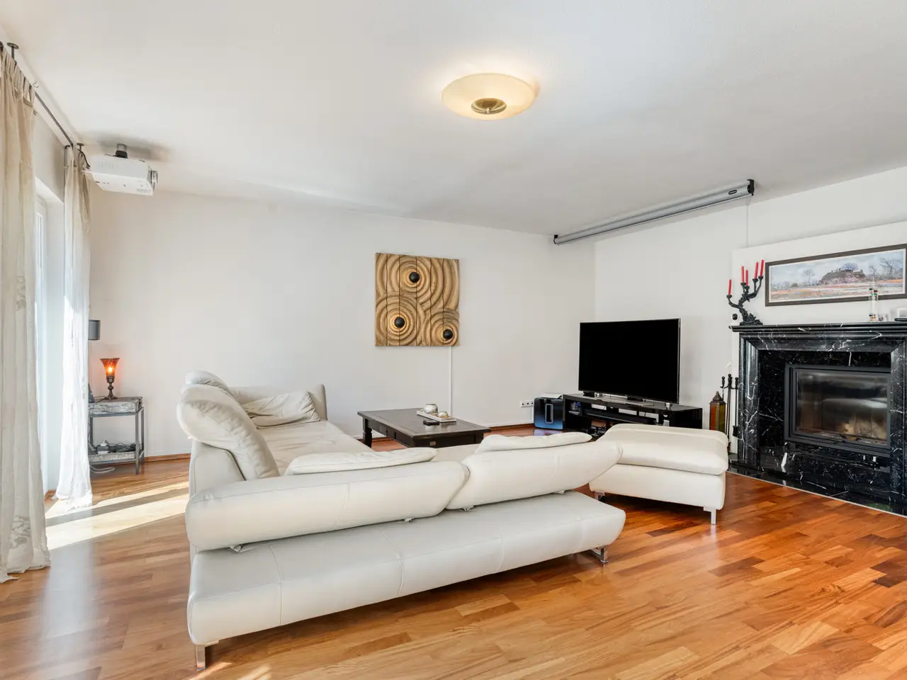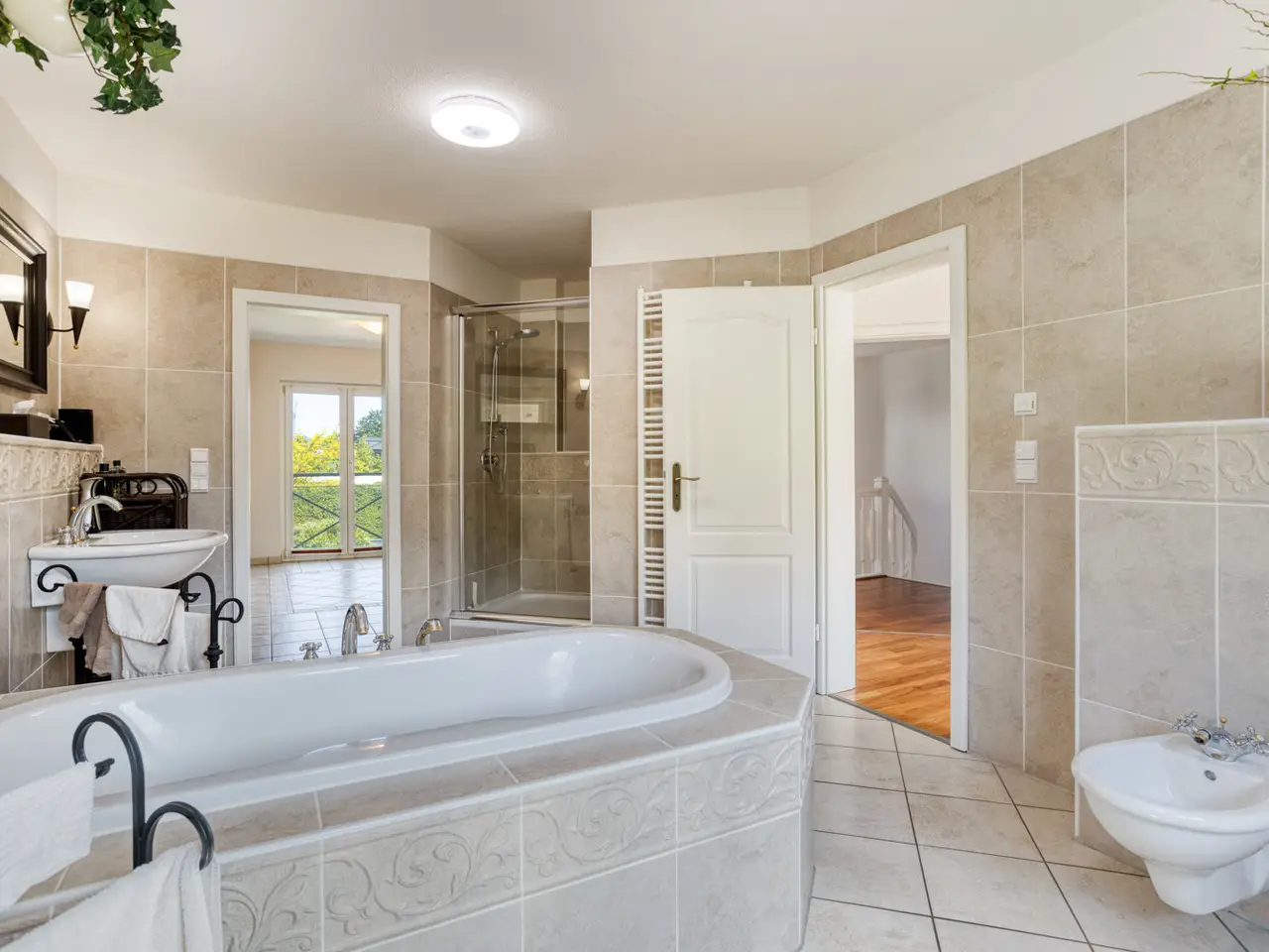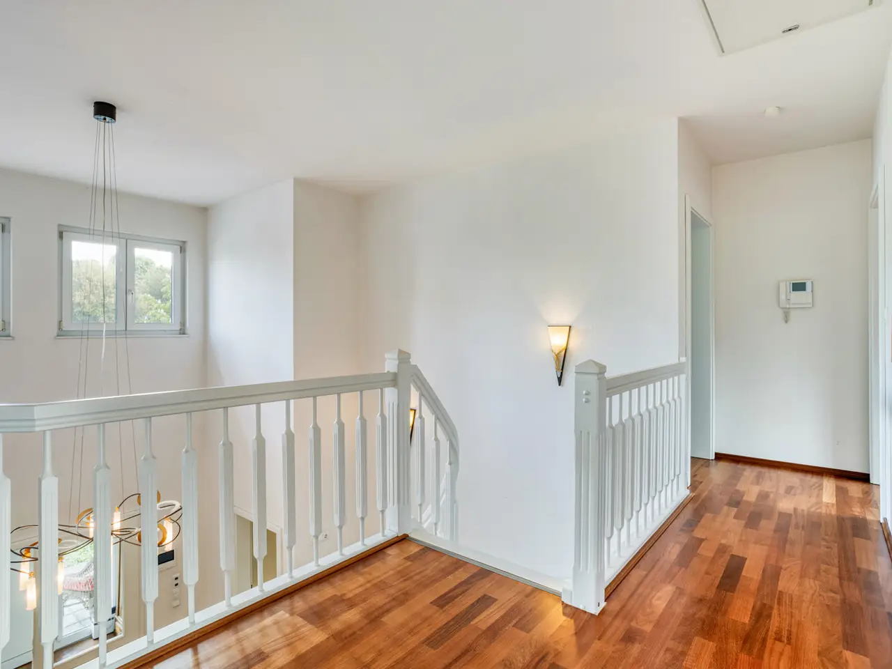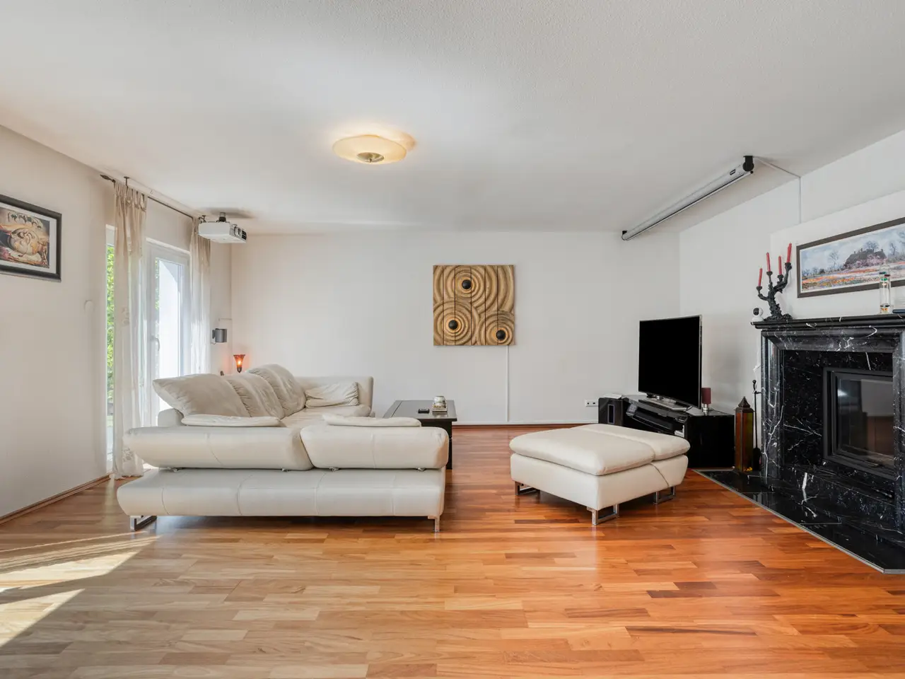 Bring your vacation home, because this villa, built in 2007 on a plot of around 1,175 m², now offers you living at the highest level on approx. 274 m² of living space and a total of 6 rooms, with the heated outdoor pool, the spacious terrace areas and the secluded garden providing a vacation feeling almost all year round. State-of-the-art building technology with fuel cell heating and a photovoltaic system with storage also ensure outstanding energy efficiency. You enter the house via the partially paved front garden, which is enclosed by a fence and wall, through a prestigious reception area into the spacious entrance hall, from where your gaze falls directly onto the high ceilings and the open gallery on the upper floor. From the entrance hall, you enter the kitchen on the left and the guest area with bedroom, small hallway and en-suite shower room on the right. The loft-like living and dining area with around 63 m² of living space is located in front of you. Here, the large marble fireplace creates a cozy atmosphere in winter, while the 5 floor-to-ceiling windows offer a seamless transition to the spacious pool area and garden in summer. This creates interesting axes of light and views, all of which lead through large window fronts into the surrounding garden and pool area. The large terrace by the outdoor pool and a covered outdoor seating area to the side of the house offer plenty of space to enjoy the beautiful days of the year with family and friends. And if you like it sporty, you will find your opponent in the pool's counter-current system. Solar panels in the pool's electric roller cover help to heat the pool in spring. The kitchen is already equipped with a high-quality country-style fitted kitchen and also has a useful storage room and direct access to the double garage. The open-plan staircase leads to the gallery on the upper floor and from there to the four bedrooms on this floor. The air-conditioned master bedroom has a spacious en suite bathroom with shower and bathtub and access to the balcony on this level. All rooms on both the ground and upper floors can be darkened with electric shutters. In the basement, which has a partial cellar, there is a hobby room and the utility room, which also houses the swimming pool equipment. The garden is densely planted and offers plenty of privacy and is barely visible, and is kept wonderfully green with an irrigation system. Next to the pool, an outdoor shower with warm water provides cooling and a small garden shed provides storage space in the outdoor area. The double garage can also be accessed through the garden. This is equipped with an electric door and offers space for further parking spaces in front of it, which are secured from the street by another door. You can also expect high-quality fittings on all levels of the house. Stone and parquet floors, a high-quality fitted kitchen and modern building technology are just a few examples. We cordially invite you to arrange a viewing appointment on site to see the charm and quality of the property for yourself.
