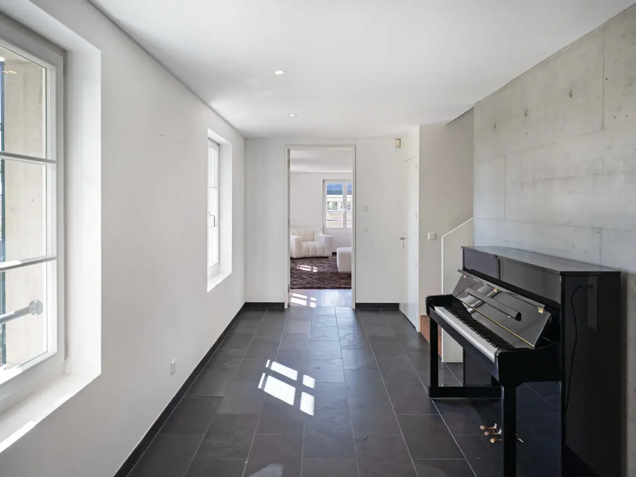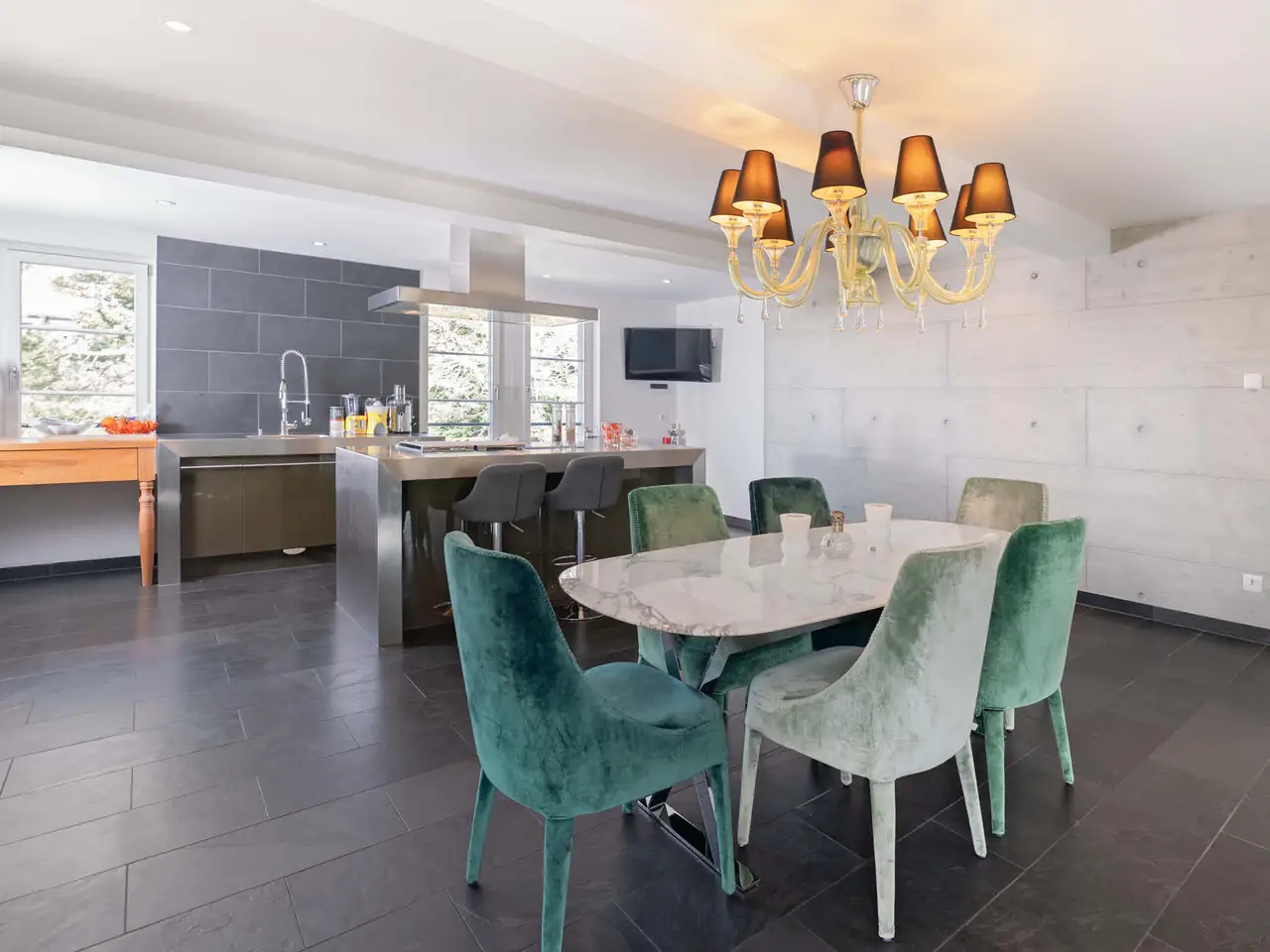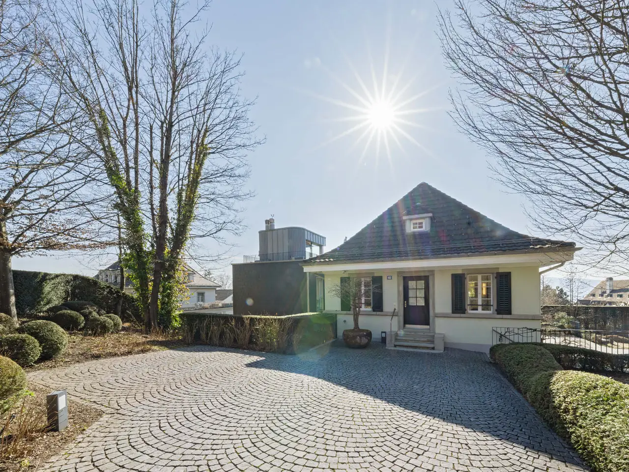 he elegant 1925-built villa, featuring the exquisite "PALAIS-Maisonette" duplex, is located in one of Zürichberg's most sought-after neighborhoods, alongside a modern extension built in 2008. From the maisonette, residents enjoy beautiful views of Lake Zürich and the surrounding mountains. Nearby, the forest and meadows invite spontaneous outings, while daily shopping needs can be met at Toblerplatz. With quick access via tram, bus, or car, the vibrant city life of Zürich is always within reach. The new two-story extension, designed with modernist geometric forms, complements the historic villa without imitating it. A glass bridge connects the old and new buildings, with a sparkling stream running beneath. The maisonette can be accessed through a flower-adorned courtyard or directly by lift from the underground garage. The welcoming entrance leads to a high-end kitchen, where the open layout fosters lively conversation with guests in the adjacent dining area while preparing meals.