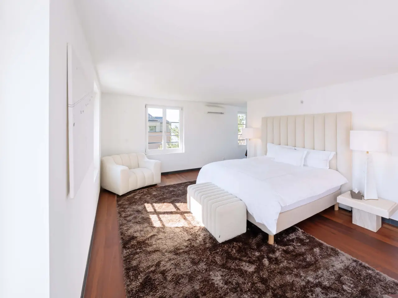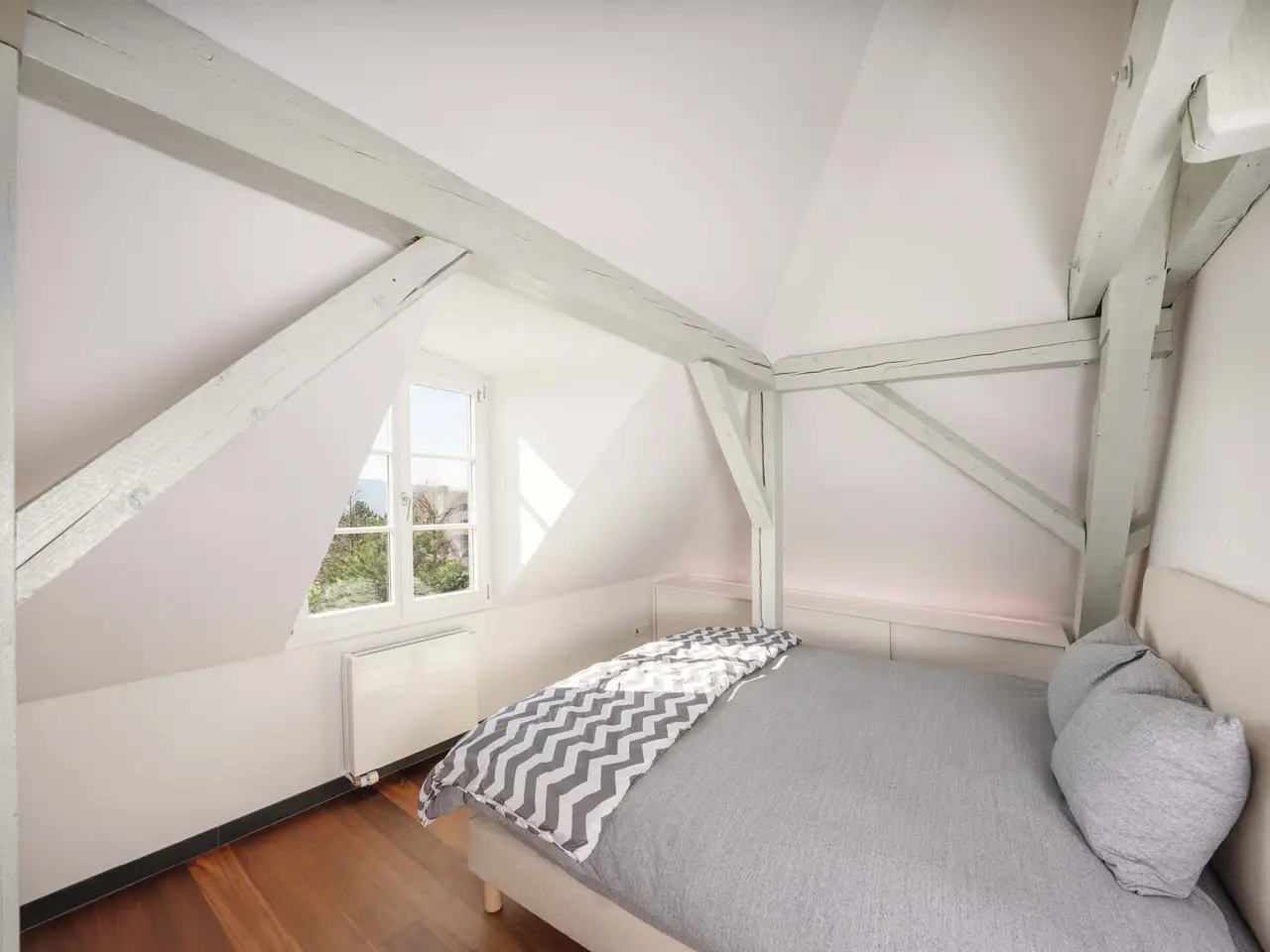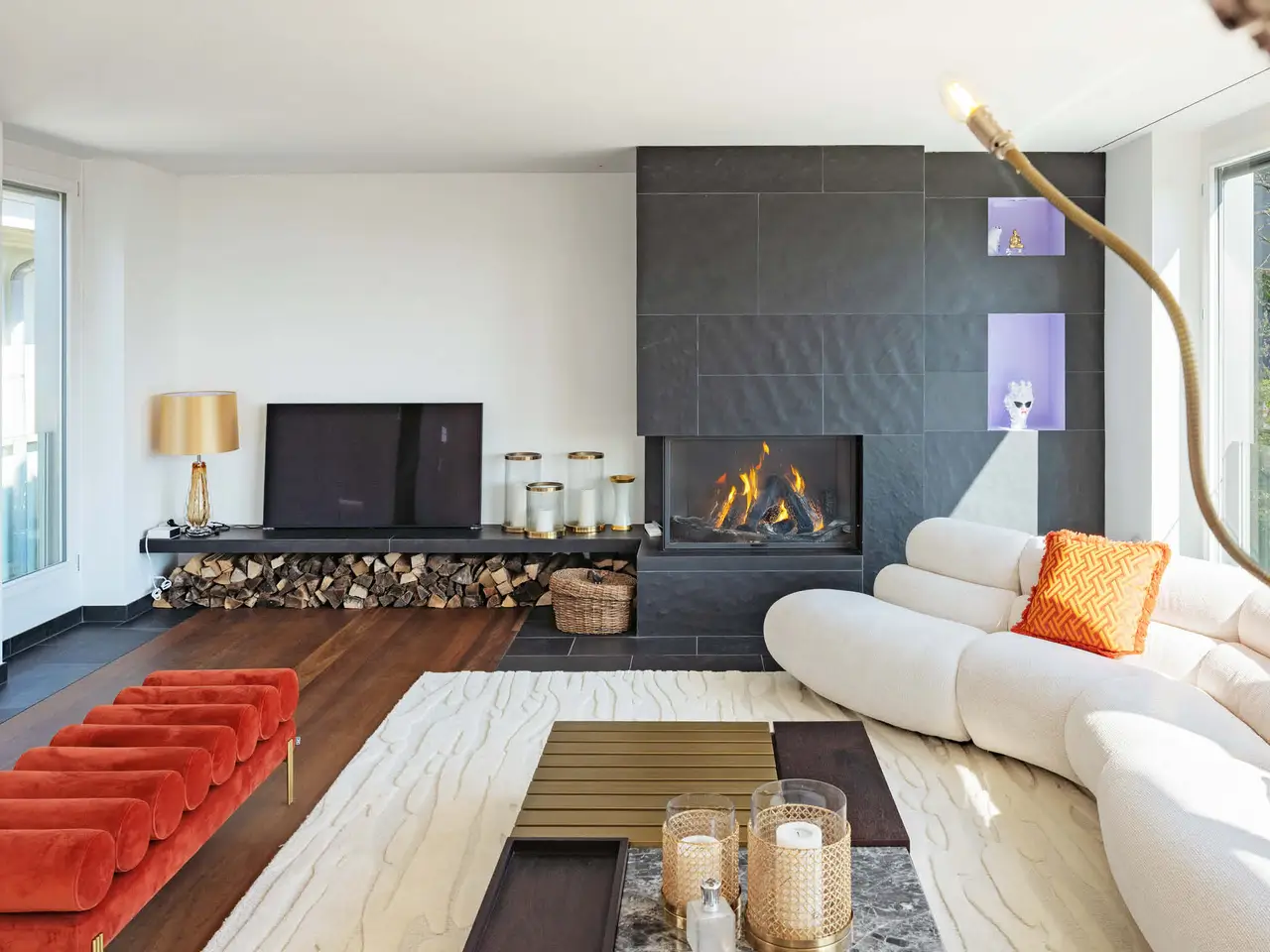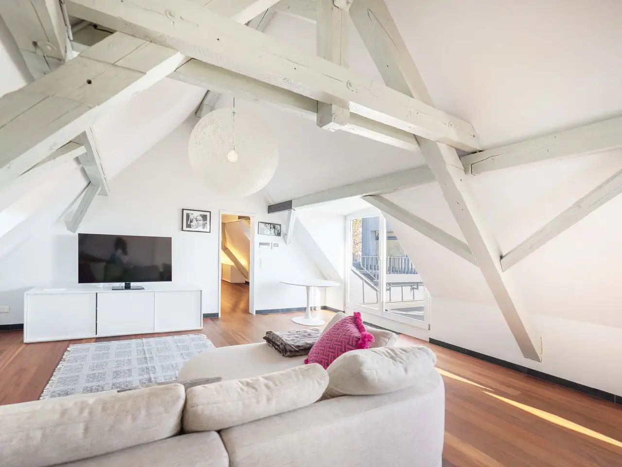 he elegant 1925-built villa, featuring the exquisite "PALAIS-Maisonette" duplex, is located in one of Zürichberg's most sought-after neighborhoods, alongside a modern extension built in 2008. From the maisonette, residents enjoy beautiful views of Lake Zürich and the surrounding mountains. Nearby, the forest and meadows invite spontaneous outings, while daily shopping needs can be met at Toblerplatz. With quick access via tram, bus, or car, the vibrant city life of Zürich is always within reach. The new two-story extension, designed with modernist geometric forms, complements the historic villa without imitating it. A glass bridge connects the old and new buildings, with a sparkling stream running beneath. The maisonette can be accessed through a flower-adorned courtyard or directly by lift from the underground garage. The welcoming entrance leads to a high-end kitchen, where the open layout fosters lively conversation with guests in the adjacent dining area while preparing meals.
