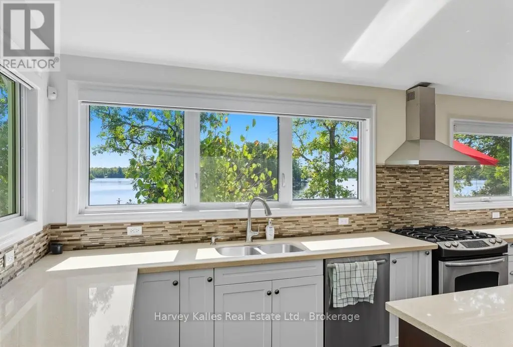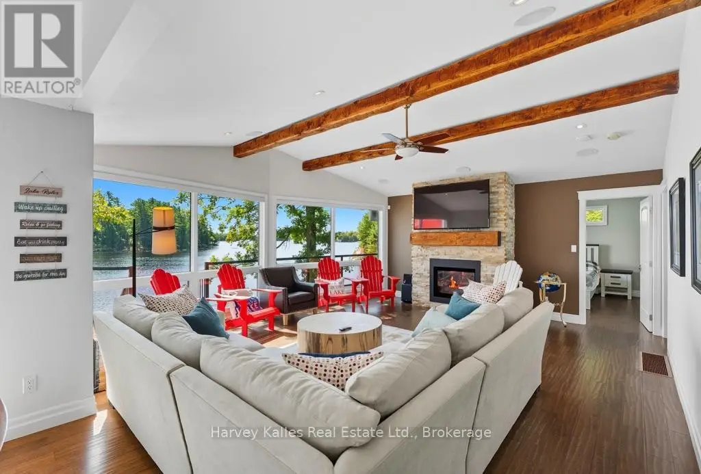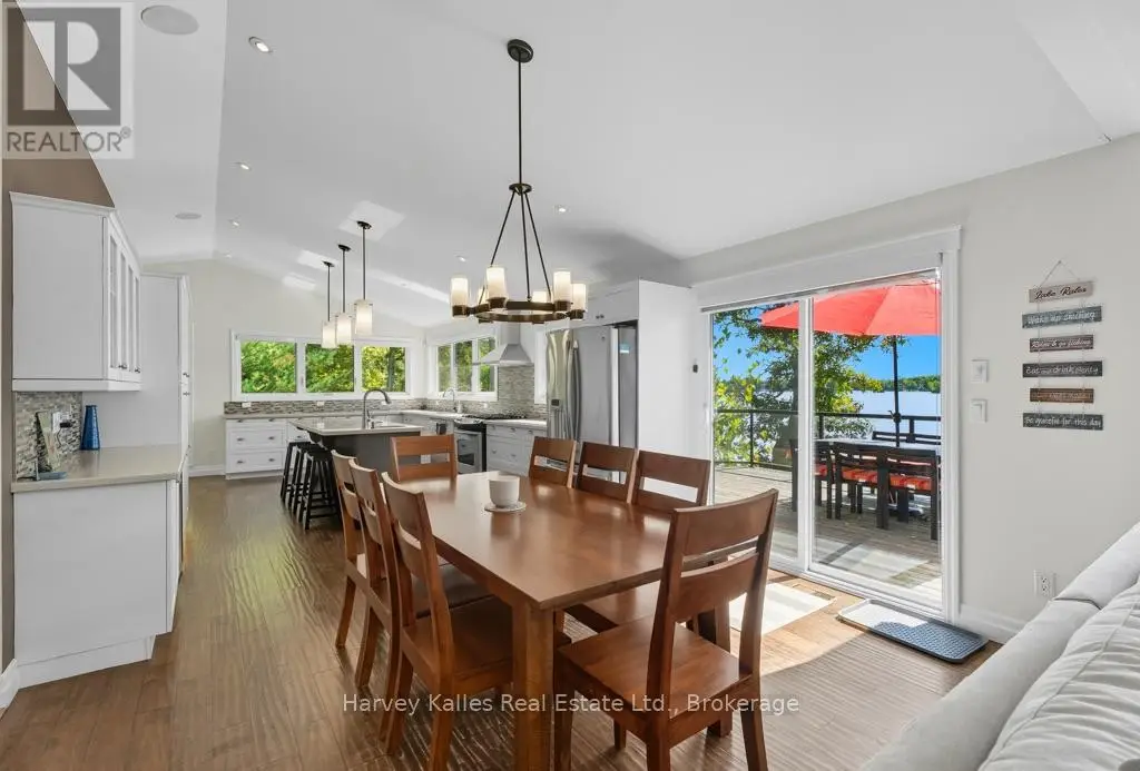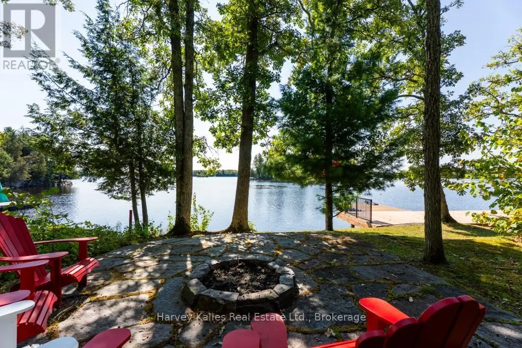 Stunning & inviting 4 season southerly oriented Lake Manitouwabing water's edge hideaway boasting island-dotted views and a beautiful sun-drenched classic rock shelf shoreline. Gentle topography, ease of year round municipally maintained road access with drive to the back door convenience. The all redone, elegant all season, 3 bedroom, 2 bath, sprawling bungalow boasts water views from almost every room, with a lakeside array of south to south-easterly facing windows & sliding glass doors spilling onto a large wraparound lakeside deck which connects down onto the brand new dock with expansive lakefront terrace area and separate granite fire pit patio. The cottage beckons & welcomes one with a lake view as soon as the door opens. Light & bright, luxurious designer infused interior features a gorgeous chef's kitchen with centre island & S/S appliances, water views, breakfast nook, bar area with bar fridge, opening to a generous lake-view dining area, and grande centrepiece great room with handsome floor-to-ceiling stacked stone propane-burning fireplace, and prow-front wall of windows overlooking once again stunning views. Waterside principal bedroom complete with its own walkout, walk-in closet, and luxe ensuite. 2 more main floor bedrooms, bath, laundry, plus the 276 sq. ft. sleeping cabin with bath attached to the insulated 2-car 23' x 23' detached garage. 213' of southerly shoreline, with rock point, rock shelf entry, deep and shallow water, sunrise and island-dotted views. 1.4 acres of level, private lands. Magnificent mechanicals, drilled well, central air, hot water on demand. The list goes on and on. Minutes from the exclusive Manitou Ridge Club for golf and dining, and a breeze to access from Toronto. With the ever rare and appealing aspect of having membership in the 'Longhorn Estates' Conservation Area 120+ acre backlands with hiking trails. 4 season cottaging splendour abounds on the ever desired Lake Manitouwabing. Being sold turnkey, fully furnished (id:16999)