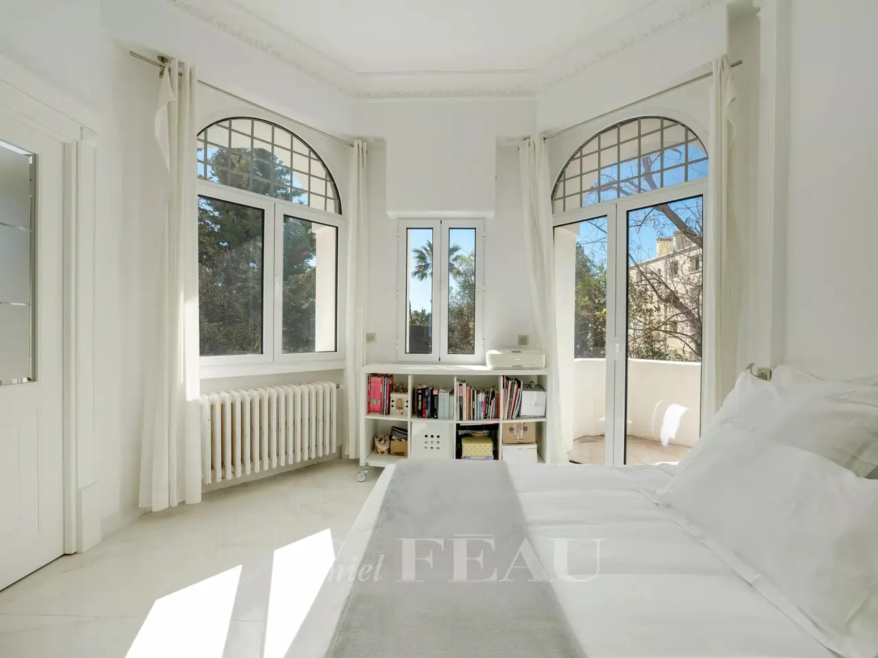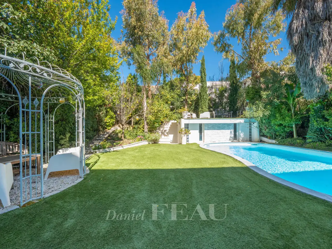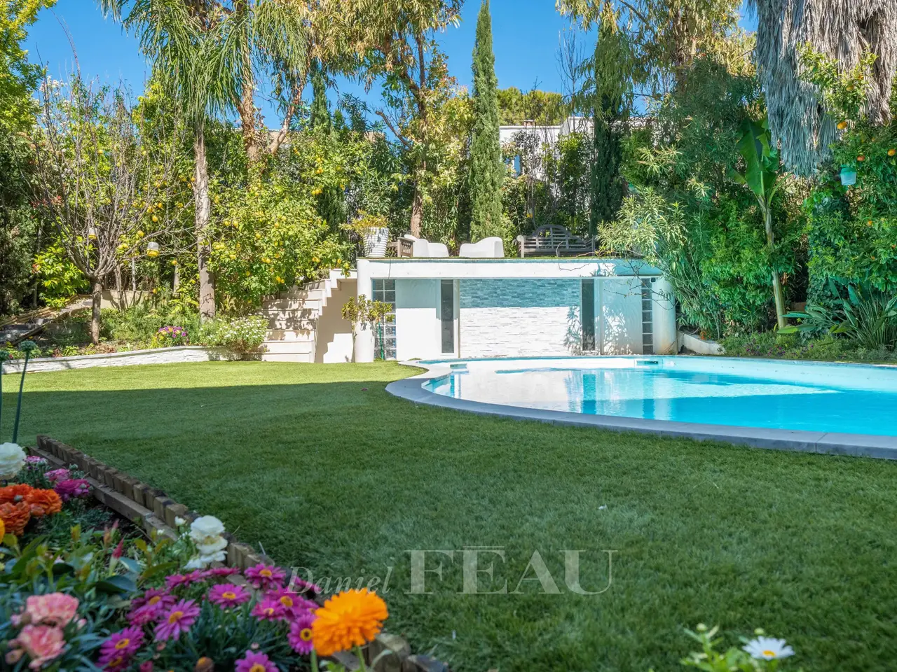 This peaceful mid 20th century property is in a sought-after and secure residence in the immediate vicinity of the sea. Set in a leafy 550 sqm plot with a heated swimming pool, it offers about 270 sqm of renovated living space including a living/reception room opening onto a terrace, a semi open-plan kitchen, and a bedroom with a shower room and a dressing room. The lower floor comprises four bedrooms including a suite, a shower room and a library. Accessed from both the inside and outside, the garden level includes a sitting room, two further bedrooms, a shower room and a summer kitchen. The property is equipped with a lift, home automation and a security system. With a garage and parking spaces.