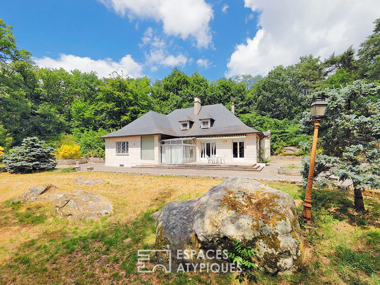 Un domaine rare de 5 hectares en lisiere de foret Tucked away around a corner, hidden from view, this private property is revealed, nestled in the heart of a magnificent wooded park of nearly 5 hectares. Here, nature reigns supreme. The trees and a few rocks typical of the Fontainebleau Forest offer a preserved setting, conducive to daydreaming as well as large-scale projects. This exceptional estate houses two independent houses to renovate, perfectly integrated into their environment, ideal for a main residence, a guest house or a shared living project. The main house, built in the 1970s on two levels, offers 228sqm of living space. From the entrance, a long corridor leads to large rooms bathed in light. The living room and dining room, with their comfortable proportions, invite conviviality. A second living room with a fireplace promises mild winter evenings. The separate, functional kitchen opens onto the outside. Two ground-level bedrooms, an office, a bathroom, two toilets, a laundry room, and a veranda opening onto the park complete this level. Upstairs, three additional bedrooms, a shower room, a separate toilet, and a large convertible attic offer even more beautiful perspectives. In the basement, a total compartmentalized space: a large garage, a boiler room, a cellar, and storage rooms. Ideal for accommodating a collection of vintage cars, or for creating a workshop, a gym, a wellness area, etc. The second single-story stone house offers 117sqm of living space. This detached house has a living room with a fireplace, four bedrooms, one of which has independent access, a bathroom, a shower room, and two toilets. A terrace extends the living space to the outdoors. The property also has 7 boxes, including 6 closed garages, perfect for exceptional vehicles, an independent workshop, and a cellar. A rare and confidential property, just a few minutes from Fontainebleau. ENERGY CLASS: F / CLIMATE CLASS: F Estimated average annual energy costs for standard use based on average energy prices indexed for the years 2021, 2022, and 2023, between EUR7,960 and EUR10,810. REF. SM1163 Additional information * 12 rooms * 9 bedrooms * Outdoor space : 50000 SQM * Parking : 10 parking spaces * Property tax : 5 476 € Energy Performance Certificate Primary energy consumption f : 278 kWh/m2.year High performance housing