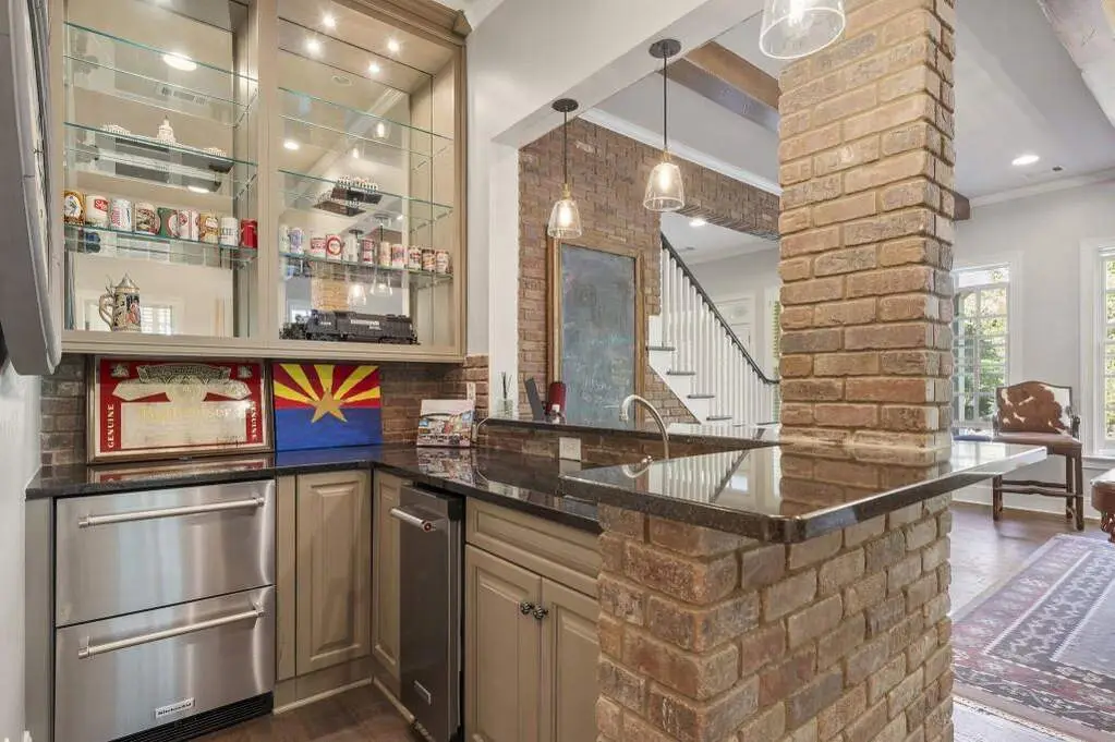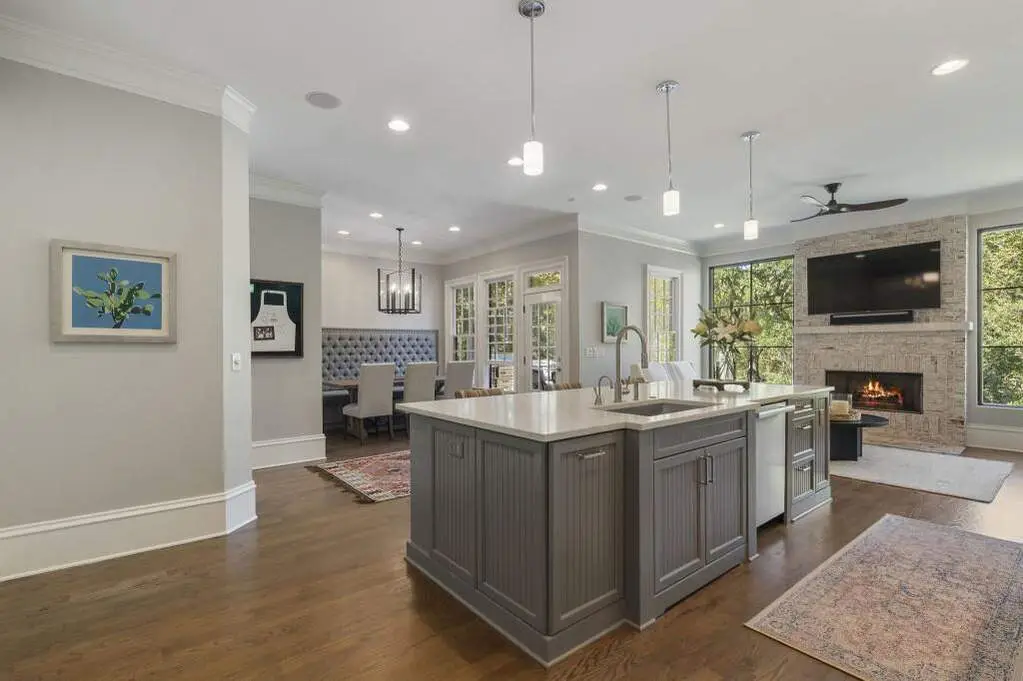 This exceptional Monte Hewett home is perfectly situated on a quiet cul-de-sac in the heart of North Buckhead, and offers a rare combination of architectural sophistication, timeless craftsmanship, and modern livability. Surrounded by beautifully landscaped grounds, this four-level residence is designed for both elegant entertaining and comfortable everyday living. A gracious front porch with gas lanterns welcomes guests into a light-filled interior with 10-foot ceilings on both the main and terrace levels. The stunning gourmet kitchen features walls of windows, quartz countertops, a large center island, new premium appliances, and a breakfast area with custom built-in banquette that opens to an outdoor dining area and kitchen, creating seamless indoor-outdoor flow. The kitchen flows into the keeping room with fireplace, the perfect spot for relaxed gatherings. The spacious family room showcases coffered ceilings, a fireplace, and custom built-ins, while the screened porch overlooks the manicured backyard and a peaceful nature preserve in the distance. A butler's pantry with ice maker connects to the formal dining room, easily accommodating twelve guests. A front living room offers flexible use as a music, game, or Mah Jongg room. Completing the main level are a mudroom with abundant storage and two stylish powder baths. Upstairs, the luxurious primary suite features a fireplace, private sitting room, and a spa-like bath with double vanities, soaking tub, separate shower, and an expansive walk-in closet. Three spacious secondary bedrooms, two full baths, and a landing area with a built-in reading nook complete this level. The fourth floor offers exceptional flexibility-ideal as a media room, home office, craft room, or play space. The terrace level is a true extension of the home, featuring a daylight media/family room with custom cabinetry, temperature-controlled wine cellar, game room, exercise room (optional 6th bedroom), guest suite, 1.5 baths, office, and French doors.