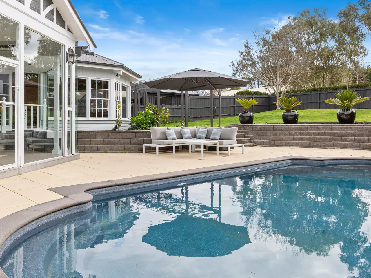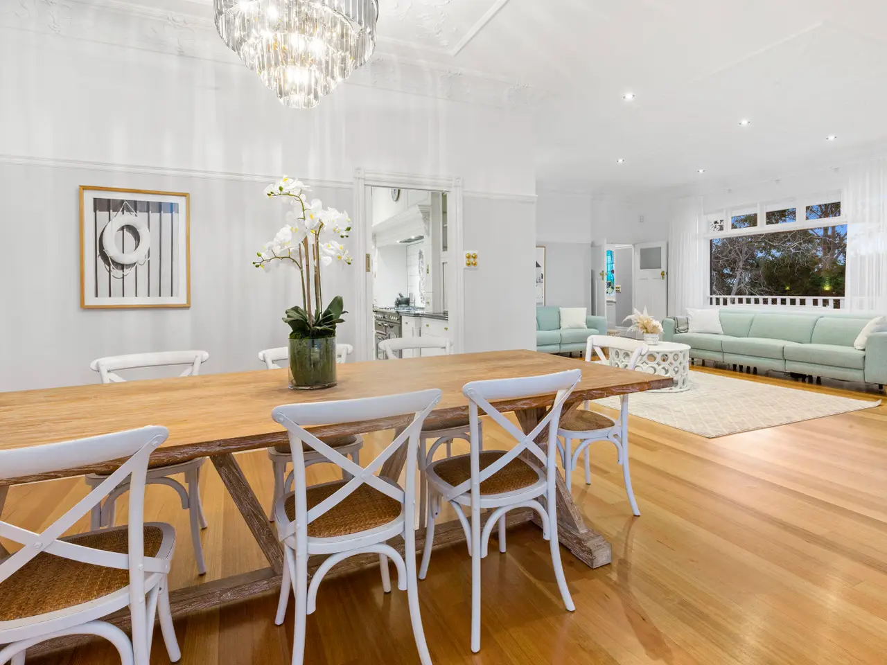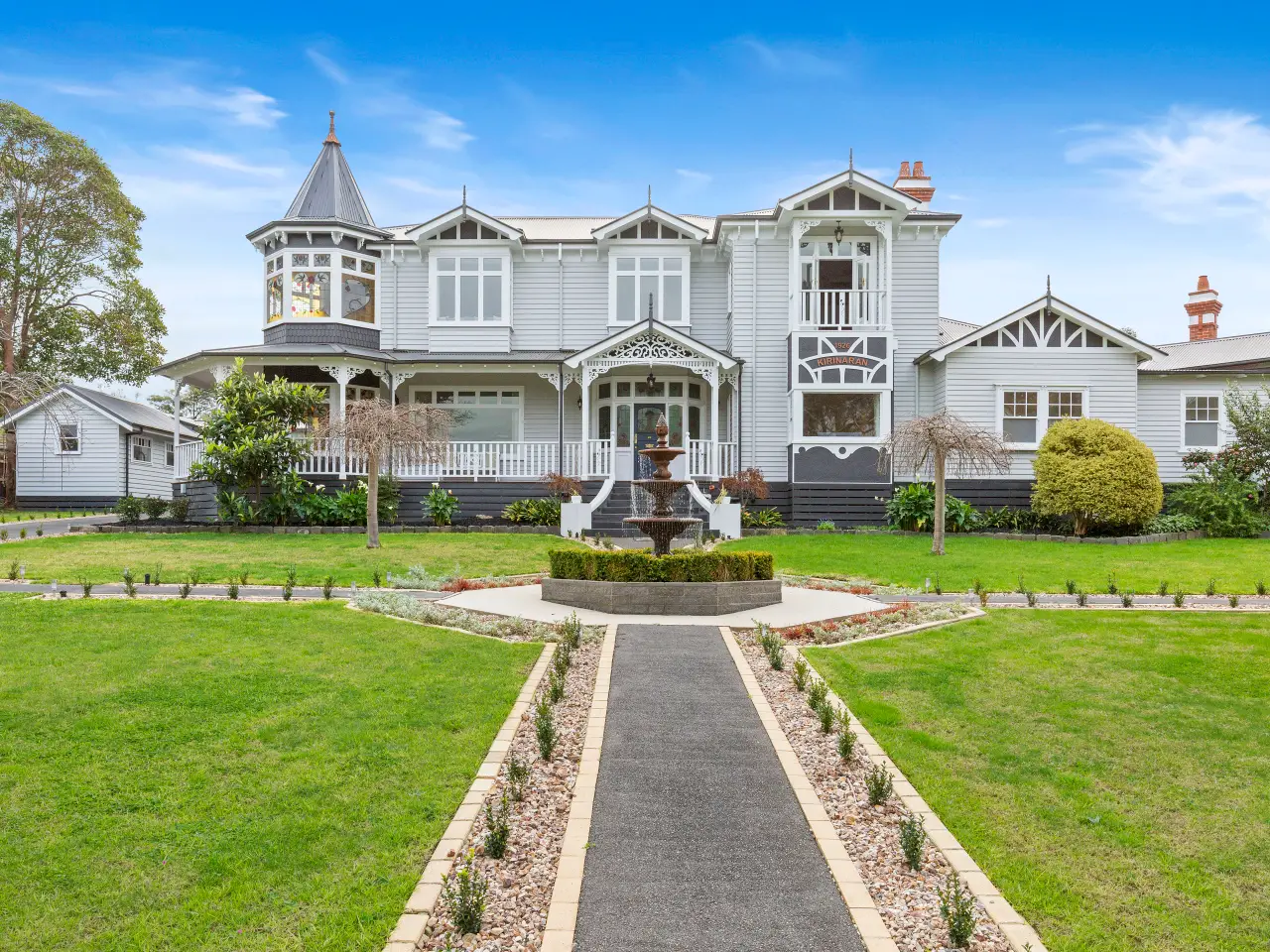 This beautifully renovated dream property offers boutique country house resort-style living on over 3/4 of an acre, situated leafy in Frankston South. Originally built in 1926 by English rice growers, the plantation bungalow reflects their Sri Lankan home on an apple orchard, forming the estate's original driveway, Barriedale Grove. Kirinaran, circa 1926, underwent an award-winning restoration in 2010, adding Edwardian-inspired turrets. Recently updated with a cohesive Hampton's palette, the home showcases original features like plasterwork, timber fretwork, and leadlight windows. Modern conveniences include auto blinds, climate control, and underfloor heating. Entertainment options abound, from the marble entry hall to the conservatory, bar/rumpus, alfresco terrace, and lush gardens. The granite kitchen boasts commercial-grade appliances. Five luxurious bedrooms, including a palatial master suite with balcony, offer comfort. Additional amenities include a studio, solar heated pool, garage, and workshop. Updates include wool carpets and new lighting.