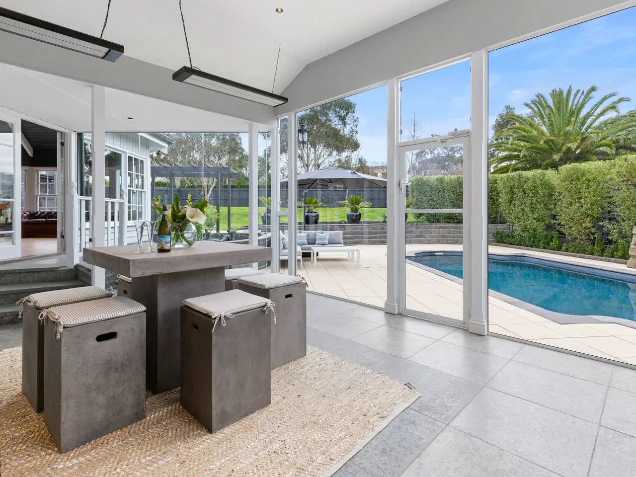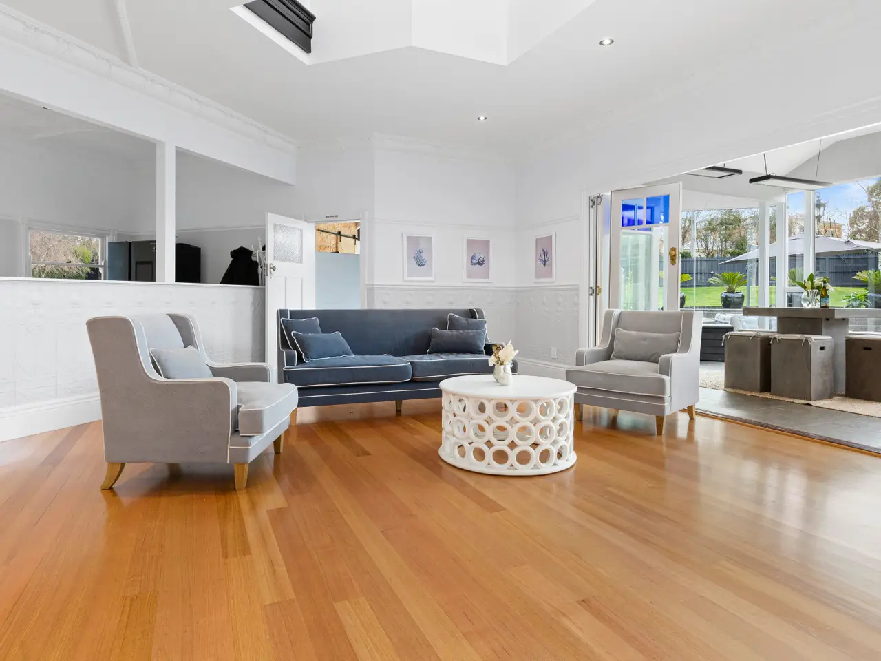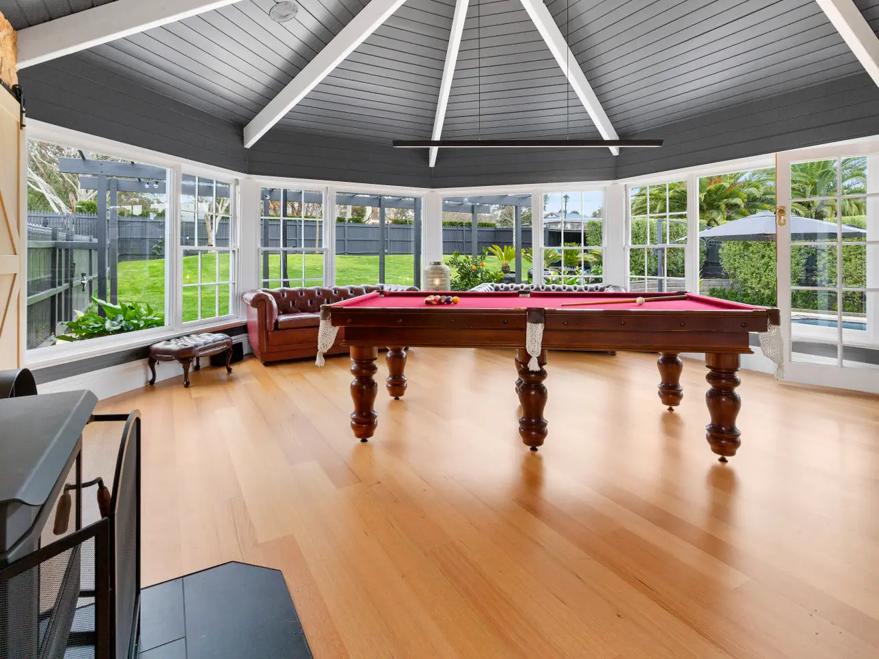 This beautifully renovated dream property offers boutique country house resort-style living on over 3/4 of an acre, situated leafy in Frankston South. Originally built in 1926 by English rice growers, the plantation bungalow reflects their Sri Lankan home on an apple orchard, forming the estate's original driveway, Barriedale Grove. Kirinaran, circa 1926, underwent an award-winning restoration in 2010, adding Edwardian-inspired turrets. Recently updated with a cohesive Hampton's palette, the home showcases original features like plasterwork, timber fretwork, and leadlight windows. Modern conveniences include auto blinds, climate control, and underfloor heating. Entertainment options abound, from the marble entry hall to the conservatory, bar/rumpus, alfresco terrace, and lush gardens. The granite kitchen boasts commercial-grade appliances. Five luxurious bedrooms, including a palatial master suite with balcony, offer comfort. Additional amenities include a studio, solar heated pool, garage, and workshop. Updates include wool carpets and new lighting.
