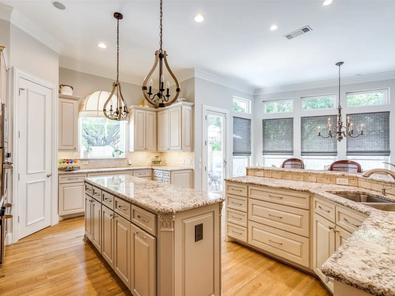 Fantastic zero lot line in the lovely Stonebriar Village, a gated and guarded community with TWO PRIMARY suites & TWO STUDIES. Second floor was completely remodeled in 2023. The second-story primary bath features quartz countertops, lighted mirrors, ceramic tile flooring, a large walk in shower, garden tub, and a linen closet. This primary suite also includes a huge closet (measures 12 x 10). Additionally the suite has hardwood flooring, a separate office with a wall of built-ins and shelves above, and a 155 sq feet of a sunroom that makes a great TV or sitting room with incredible views of tons of trees and creek area. Don't miss upstairs guest room. It has a ensuite bath with lighted mirror and quartz! First floor primary has been remolded in 2019 with granite countertops, a tower, dual sinks, free-standing elegant tub, a custom closet, and a large walk in shower! Heated flooring in both primary baths! Chef's kitchen with extended island, granite countertops, Viking Appliances, double ovens, a built-in subzero refrigerator, a large walk-in pantry and a reverse osmosis water filtration system. The wrap-around breakfast bar seats up to 5 people. Large breakfast room that views the resort style outdoor living area is open to the family room! Formal study (or could be 4th bedroom) with adjacent full bath, French doors, closet, a wall of built-ins. No carpet in this great home, hardwood floors and ceramic tile throughout. Great wine storage with wine cooler. Two attics with walk in storage. Security and Sprinkler systems! Double garage has epoxy flooring, and custom cedar door. Extensive landscaping with stone borders. A whole house Generac generator, a Culligan water softener system, and a Moen water safety system stay with the home. Seller prides in taking care of the home.