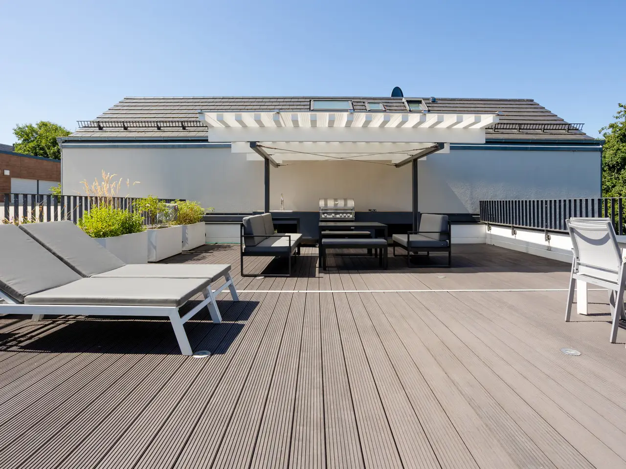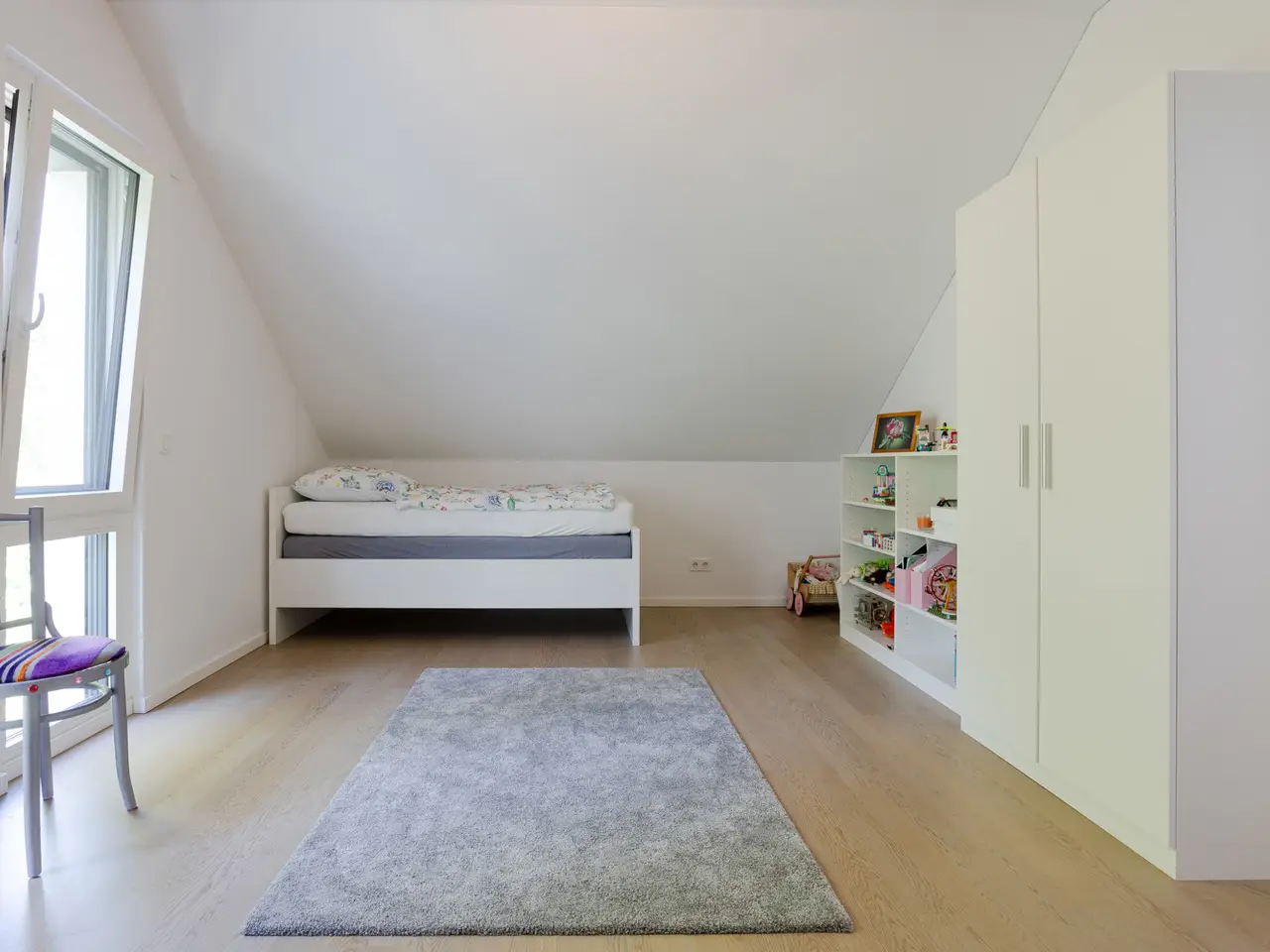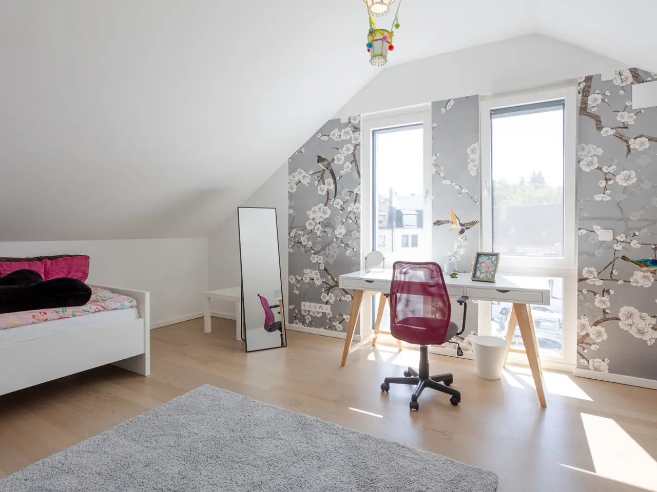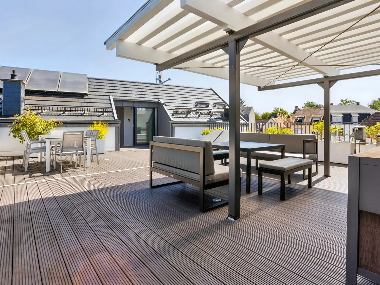 Quietly located in a cul-de-sac in charming, family-friendly Eschersheim, this exclusive penthouse maisonette reveals itself as a true residential gem. Spread over two levels and approximately 265 m² of living space, it combines architectural sophistication, well thought-out interior design and fittings that meet even the highest demands. As soon as you enter the apartment, you can sense the exceptional standards of design and quality. Spacious, light-flooded rooms with ceiling heights of up to 2.65 meters create a stylish, airy ambience. The combination of fine Swiss Bauwerk parquet flooring, large-format Italian design tiles from Fondovalle and smoothly plastered, partially white-painted and stylish exposed concrete walls and ceilings conveys modern elegance with timeless class. The open-plan living/dining area forms the heart of this property - with over 80 square meters of space, floor-to-ceiling windows with electric shutters and direct access to one of the three south-west-facing terraces. The stylish fitted kitchen with full-length stainless steel worktop, equipped with high-quality appliances from Miele and Bosch, blends seamlessly into the luxurious room concept, and from here you can also access the second terrace on this floor with a view of the greenery. On the upper floor, the panoramic roof terrace with an area of around 74 m² invites you to enjoy undisturbed moments with a breathtaking view of the greenery. An airy gallery, a total of five (bedrooms, study or children's) rooms, two exclusive bathrooms with natural light and sanitaryware from TOTO, Duravit and KLUDI, two separate guest WCs as well as several storage rooms and a utility room offer generous comfort for families, couples or individualists with a taste for the extraordinary. Another highlight is the fully integrated LOXONE smart home technology, which intelligently networks lighting, heating, blinds, audio and security - conveniently controllable via app or control element. Electric shutters, a decentralized ventilation system with heat recovery, underfloor heating and high-quality Gira colour video intercoms on each floor round off the first-class technical standard. The new build was designed as an energy-efficient KfW Efficiency House 55 - with sustainable thermal insulation, triple glazing, a solar-assisted heating system and solid masonry made from natural building materials. The offer is rounded off by two separate, spacious cellar rooms and an extra-wide garage parking space (double parking space) right next to the house. This penthouse maisonette stands for uncompromising living comfort, maximum privacy and an aesthetic quality that is rarely found - a real statement for stylish living in the north of Frankfurt.
