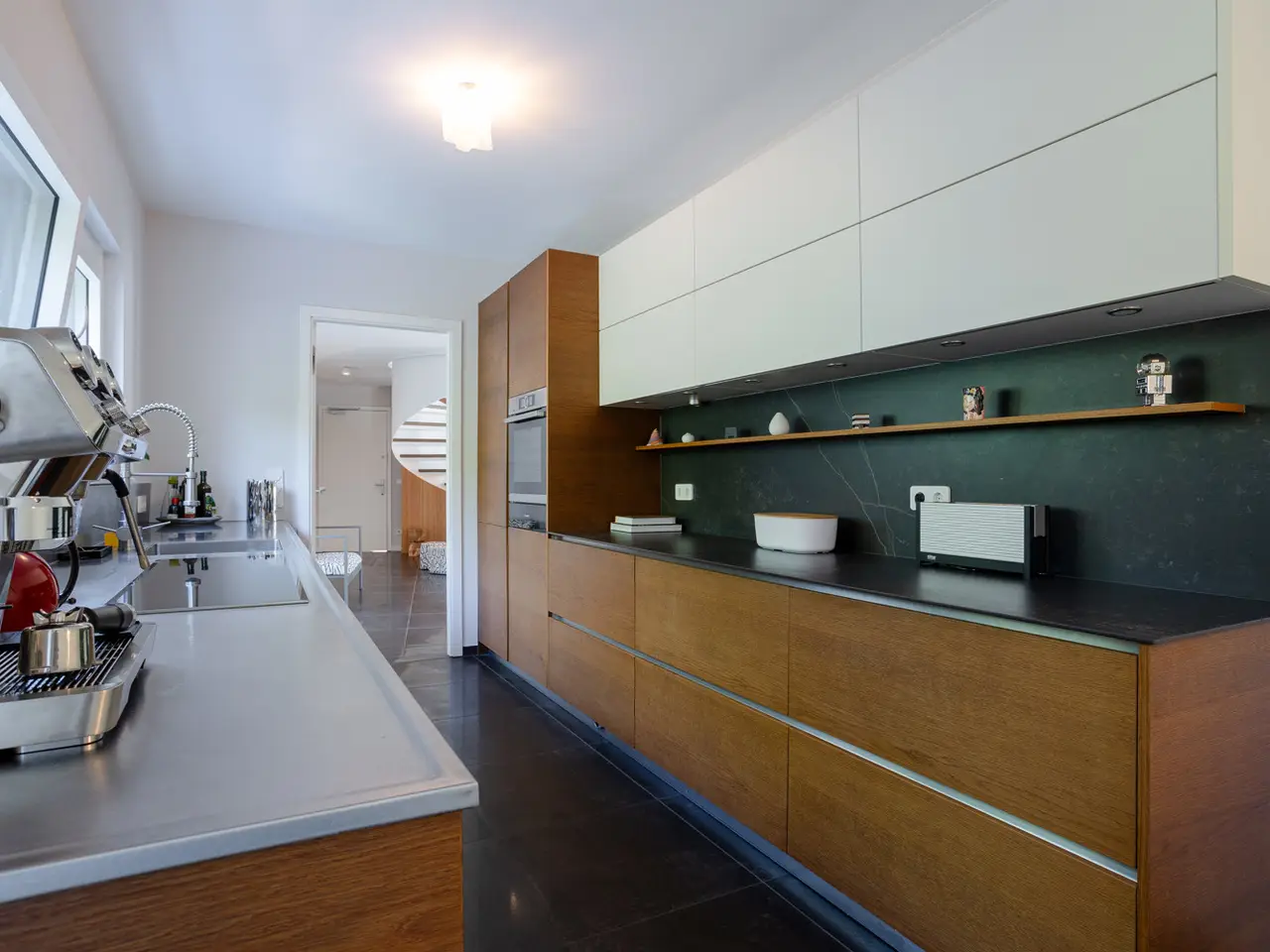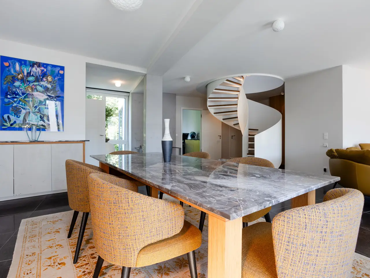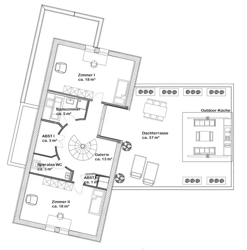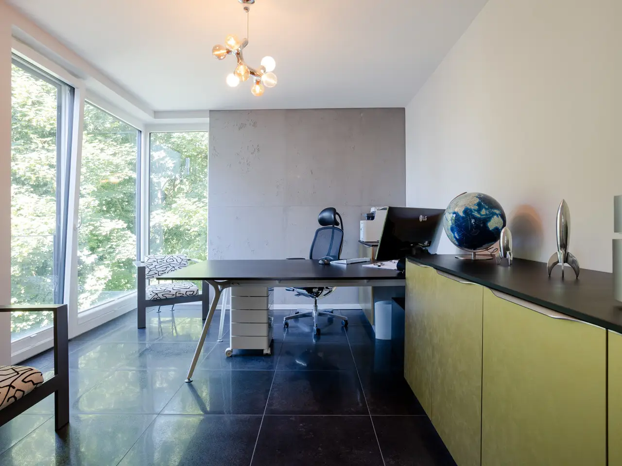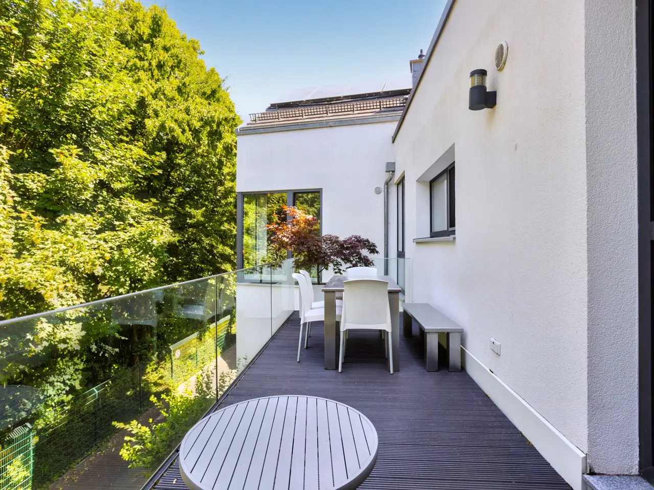 Quietly located in a cul-de-sac in charming, family-friendly Eschersheim, this exclusive penthouse maisonette reveals itself as a true residential gem. Spread over two levels and approximately 265 m² of living space, it combines architectural sophistication, well thought-out interior design and fittings that meet even the highest demands. As soon as you enter the apartment, you can sense the exceptional standards of design and quality. Spacious, light-flooded rooms with ceiling heights of up to 2.65 meters create a stylish, airy ambience. The combination of fine Swiss Bauwerk parquet flooring, large-format Italian design tiles from Fondovalle and smoothly plastered, partially white-painted and stylish exposed concrete walls and ceilings conveys modern elegance with timeless class. The open-plan living/dining area forms the heart of this property - with over 80 square meters of space, floor-to-ceiling windows with electric shutters and direct access to one of the three south-west-facing terraces. The stylish fitted kitchen with full-length stainless steel worktop, equipped with high-quality appliances from Miele and Bosch, blends seamlessly into the luxurious room concept, and from here you can also access the second terrace on this floor with a view of the greenery. On the upper floor, the panoramic roof terrace with an area of around 74 m² invites you to enjoy undisturbed moments with a breathtaking view of the greenery. An airy gallery, a total of five (bedrooms, study or children's) rooms, two exclusive bathrooms with natural light and sanitaryware from TOTO, Duravit and KLUDI, two separate guest WCs as well as several storage rooms and a utility room offer generous comfort for families, couples or individualists with a taste for the extraordinary. Another highlight is the fully integrated LOXONE smart home technology, which intelligently networks lighting, heating, blinds, audio and security - conveniently controllable via app or control element. Electric shutters, a decentralized ventilation system with heat recovery, underfloor heating and high-quality Gira colour video intercoms on each floor round off the first-class technical standard. The new build was designed as an energy-efficient KfW Efficiency House 55 - with sustainable thermal insulation, triple glazing, a solar-assisted heating system and solid masonry made from natural building materials. The offer is rounded off by two separate, spacious cellar rooms and an extra-wide garage parking space (double parking space) right next to the house. This penthouse maisonette stands for uncompromising living comfort, maximum privacy and an aesthetic quality that is rarely found - a real statement for stylish living in the north of Frankfurt.