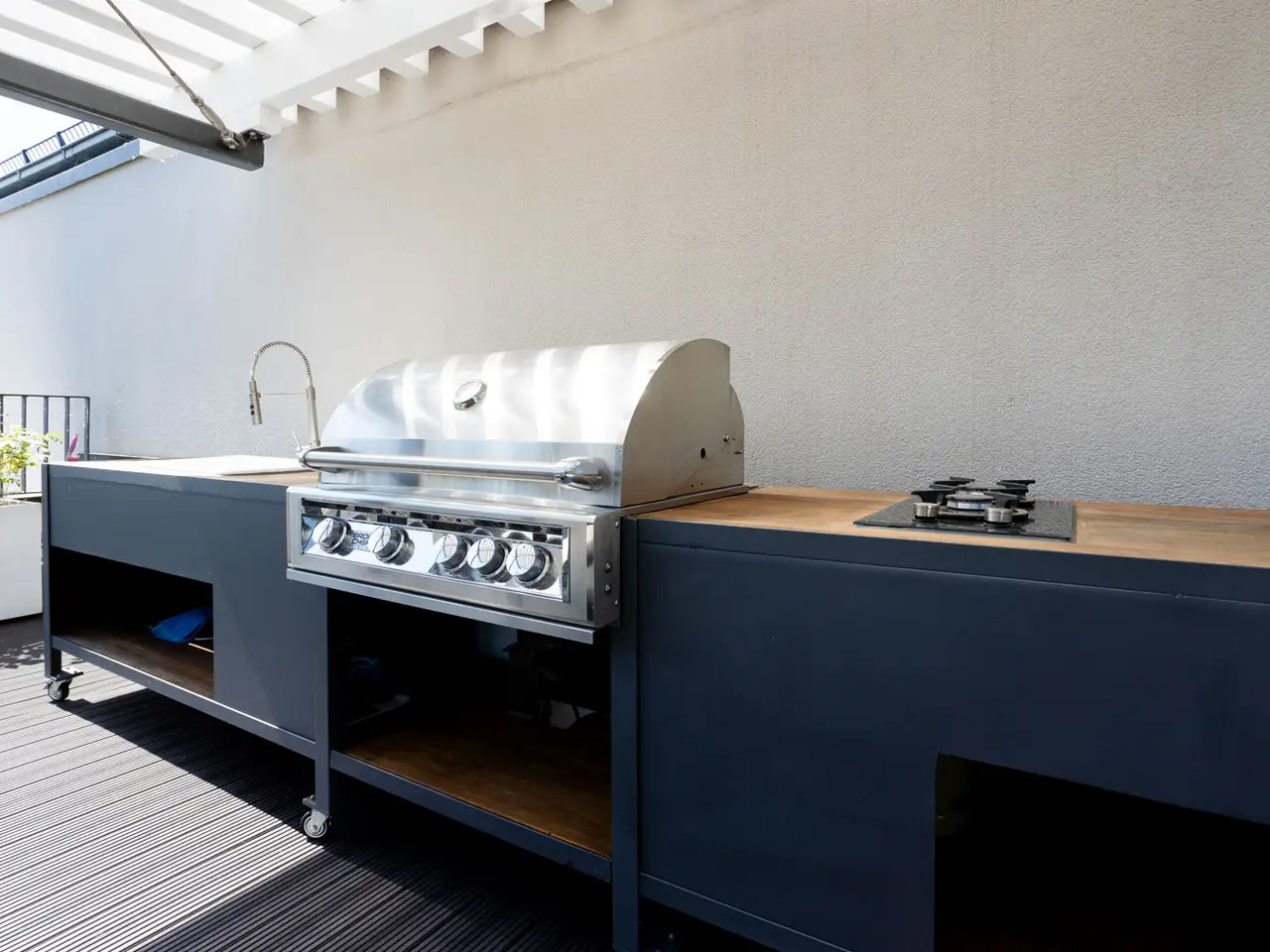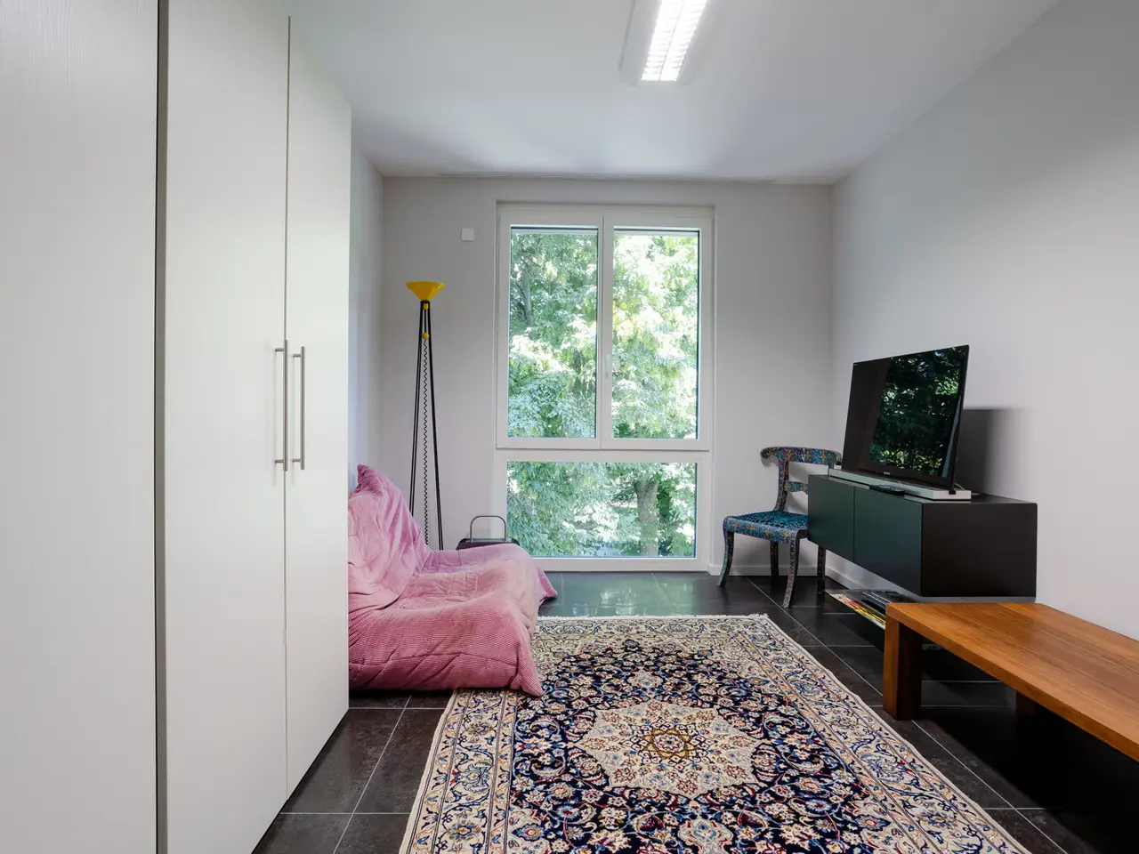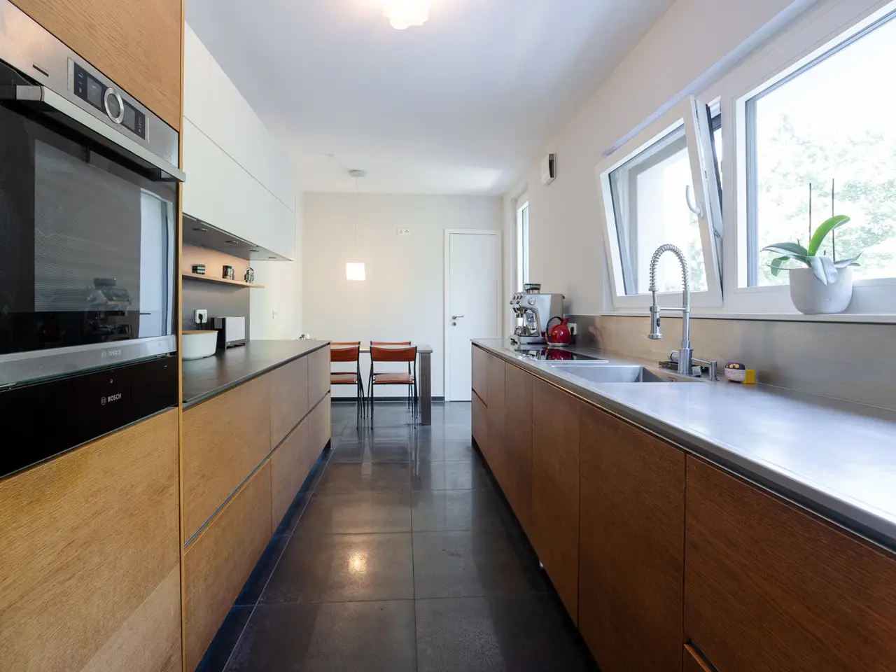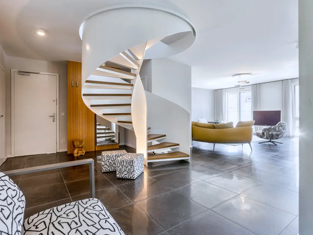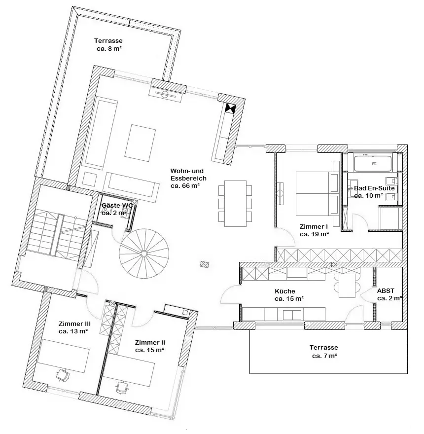 Quietly located in a cul-de-sac in charming, family-friendly Eschersheim, this exclusive penthouse maisonette reveals itself as a true residential gem. Spread over two levels and approximately 265 m² of living space, it combines architectural sophistication, well thought-out interior design and fittings that meet even the highest demands. As soon as you enter the apartment, you can sense the exceptional standards of design and quality. Spacious, light-flooded rooms with ceiling heights of up to 2.65 meters create a stylish, airy ambience. The combination of fine Swiss Bauwerk parquet flooring, large-format Italian design tiles from Fondovalle and smoothly plastered, partially white-painted and stylish exposed concrete walls and ceilings conveys modern elegance with timeless class. The open-plan living/dining area forms the heart of this property - with over 80 square meters of space, floor-to-ceiling windows with electric shutters and direct access to one of the three south-west-facing terraces. The stylish fitted kitchen with full-length stainless steel worktop, equipped with high-quality appliances from Miele and Bosch, blends seamlessly into the luxurious room concept, and from here you can also access the second terrace on this floor with a view of the greenery. On the upper floor, the panoramic roof terrace with an area of around 74 m² invites you to enjoy undisturbed moments with a breathtaking view of the greenery. An airy gallery, a total of five (bedrooms, study or children's) rooms, two exclusive bathrooms with natural light and sanitaryware from TOTO, Duravit and KLUDI, two separate guest WCs as well as several storage rooms and a utility room offer generous comfort for families, couples or individualists with a taste for the extraordinary. Another highlight is the fully integrated LOXONE smart home technology, which intelligently networks lighting, heating, blinds, audio and security - conveniently controllable via app or control element. Electric shutters, a decentralized ventilation system with heat recovery, underfloor heating and high-quality Gira colour video intercoms on each floor round off the first-class technical standard. The new build was designed as an energy-efficient KfW Efficiency House 55 - with sustainable thermal insulation, triple glazing, a solar-assisted heating system and solid masonry made from natural building materials. The offer is rounded off by two separate, spacious cellar rooms and an extra-wide garage parking space (double parking space) right next to the house. This penthouse maisonette stands for uncompromising living comfort, maximum privacy and an aesthetic quality that is rarely found - a real statement for stylish living in the north of Frankfurt.
