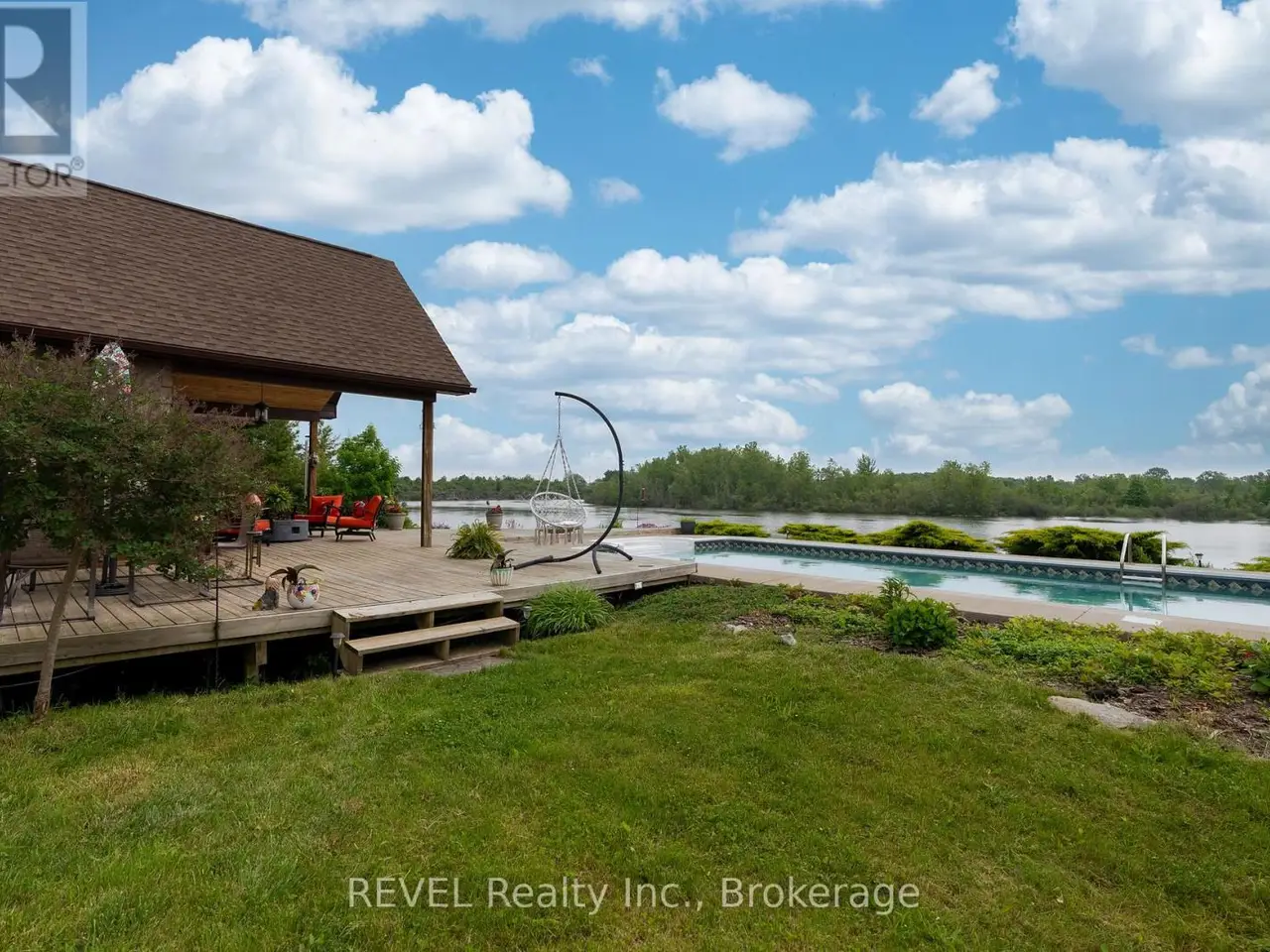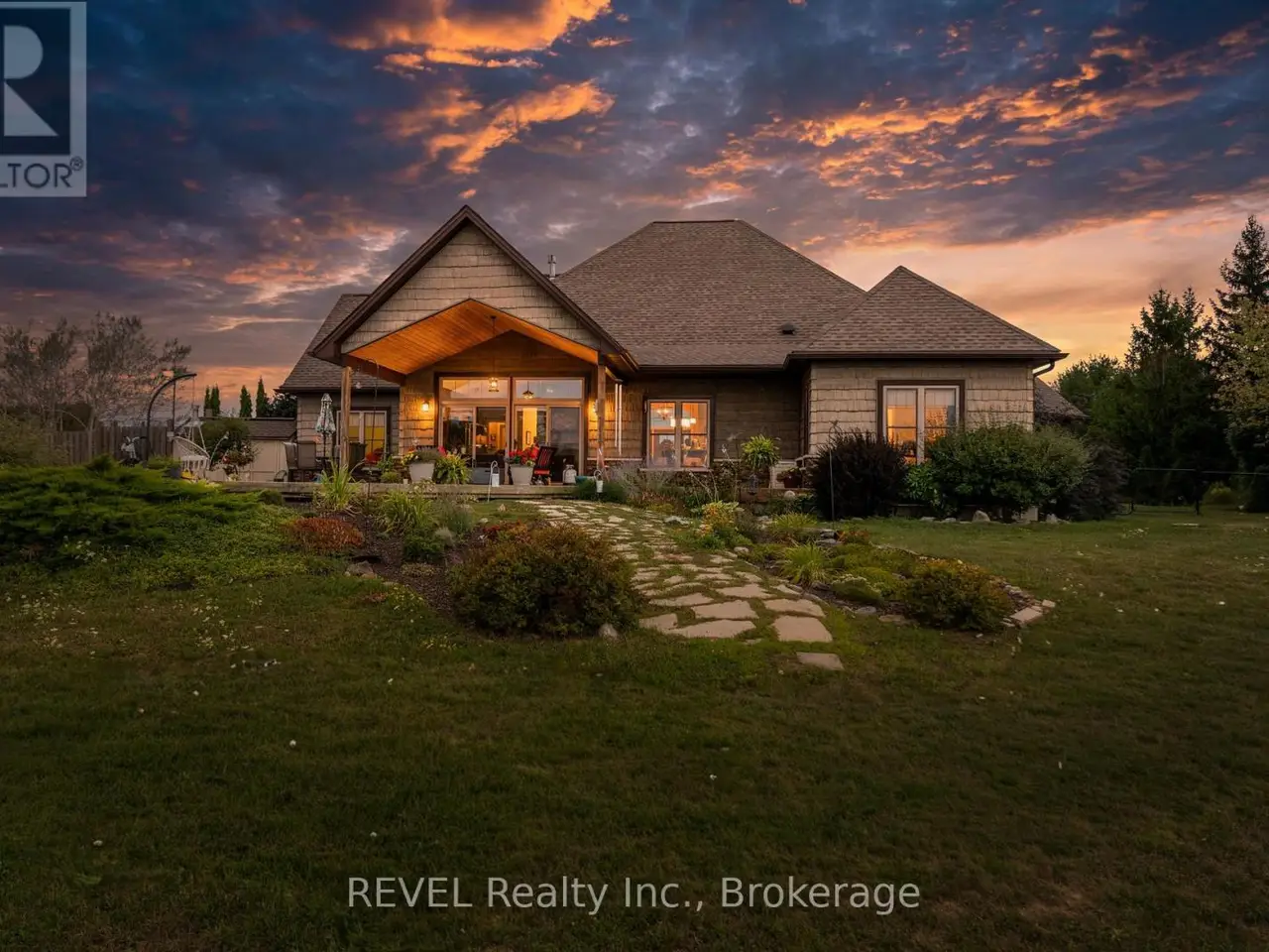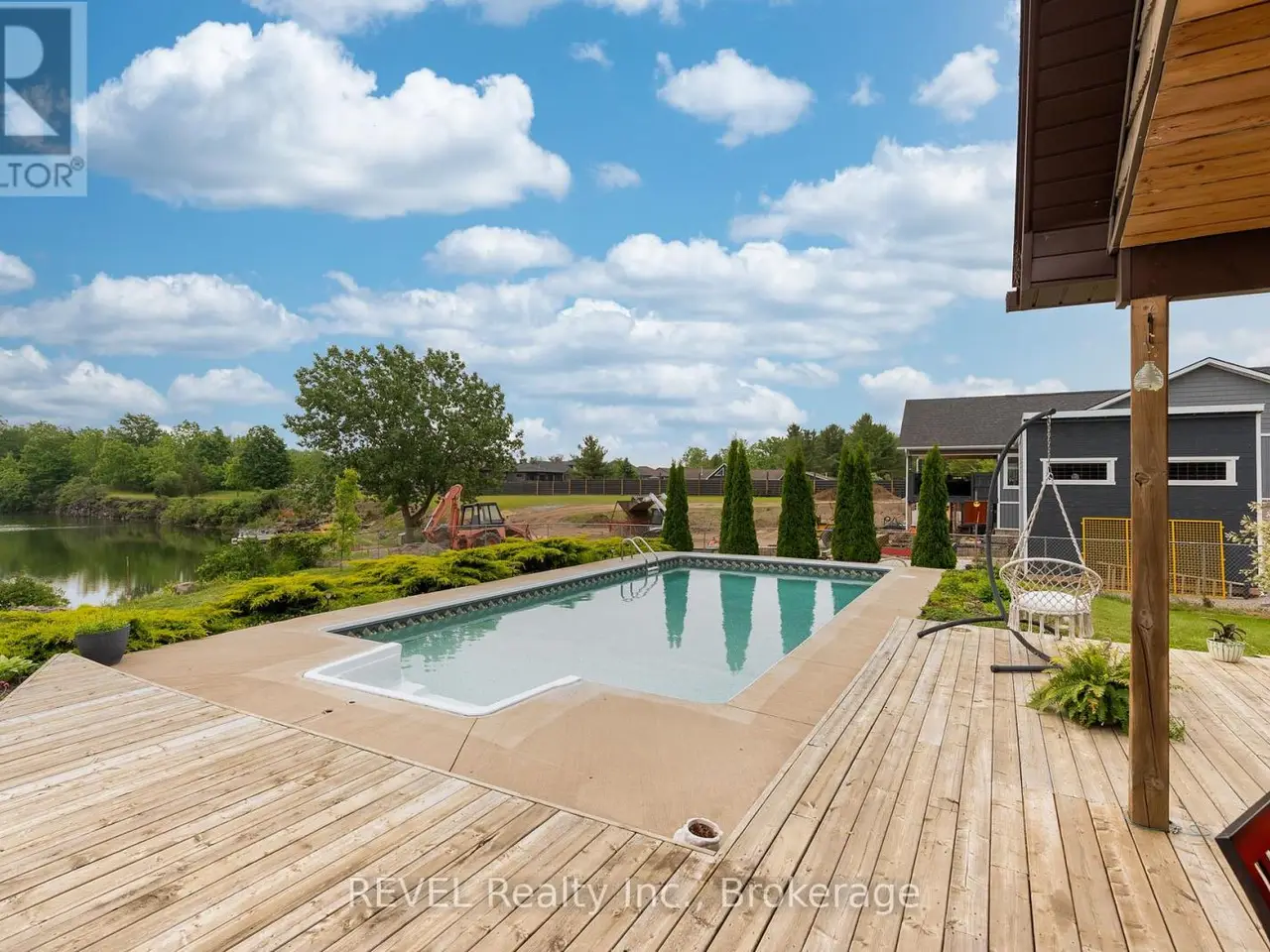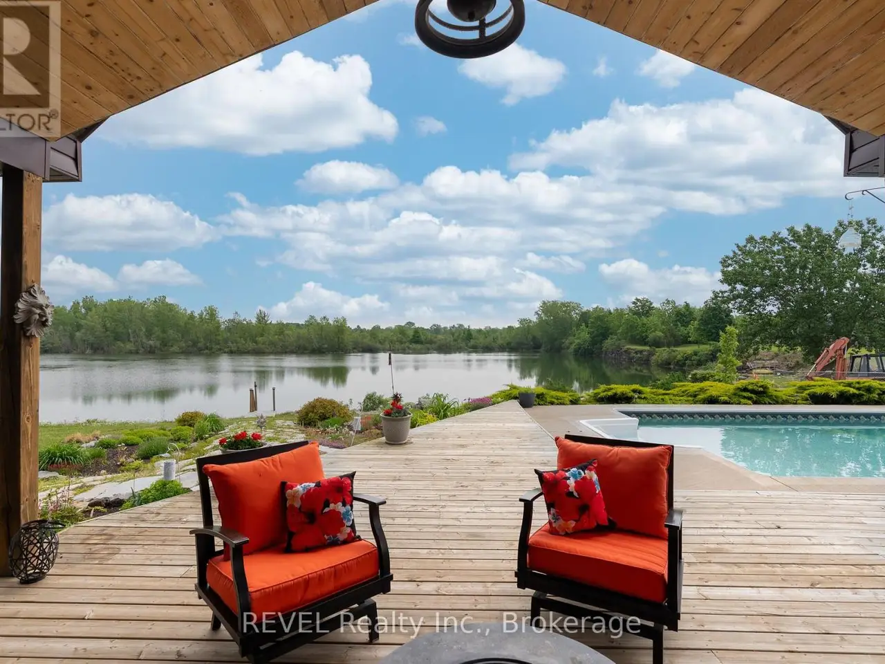 Located just outside the City of Port Colborne with sweeping Wainfleet views, this beautifully appointed bungalow backs onto the serene Port Colborne Quarry Pond and includes .5 acres of owned underwater land, offering an unmatched setting for water recreation and peaceful living. The home blends cottage charm with modern comfort, featuring four bedrooms and two bathrooms, including a private primary suite overlooking the pond with a luxurious 5-piece ensuite boasting a tile walk-in shower, soaker tub, and walk-in closet. The open-concept main floor is designed for both relaxation and entertaining, with vaulted ceilings in the living room, a striking stone gas fireplace, and large windows that frame the stunning quarry views. The kitchen is well-equipped with quartz countertops, a large island with bartop seating, stainless steel appliances, and a generous pantry, flowing seamlessly into the living and dining areas with rich hardwood flooring and real wood doors throughout. Two additional main-floor bedrooms, a full 4-piece bathroom, and an office that can serve as a fourth bedroom provide ample space for family or guests. A large covered rear deck with a vaulted roof extends your living space outdoors, overlooking an eight-year-old inground pool with a new pump and filter ideal for summer enjoyment. Additional highlights include a main-floor laundry room, an extra-large attached two-car garage, a 35x40-foot detached shop with full vehicle lift and air compressor, and a 5-foot height unfinished basement for storage. With a cistern water supply and a location that offers a true Muskoka-like experience just minutes from all local amenities, this home delivers the ultimate blend of lifestyle, privacy, and practicality.