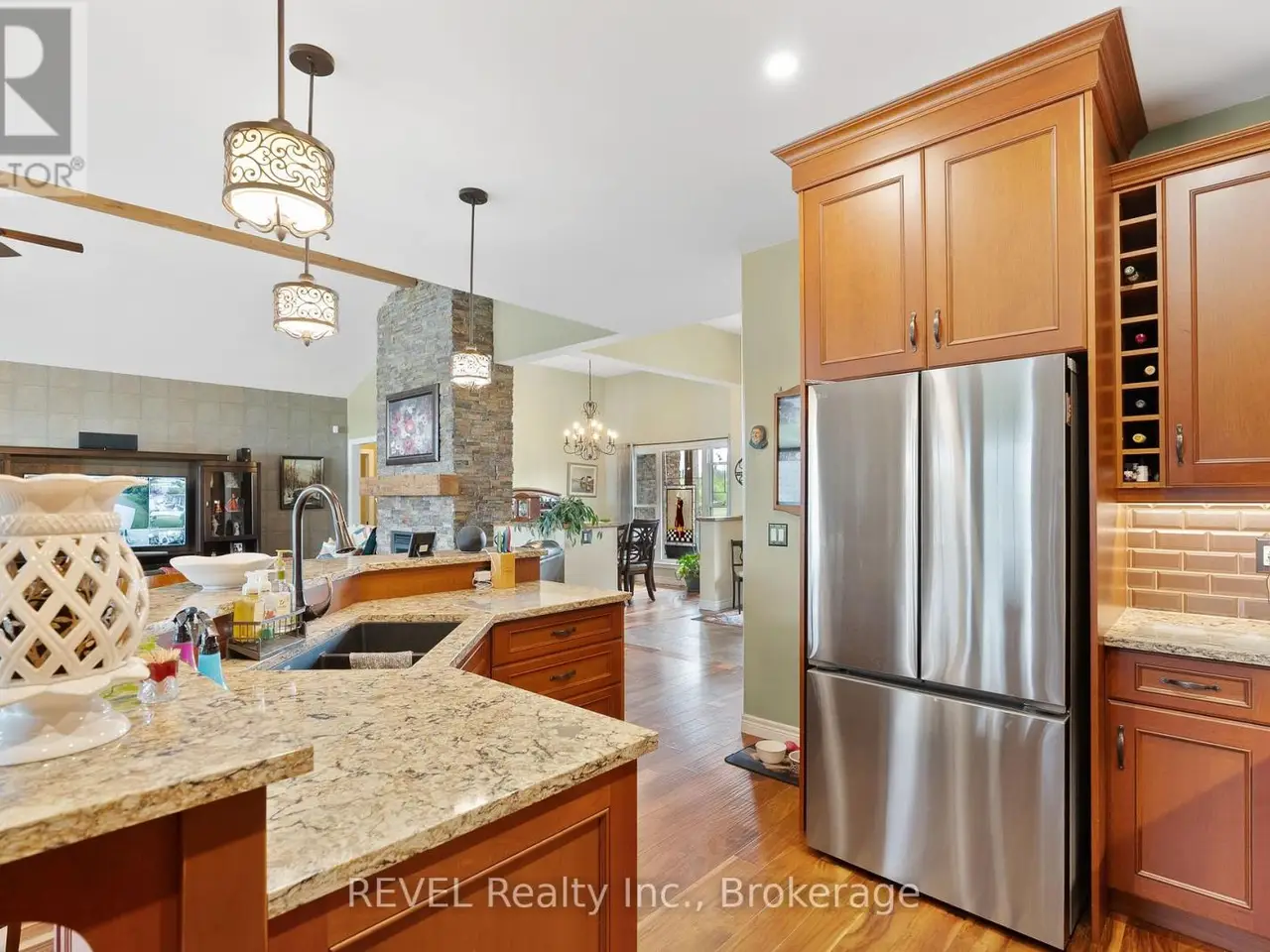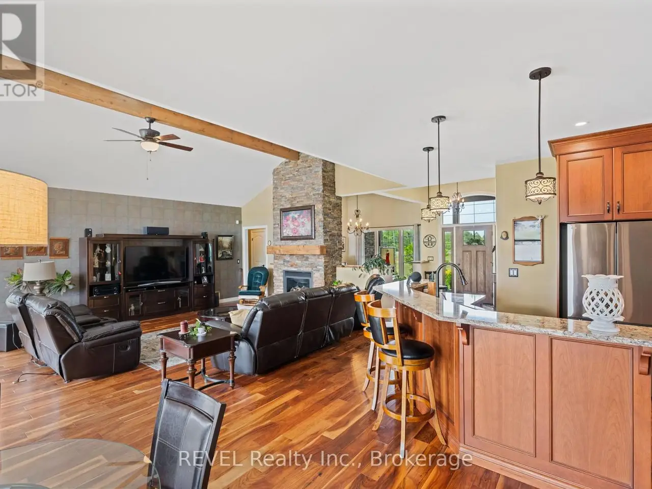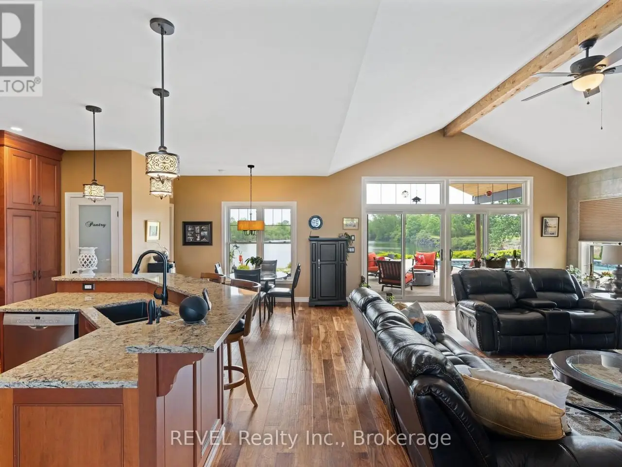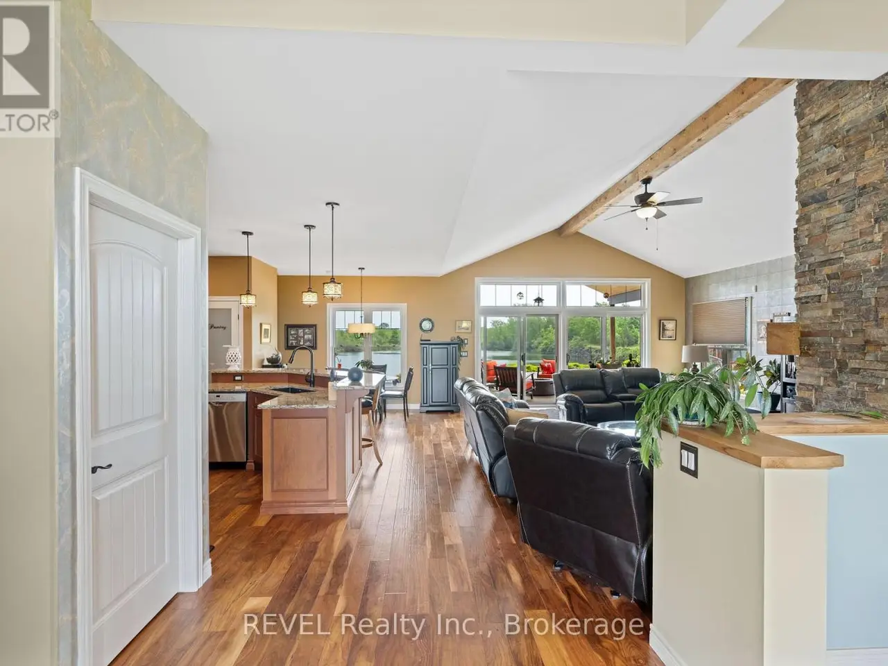 Located just outside the City of Port Colborne with sweeping Wainfleet views, this beautifully appointed bungalow backs onto the serene Port Colborne Quarry Pond and includes .5 acres of owned underwater land, offering an unmatched setting for water recreation and peaceful living. The home blends cottage charm with modern comfort, featuring four bedrooms and two bathrooms, including a private primary suite overlooking the pond with a luxurious 5-piece ensuite boasting a tile walk-in shower, soaker tub, and walk-in closet. The open-concept main floor is designed for both relaxation and entertaining, with vaulted ceilings in the living room, a striking stone gas fireplace, and large windows that frame the stunning quarry views. The kitchen is well-equipped with quartz countertops, a large island with bartop seating, stainless steel appliances, and a generous pantry, flowing seamlessly into the living and dining areas with rich hardwood flooring and real wood doors throughout. Two additional main-floor bedrooms, a full 4-piece bathroom, and an office that can serve as a fourth bedroom provide ample space for family or guests. A large covered rear deck with a vaulted roof extends your living space outdoors, overlooking an eight-year-old inground pool with a new pump and filter ideal for summer enjoyment. Additional highlights include a main-floor laundry room, an extra-large attached two-car garage, a 35x40-foot detached shop with full vehicle lift and air compressor, and a 5-foot height unfinished basement for storage. With a cistern water supply and a location that offers a true Muskoka-like experience just minutes from all local amenities, this home delivers the ultimate blend of lifestyle, privacy, and practicality.