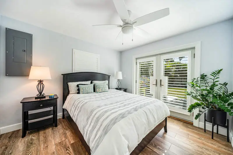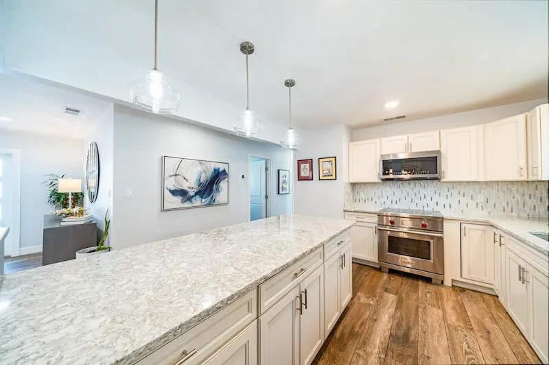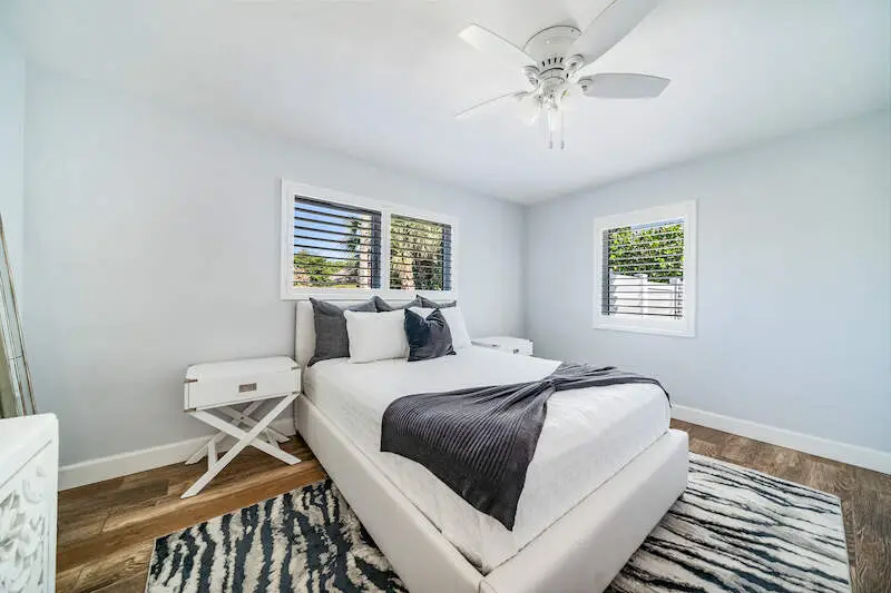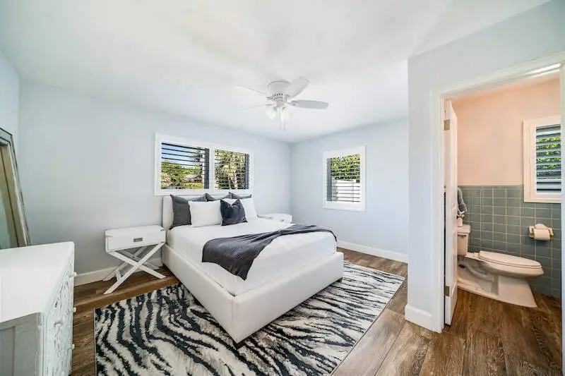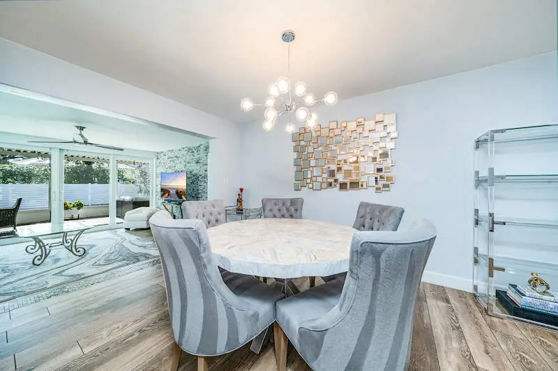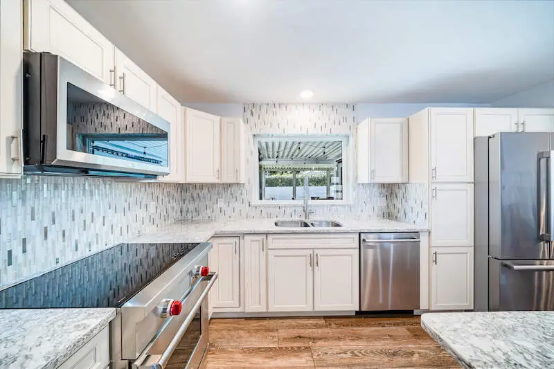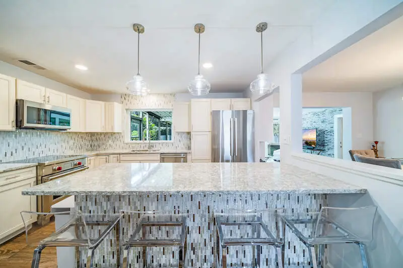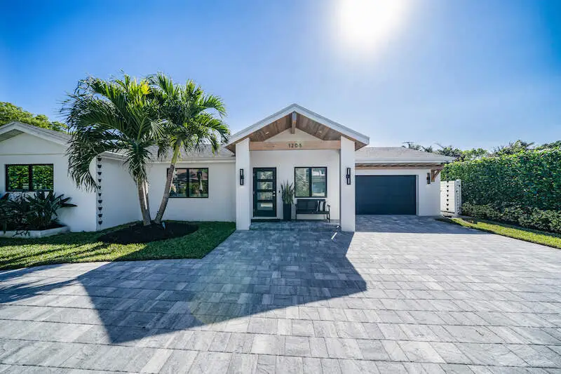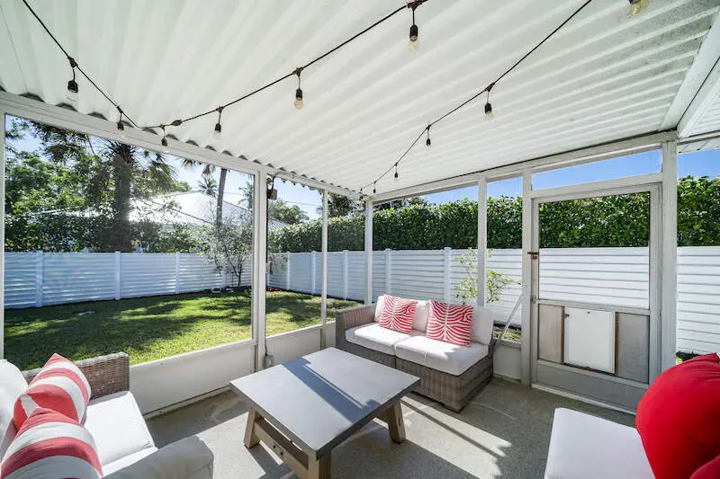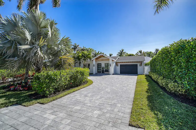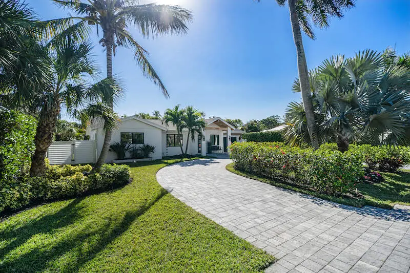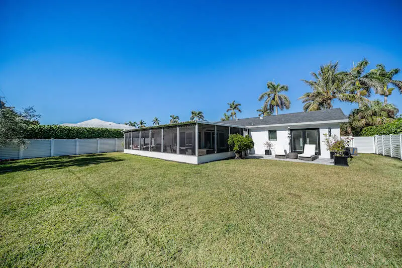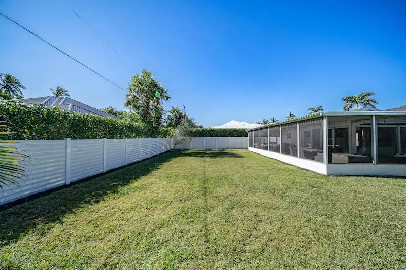 Gorgeous curb appeal!! This absolutely charming 3-bedroom, 2-bath ranch-style home in the desirable Lake Park neighborhood boasts stunning curb appeal with a freshly painted white exterior, bold black trim, main roof is asphalt shingles, metal lanai roof, and tasteful wood detailing accents. The inviting front porch, new light fixtures, and paver driveway with governors circle driveway for extra cars enhance the welcoming aesthetic. The beautifully landscaped yard is framed by newer white PVC privacy fencing and a gated rear yard. Decorative metal rain gutter downspouts add a touch of sophistication, creating a Santa Barbara-inspired exterior that feels crisp and contemporary. Inside, the open-concept layout is modernized with seamless "wood-look" tile plank flooring throughout, the kitchen features lighter creamy cabinetry, a tiled backsplash, breakfast bar, and high-end appliances including a WOLF electric cooktop and oven, BOSCH dishwasher, and French door refrigerator/freezer. The owner's suite offers an en-suite bath and dual closets, while the guest suite opens to a paver patio overlooking the private backyard. The renovated guest bathroom includes white tiled shower walls accented with mosaic bands, a floating double-sink vanity, and extra storage. A glass-enclosed family room with tile plank floors, a stone accent wall, and a ceiling fan provides additional living space, while the screen-enclosed porch with epoxy flooring and string lights is perfect for relaxing or entertaining. The oversized 1.5 garage features built-in storage rack and the enclosed laundry room is equipped with Samsung front-loading washer and dryer. With its lushly landscaped and private backyard, proximity to top-rated schools, trendy restaurants, and Naples' sunny beaches, this home offers a perfect blend of classic charm and modern living in a highly sought-after walking community.