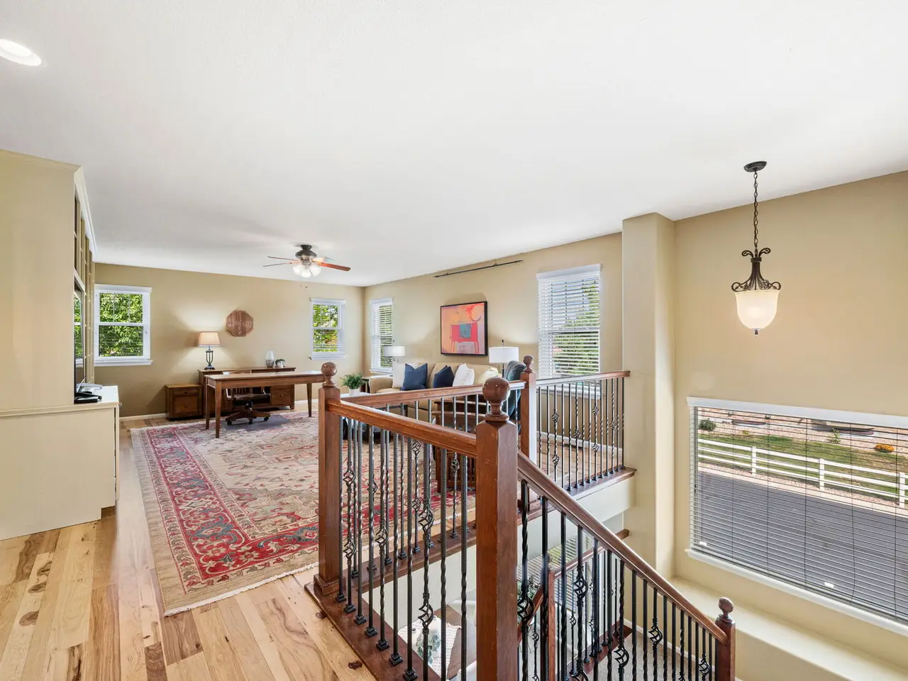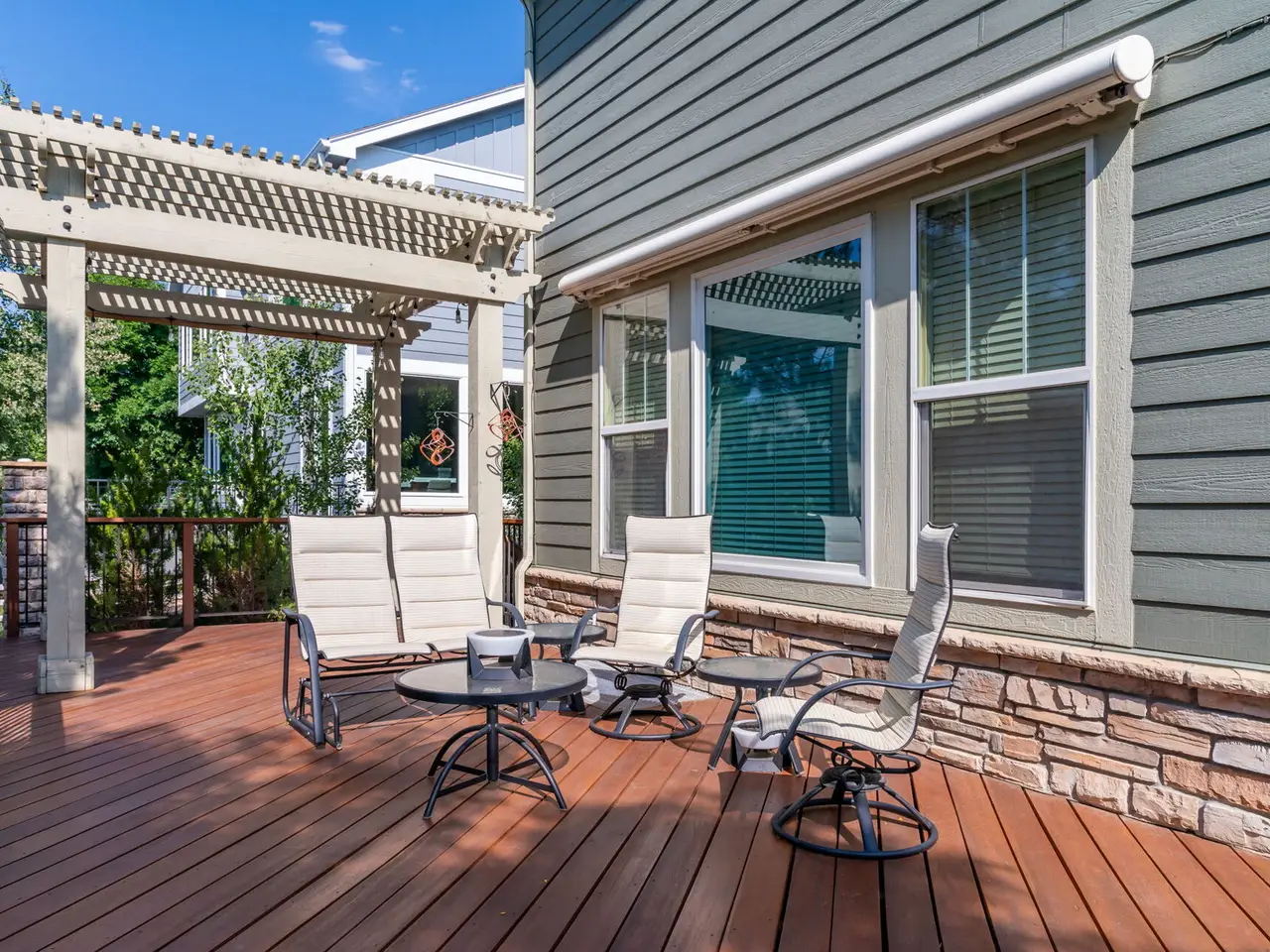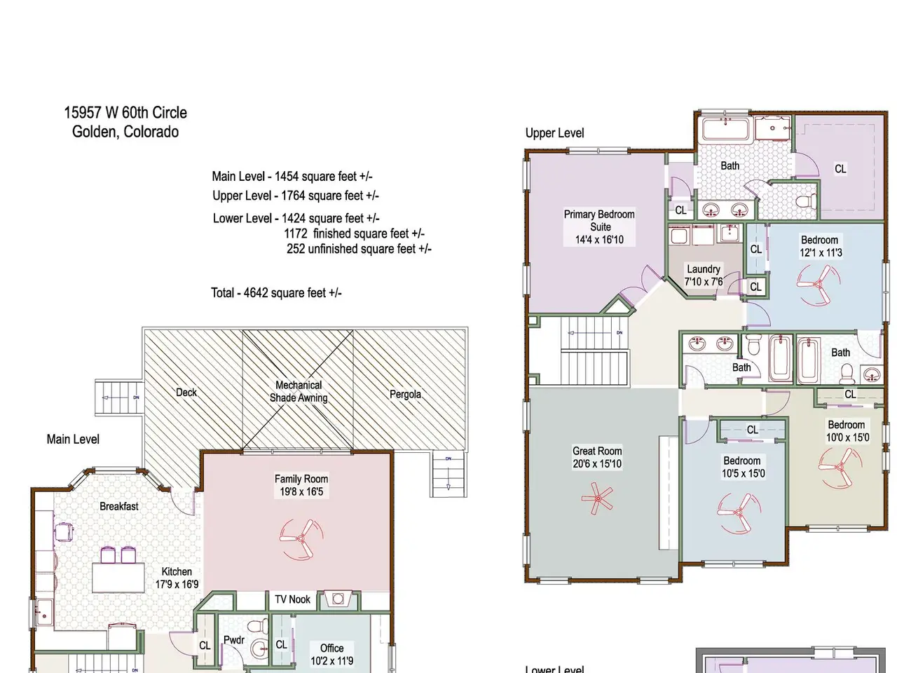 Fabulous corner-lot home in highly desirable Ryan Ranch, with stunning views of Table Mountain and the Rockies! Step inside to an open, light-filled floor plan featuring a gourmet kitchen with granite countertops, a large center island with seating, stainless steel appliances, and rich cherry wood cabinets. Hardwood floors flow throughout the main level, connecting the spacious family room, formal living and dining rooms, and a private main-floor study. Enjoy year-round outdoor living on the expansive mahogany deck with a covered pergola and powered shade awning. The private backyard is fully fenced, beautifully landscaped with mature plantings, and perfect for pets. A 3-car garage includes newer polyurea flooring plus upgraded storage. Upstairs, you'll find a large great room with hardwood floors, custom floor-to-ceiling bookshelves, generous bedrooms, and soaring ceilings. The professionally finished garden-level basement offers incredible flexibility with a convenience bar, recreation room with pool table, fitness area, large bedroom, full bath, and a spacious storage room. This home offers endless gathering spaces-including a family room, great room, loft, and entertainment areas-making it perfect for both everyday living and hosting. Recent upgrades include outdoor lighting, kitchen counters and cooktop, new mahogany deck, pergola, powered awning, new windows in kitchen and dens, ceiling fan and whole house fan, Generac whole-house generator, new carpet, and more. Ideally located on the Golden/Arvada border, this home is just steps from two recreation centers, shopping, and offers easy access to both downtown Denver and the mountains. With no neighbors on three sides, privacy abounds. The HOA covers common area maintenance, trash, fencing, and snow removal for truly low-maintenance living. This one-of-a-kind home is ready to impress-schedule your showing today!